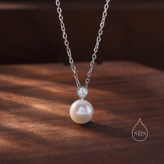 Natural Pearl and CZ Bezel Necklace in Sterling Silver, Silver or Gold or Rose Gold, Genuine Freshwater Pearl Pendant Necklace