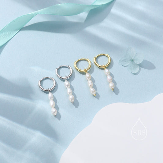 Natural Oval Pearl Trio Long Dangle Huggie Hoop Earrings in Sterling Silver, Silver or Gold or Rose Gold, Genuine Freshwater Pearls