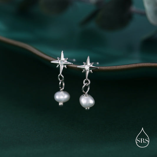 Starburst Star with Dangling Baroque Pearl Drop Earrings in Sterling Silver, Keshi Pearl Earrings, Genuine Freshwater Pearls