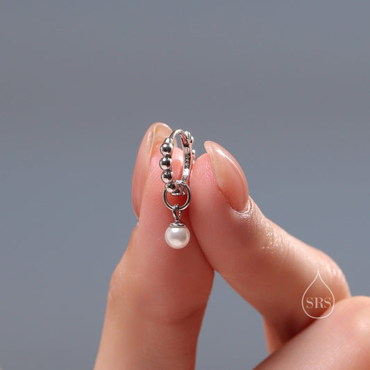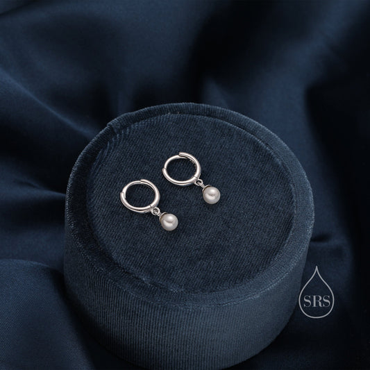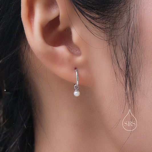 Tiny Dangle Pearl Huggie Hoops Earrings in Sterling Silver, , Genuine Freshwater Pearls, Silver or Gold, Minimalist Simple Hoop Earrings