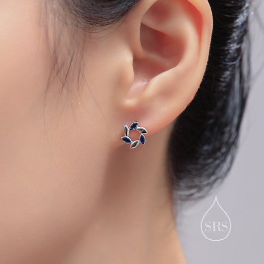 Sterling Silver Wreath Stud Earrings with Sapphire Blue CZ- Silver or Gold, CZ Circle Flower Stud Earrings, Wedding, Bridal Jewellery