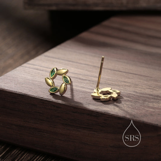 Sterling Silver Wreath Stud Earrings with Emerald Green CZ- Silver or Gold, CZ Circle Flower Stud Earrings, Wedding, Bridal Jewellery