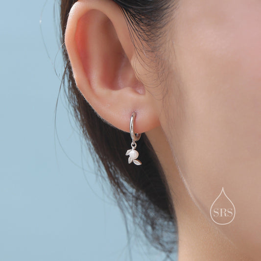 Tiny Leaf and Natural Pearl Huggie Hoop Earrings in Sterling Silver, Silver or Gold or Rose Gold, Genuine Freshwater Pearl Leaf Hoops