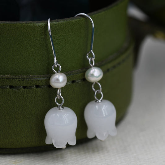 Carved Jade Lily of the valley Earrings in Sterling Silver with Natural Freshwater Pearls, Genuine Jade Flower Dangle Earrings,