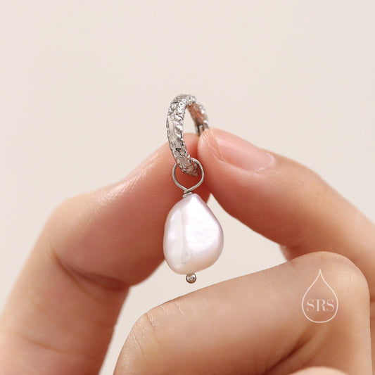 Baroque Pearl with Skinny Hammered Hoop Earrings in Sterling Silver, Detachable Pearl Hoop Earrings, Pearl Huggie Hoops, Keshi Pearls