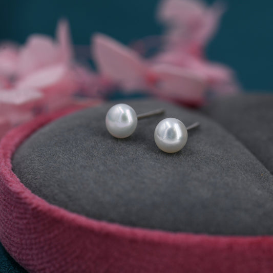 Genuine Pearl Stud Earrings in Sterling Silver, 5mm - 8mm, Small Pearl Stud and Large Pearl Stud, Silver pearl Earrings,