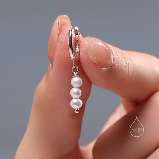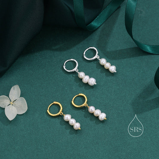 Genuine Freshwater Pearl Trio Huggie Hoop Earrings in Sterling Silver, Silver or Gold, Dainty Three Pearl Cluster Dangle Earrings