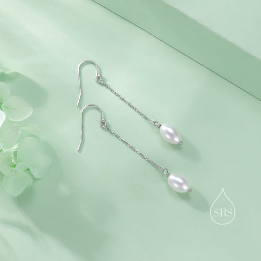 Genuine Freshwater Pearl V Shape Long Drop Hook Earrings in Sterling Silver, Delicate Oval Pearl Earrings, Genuine Pearl Drop Earrings