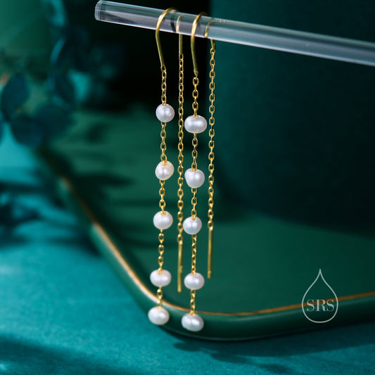 Genuine Freshwater Pearl Trio Drop Earrings in Sterling Silver, Delicate Oval Pearl Cascade Dangle Earrings, Silver or Gold