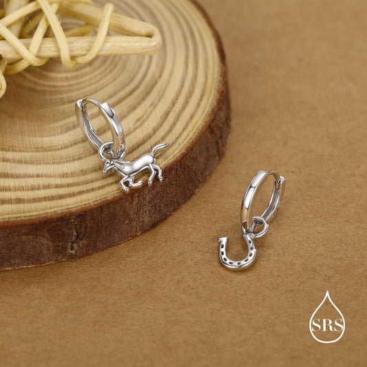 Mismatched Horse and Horseshoe Huggie Hoops in Sterling Silver, Silver or Gold or Rose Gold, Detachable Horse and Horse Shoe Hoop Earrings