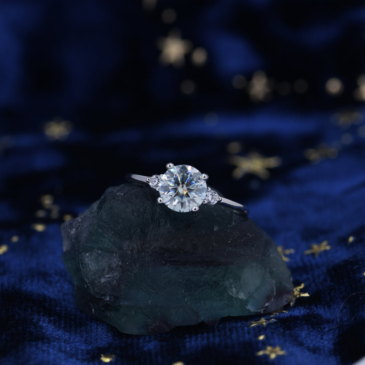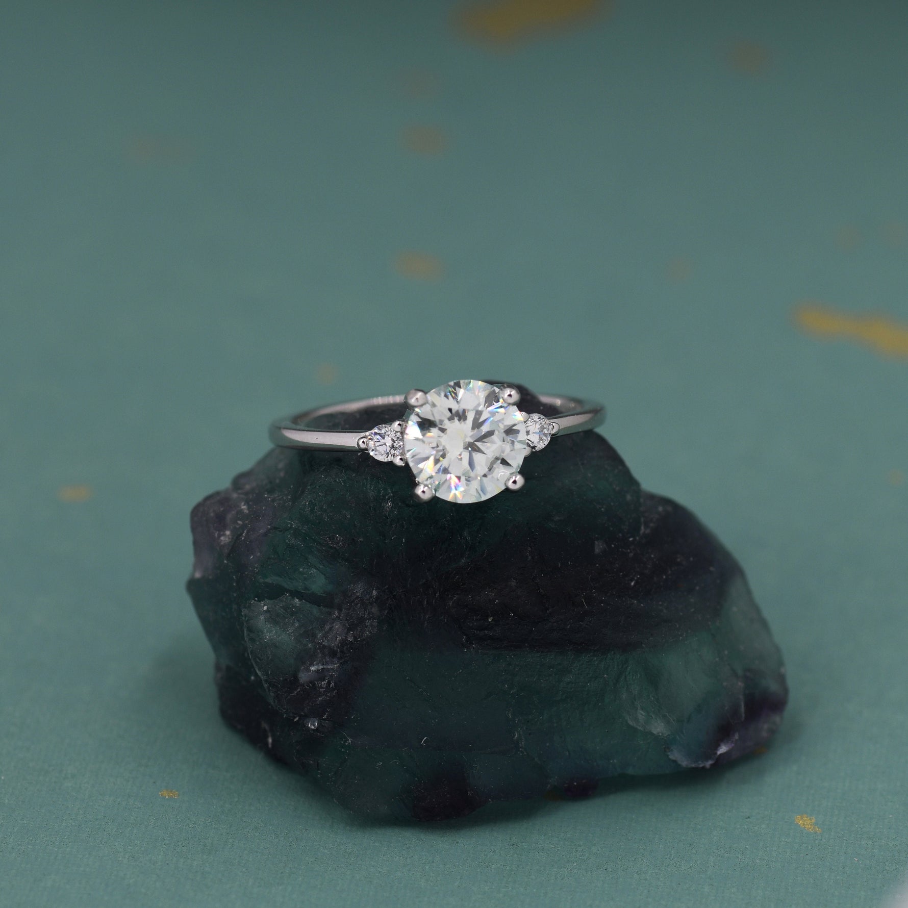 The main stone is a blue based moissanite and the side stones are ultra clear top grade cubic zirconia.