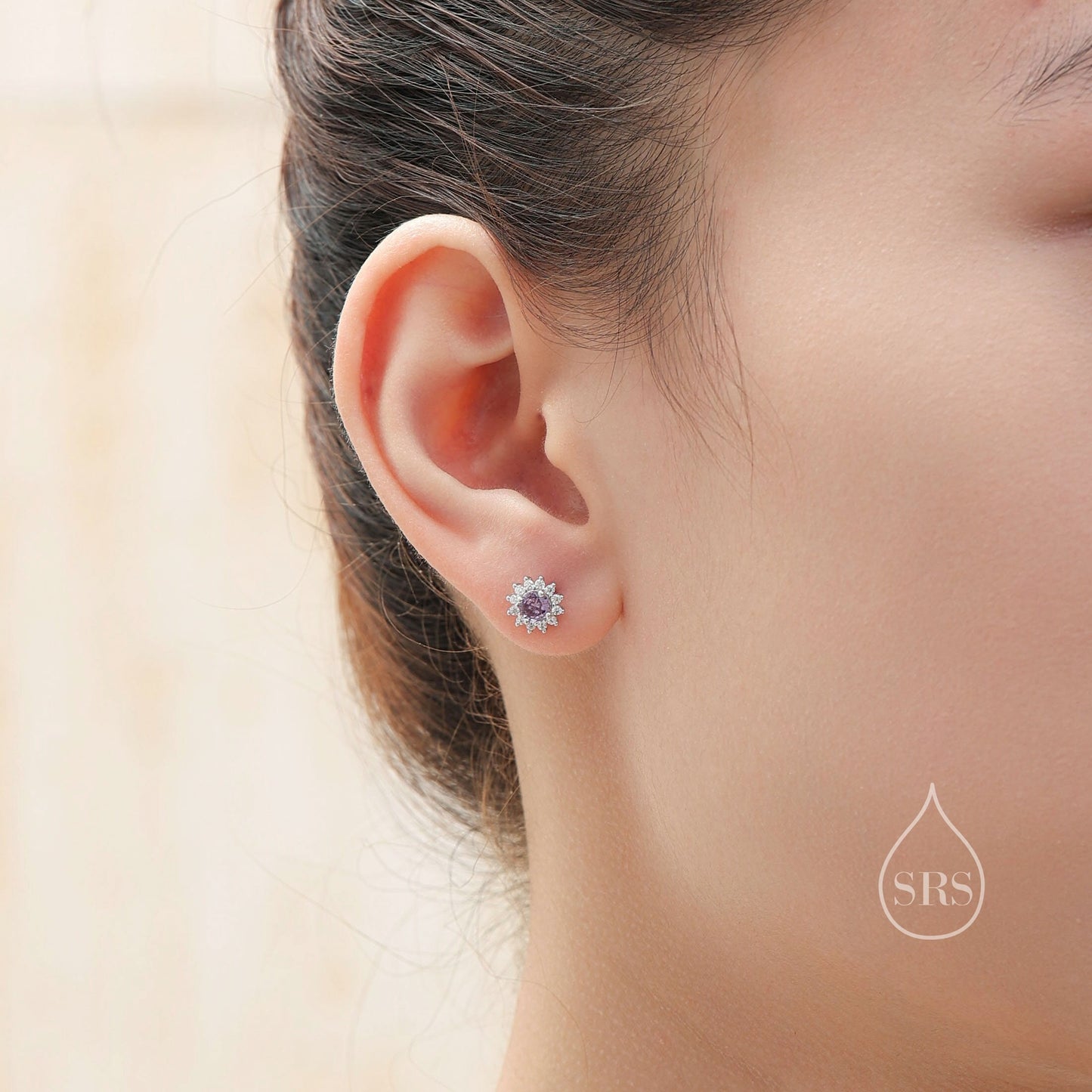 Amethyst Purple CZ Halo Stud Earrings in Sterling Silver, Silver or Gold, February Birthstone Earrings, Flower CZ Earrings