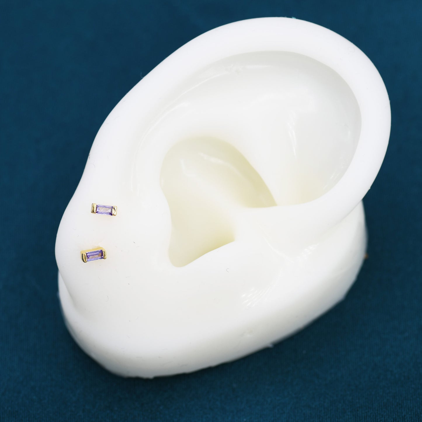 Amethyst Purple Tiny Baguette CZ Stud Earrings in Sterling Silver, Silver or Gold, Geometric Tiny CZ Earrings, Stacking Earrings