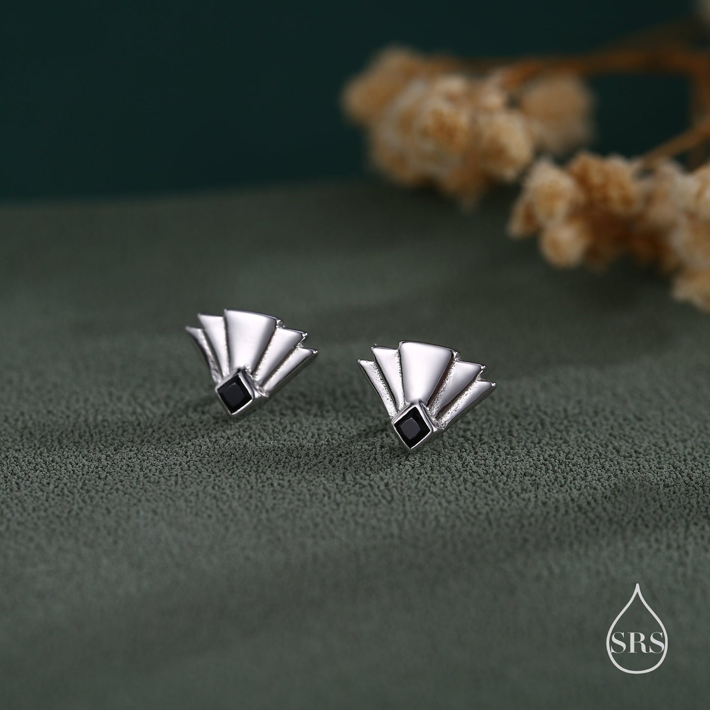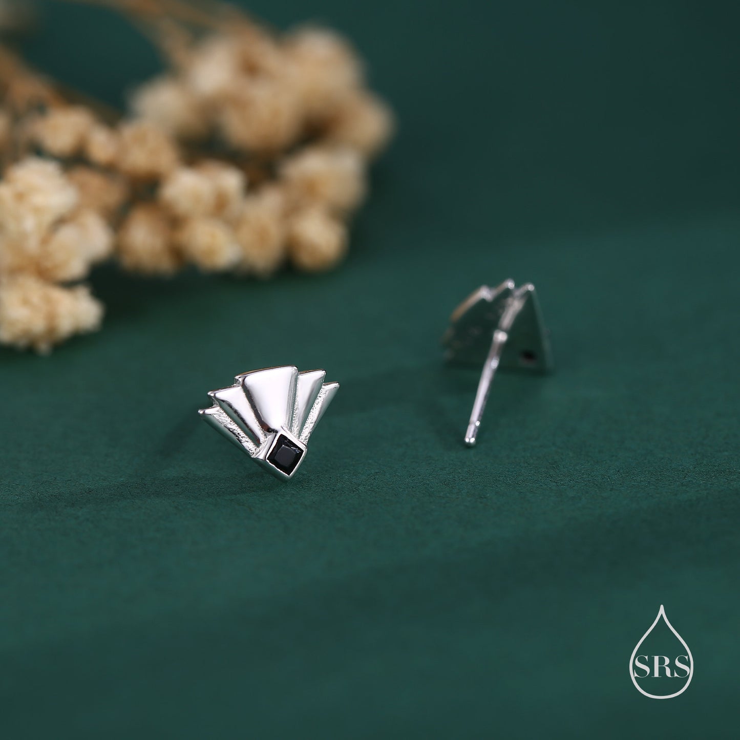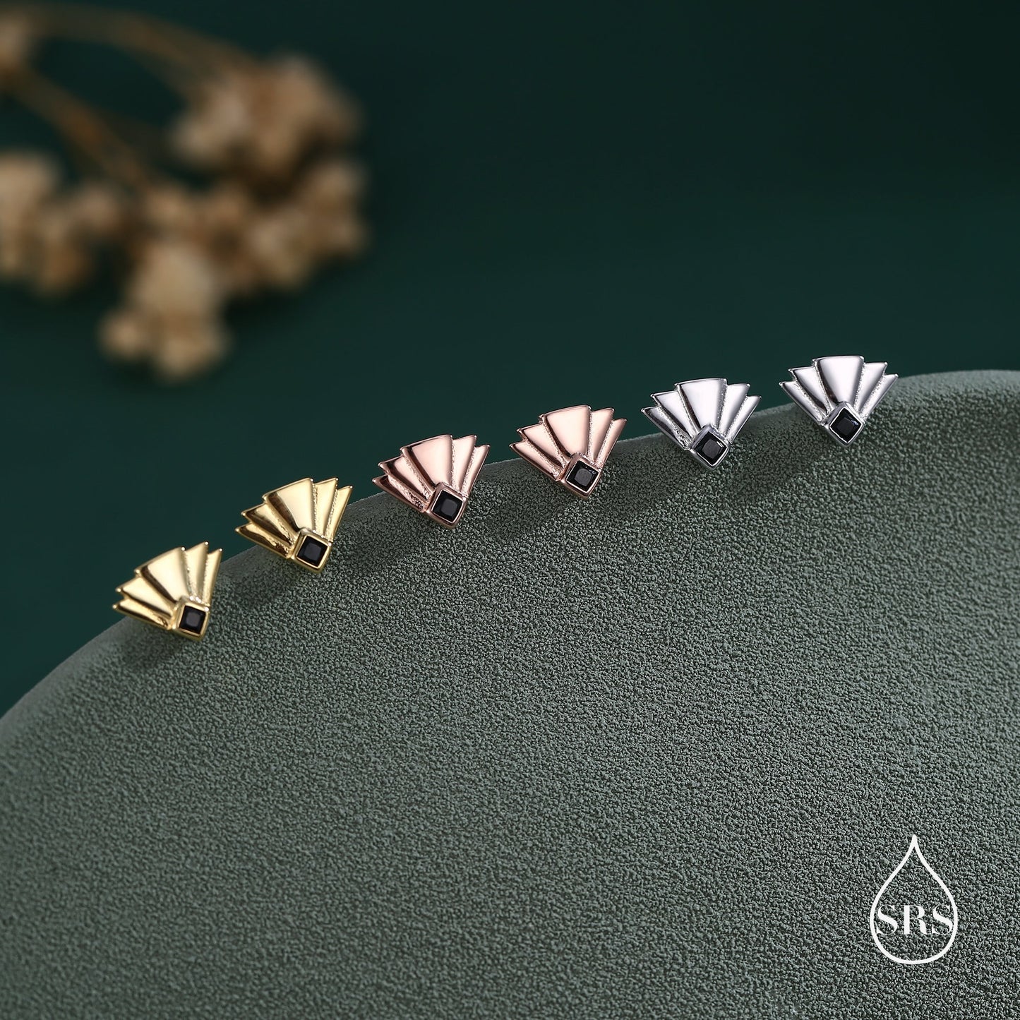 Art Deco Inspired Small Sun Ray Stud Earrings in Sterling Silver, Black or clear CZ, Silver or Gold or Rose Gold, Tiny Art Deco Style Earrings