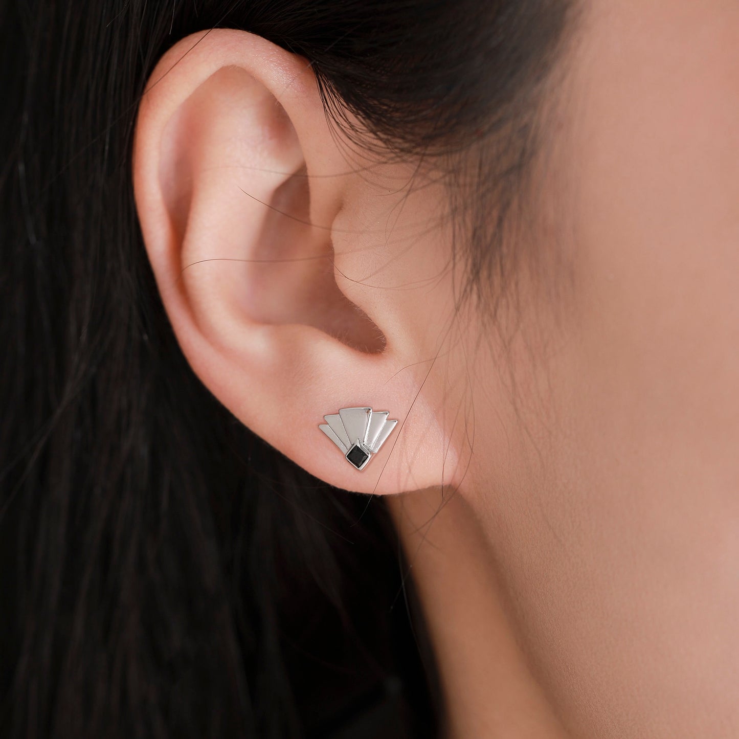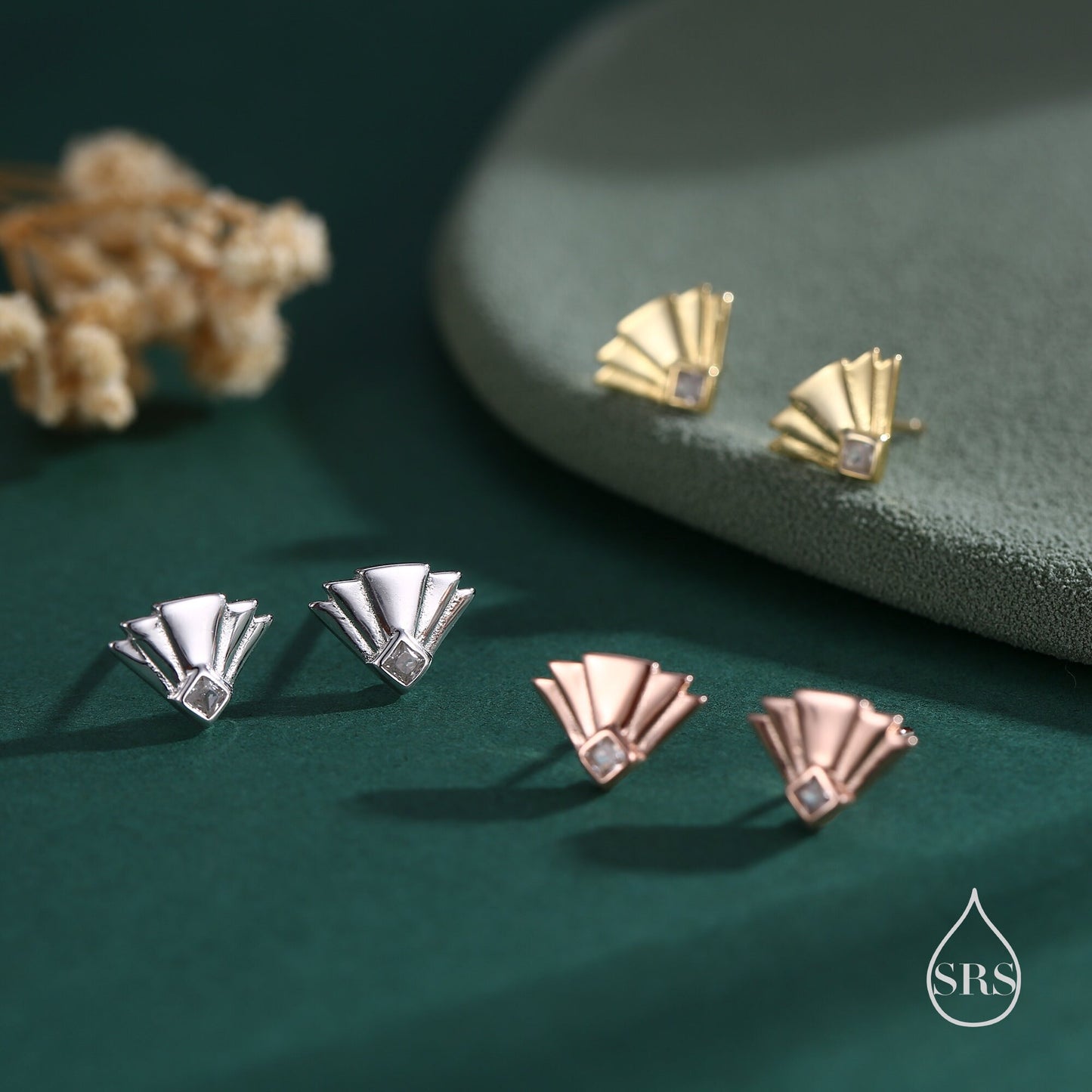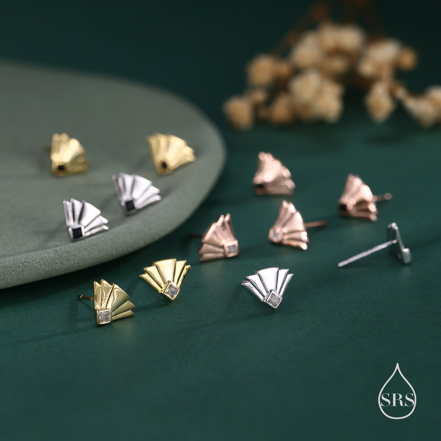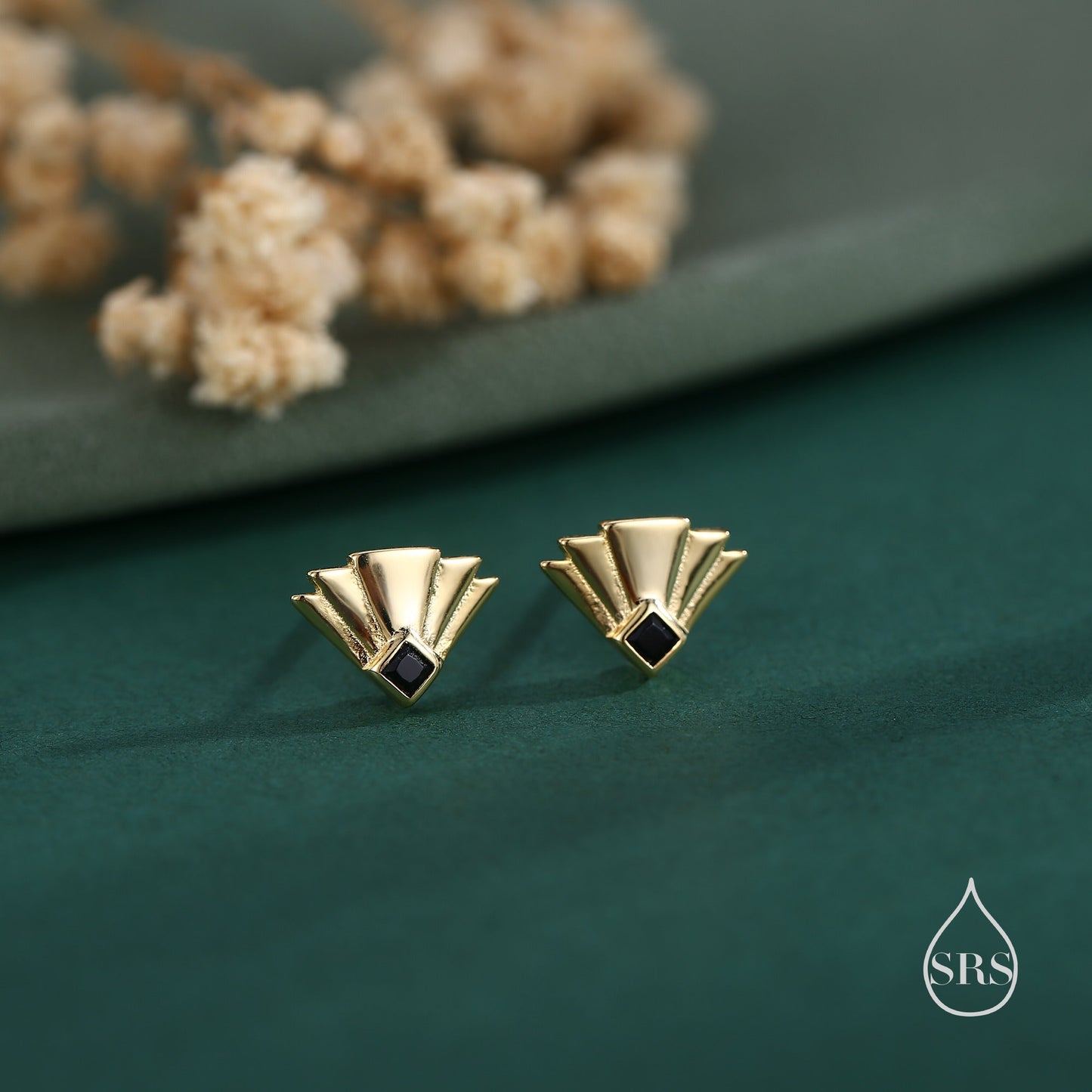 Art Deco Inspired Small Sun Ray Stud Earrings in Sterling Silver, Black or clear CZ, Silver or Gold or Rose Gold, Tiny Art Deco Style Earrings