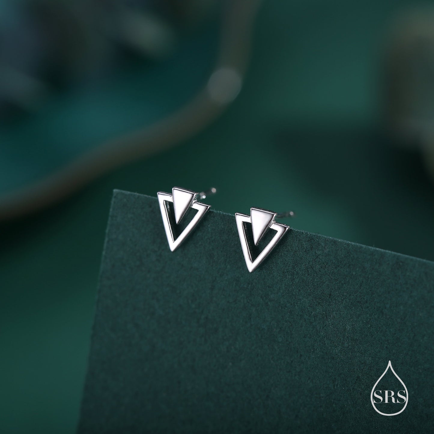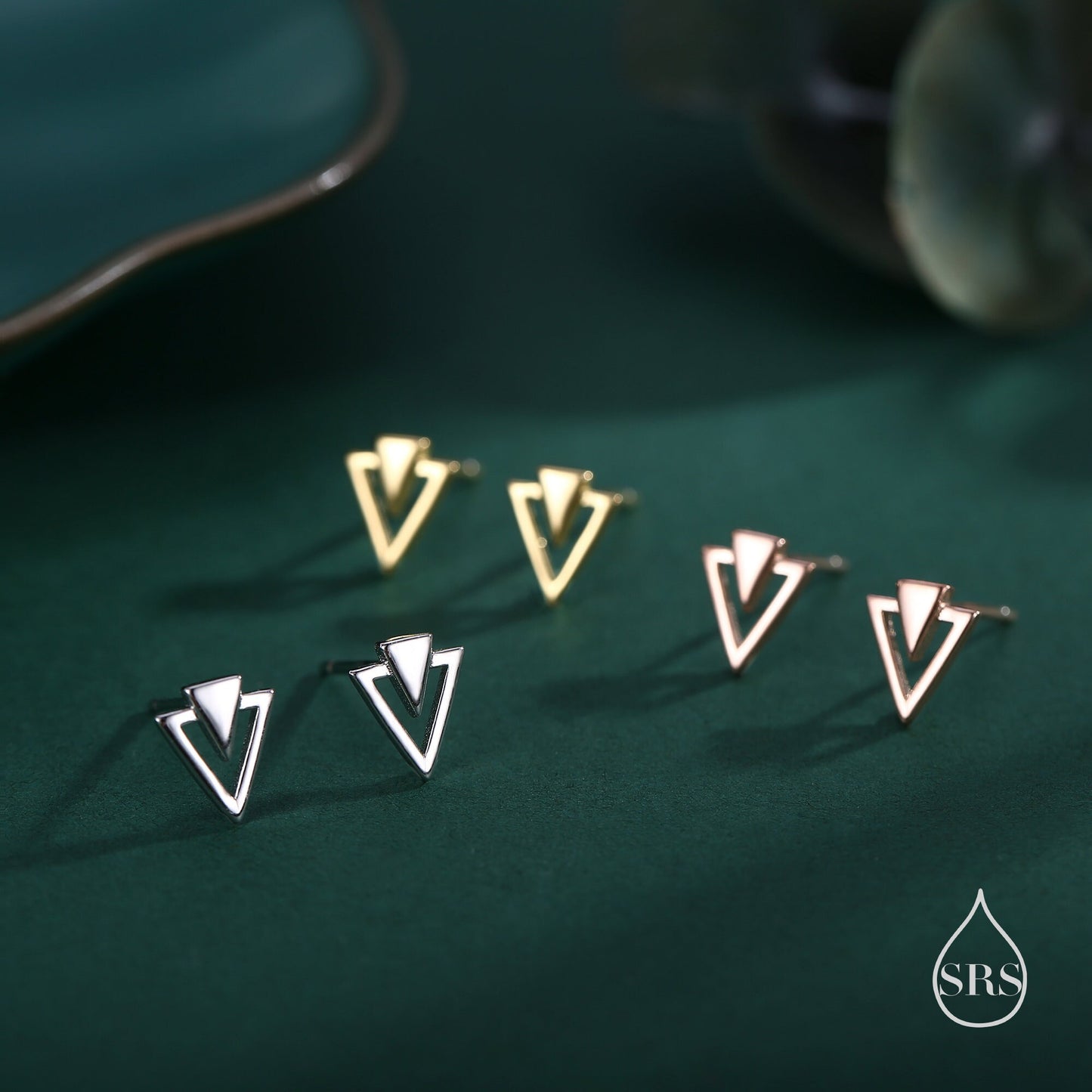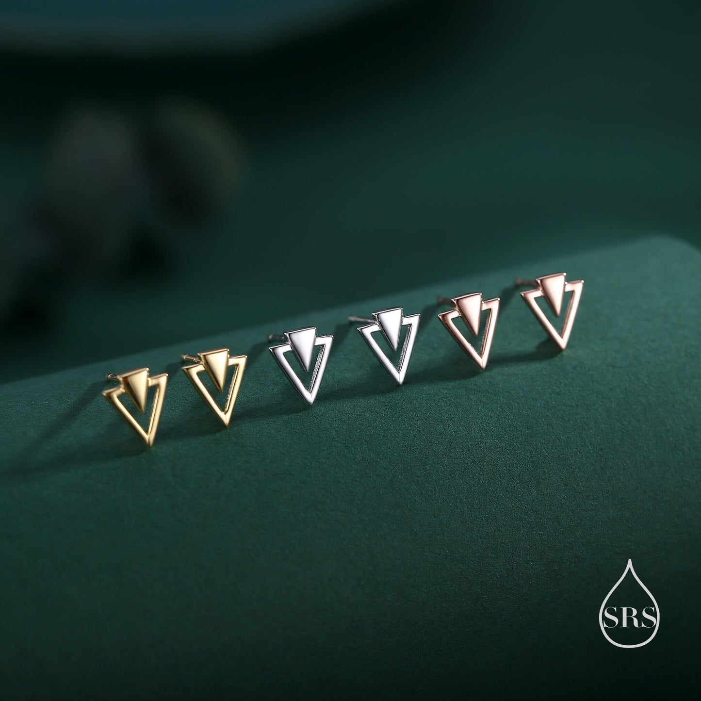 Art Deco Style Tiny Double Triangle Stud Earrings in Sterling Silver, Silver or Gold or Rose Gold, Cut Out Triangle Jacket Earrings