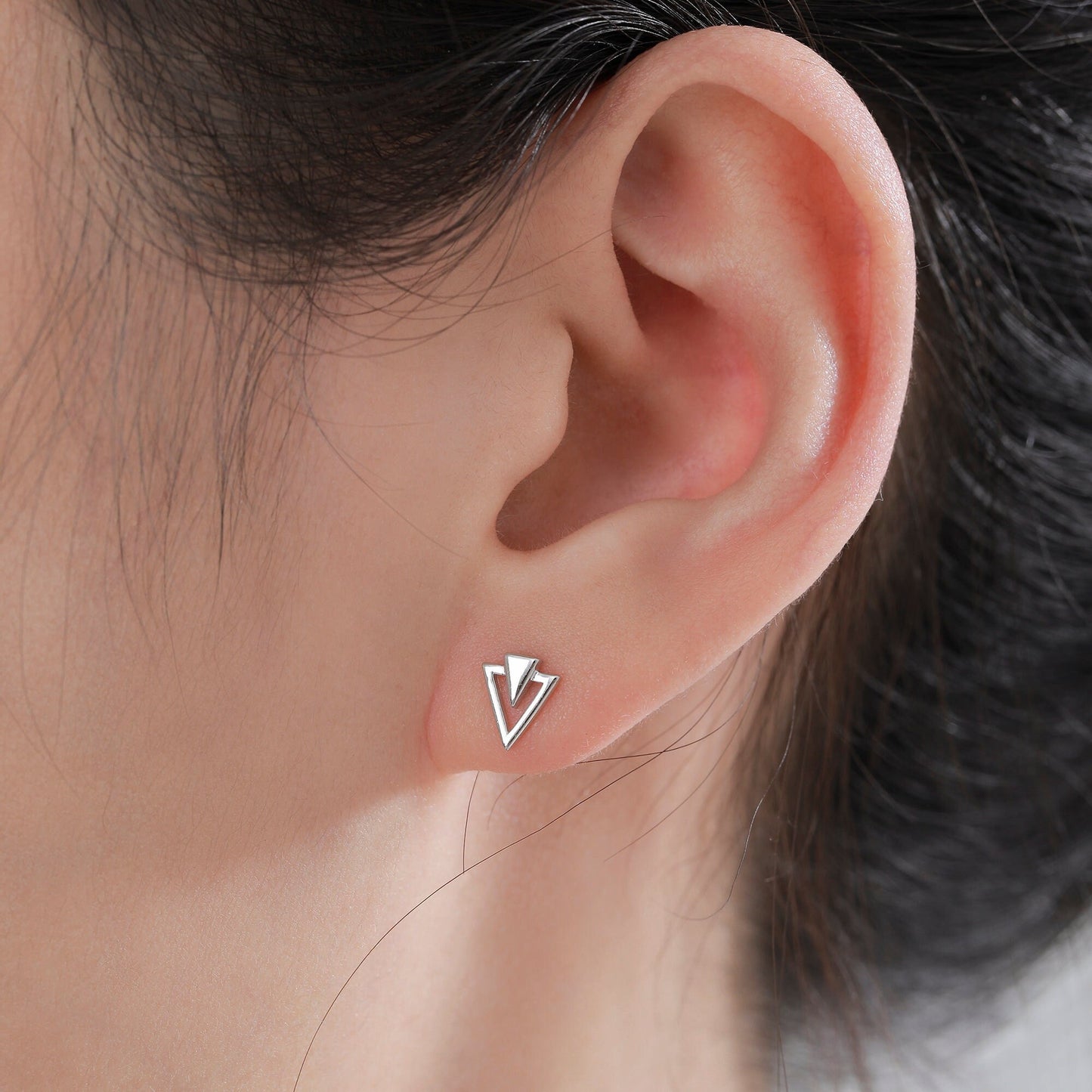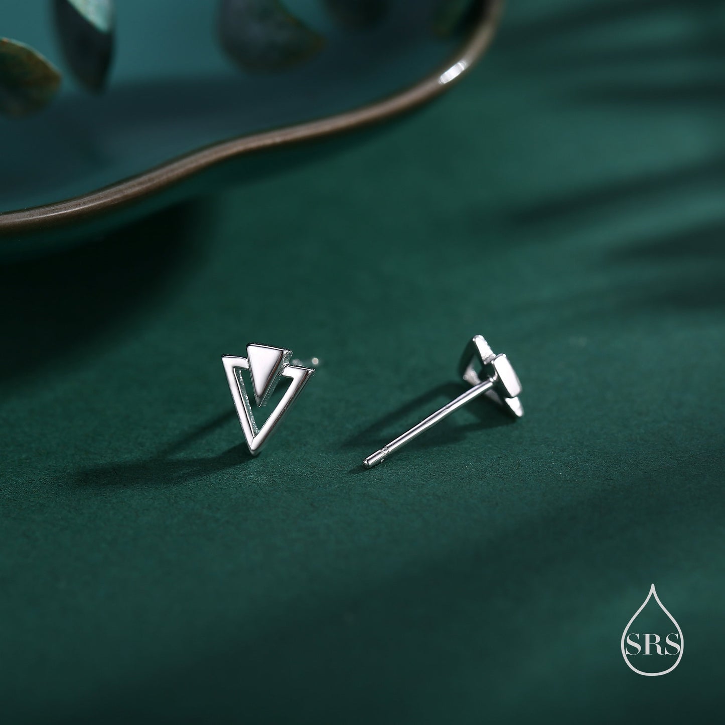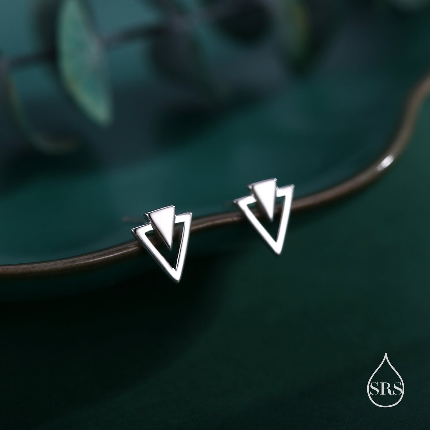 Art Deco Style Tiny Double Triangle Stud Earrings in Sterling Silver, Silver or Gold or Rose Gold, Cut Out Triangle Jacket Earrings