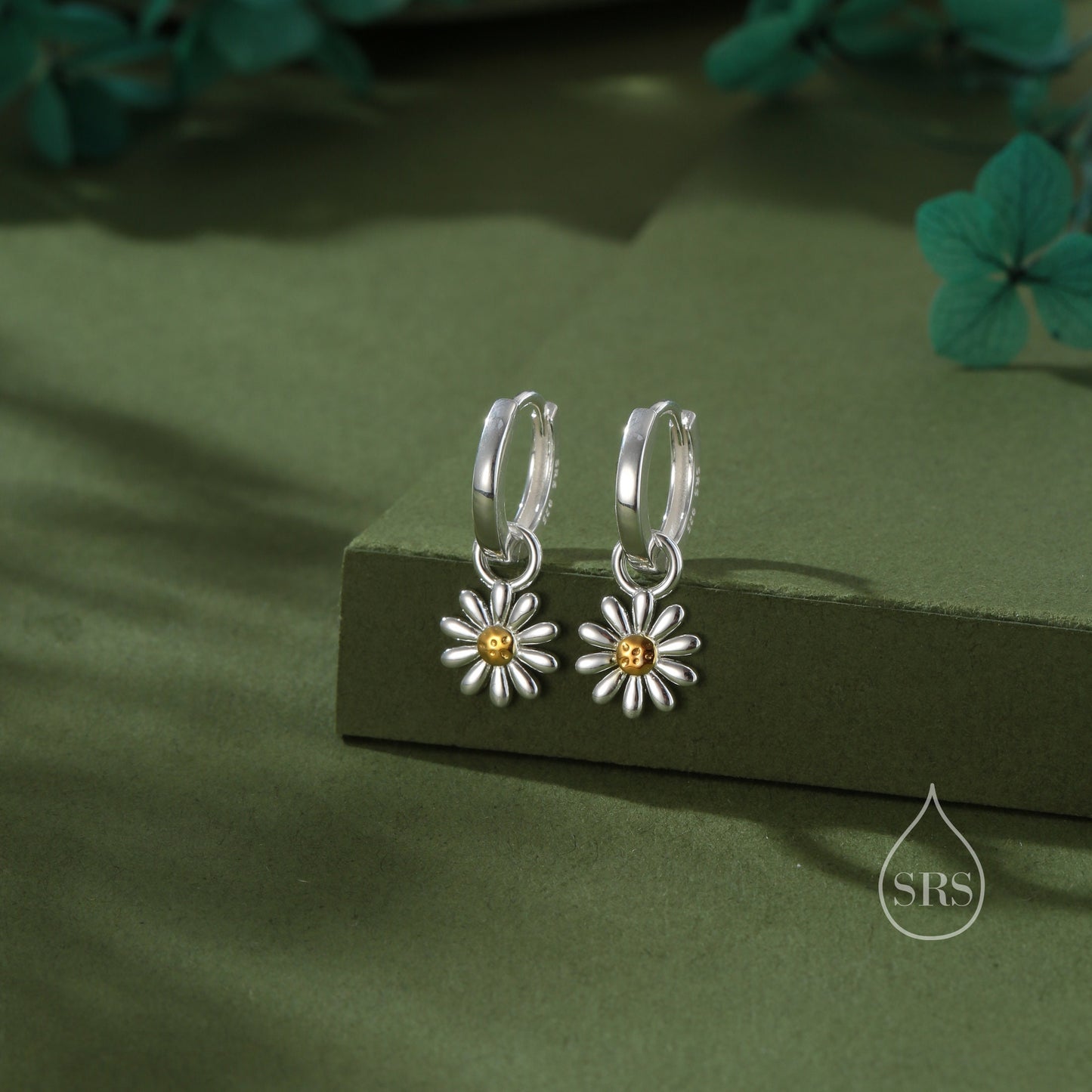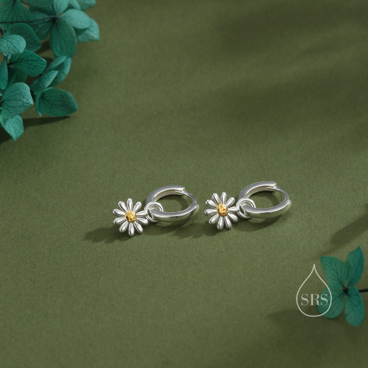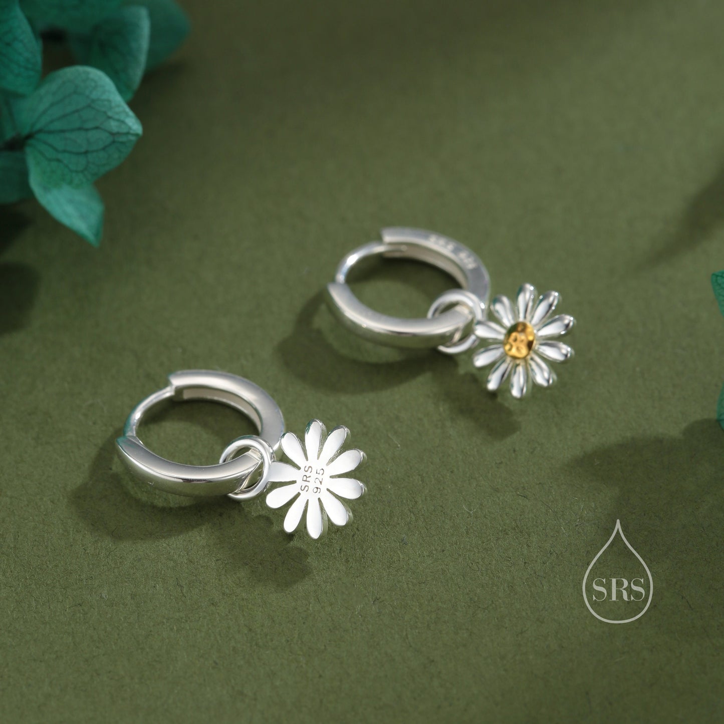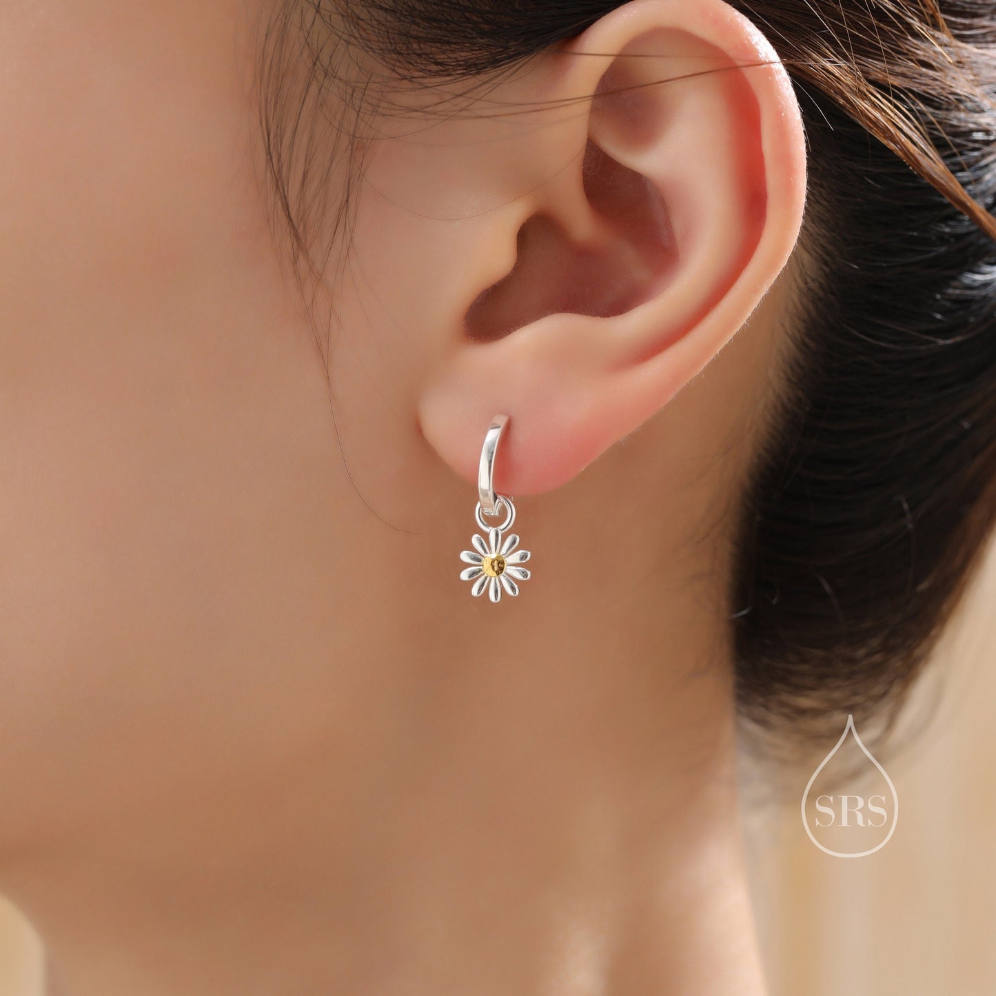 Sold as a Pair! Aster Flower Charmed Hoop Earrings in Sterling Silver - Daisy Flower Blossom Huggie Hoop Earrings - Whimsical, Detachable Charm Hoops