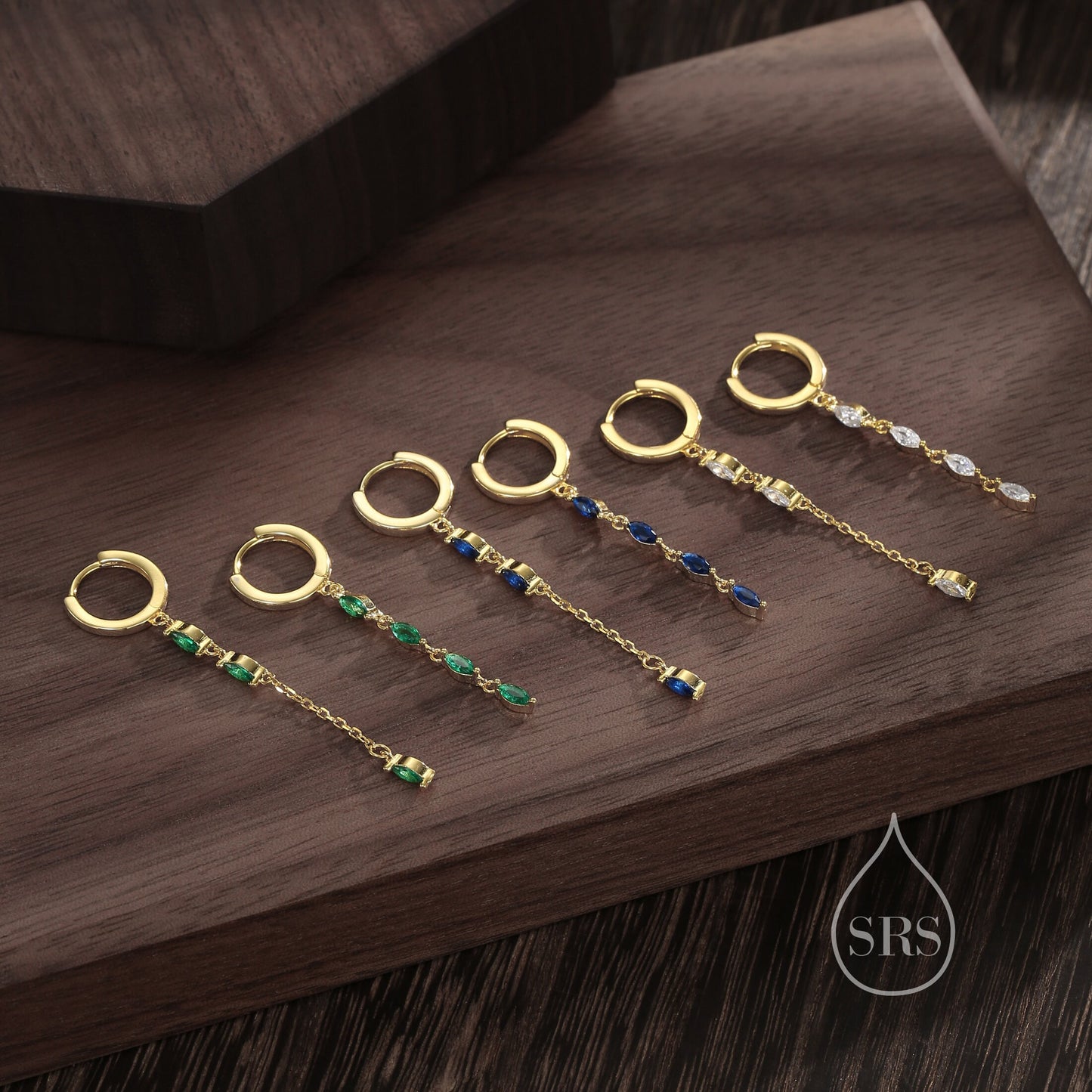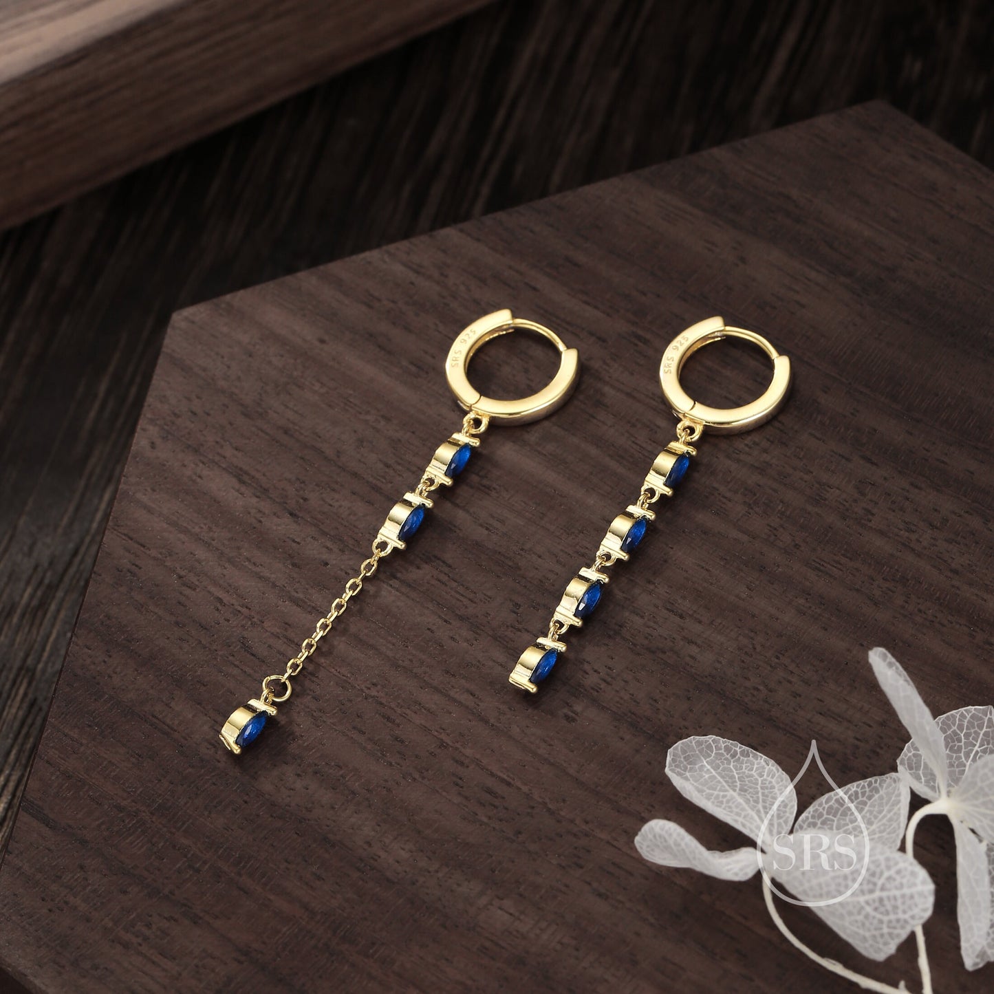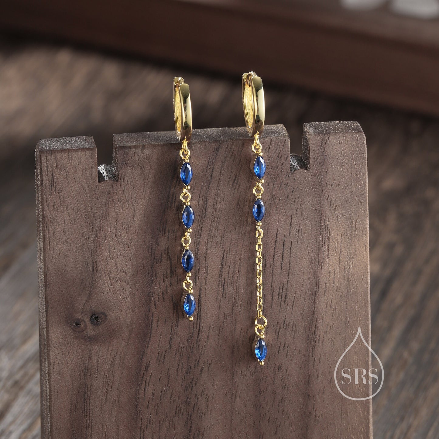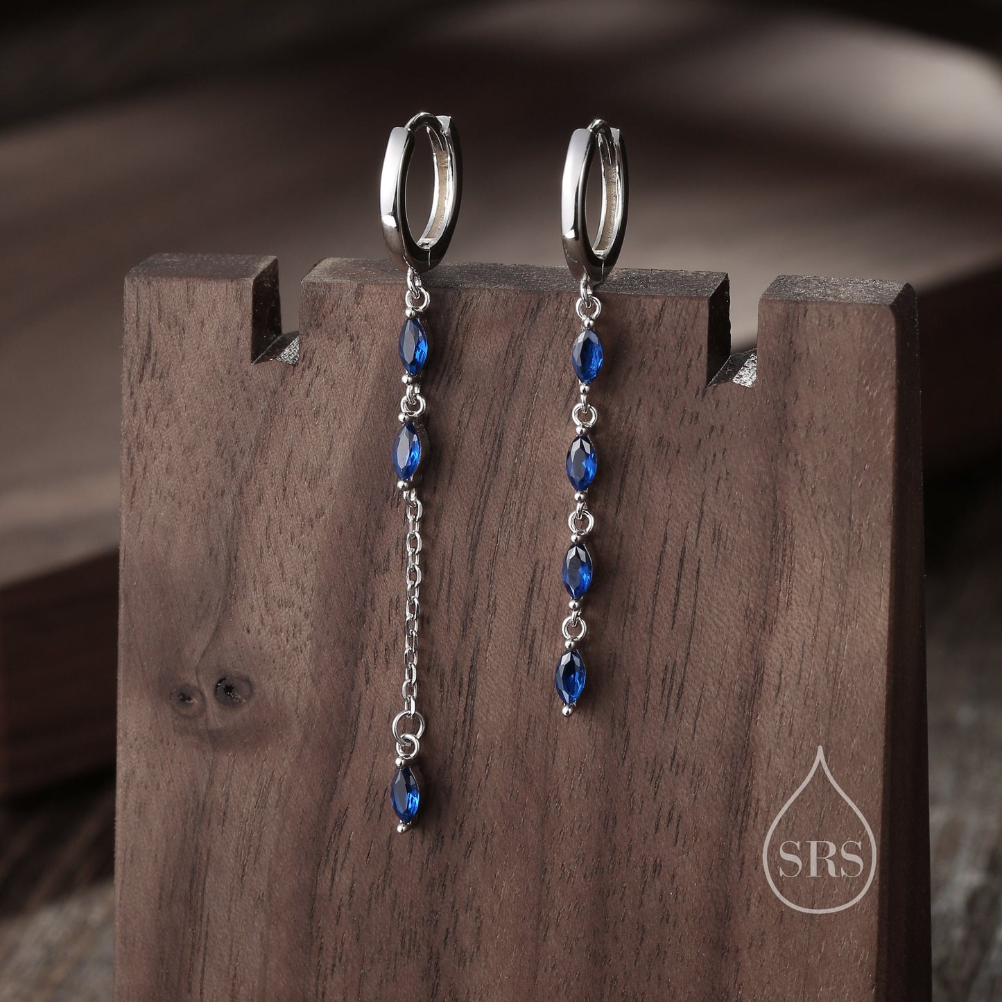 Asymmetric Marquise CZ Dangle Huggie Hoop Earrings in Sterling Silver with Sapphire Blue CZ, Silver or Gold, Geometric Hoop Earrings