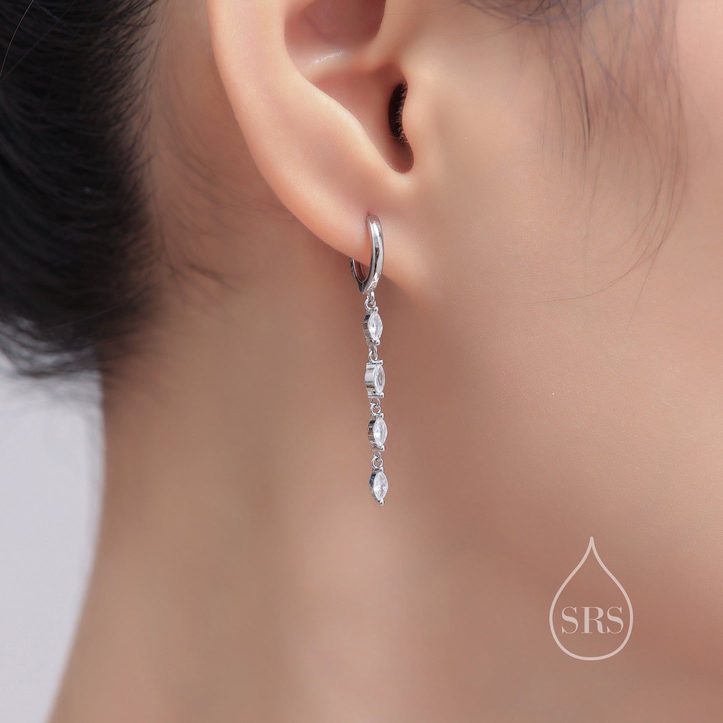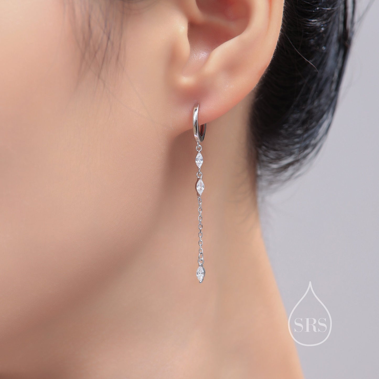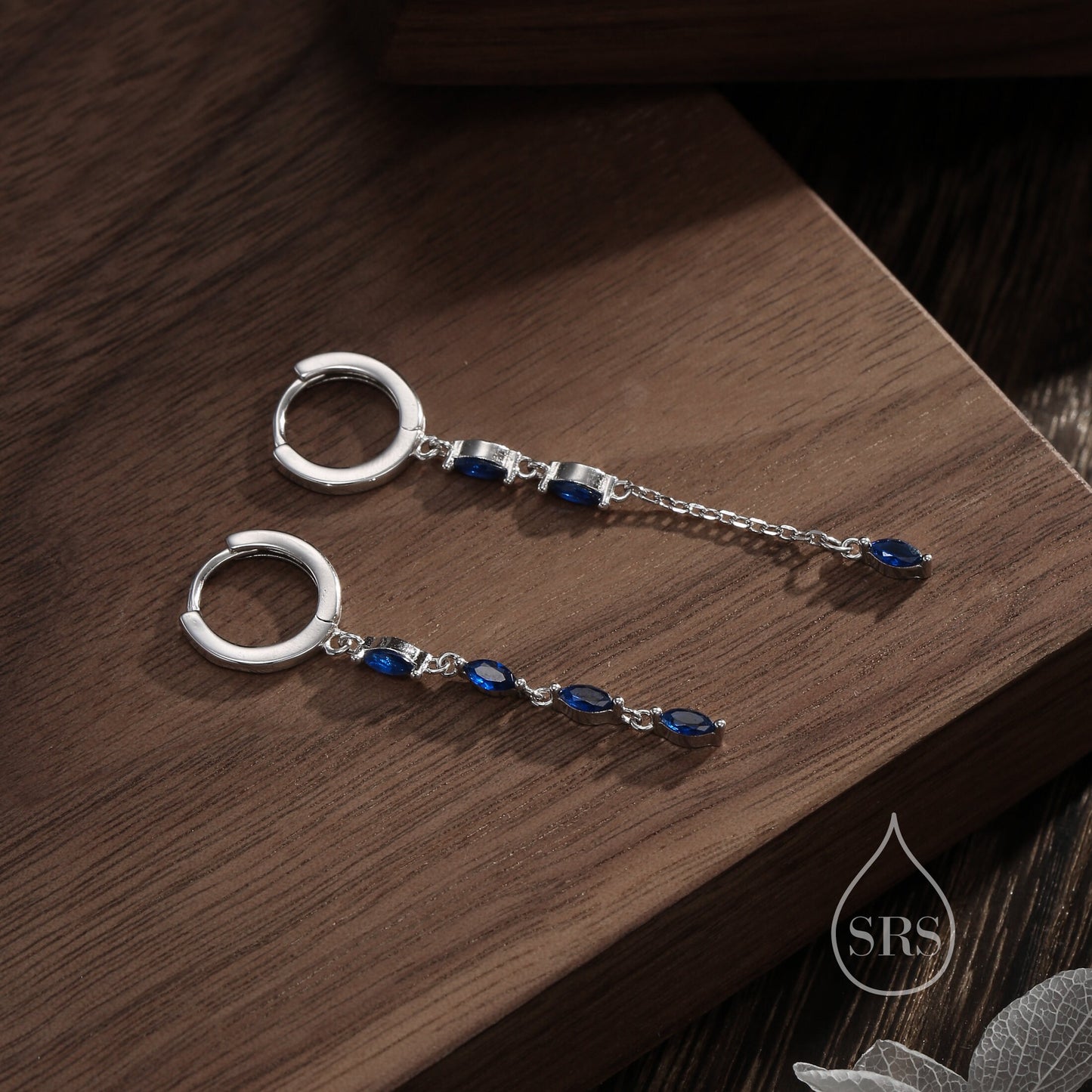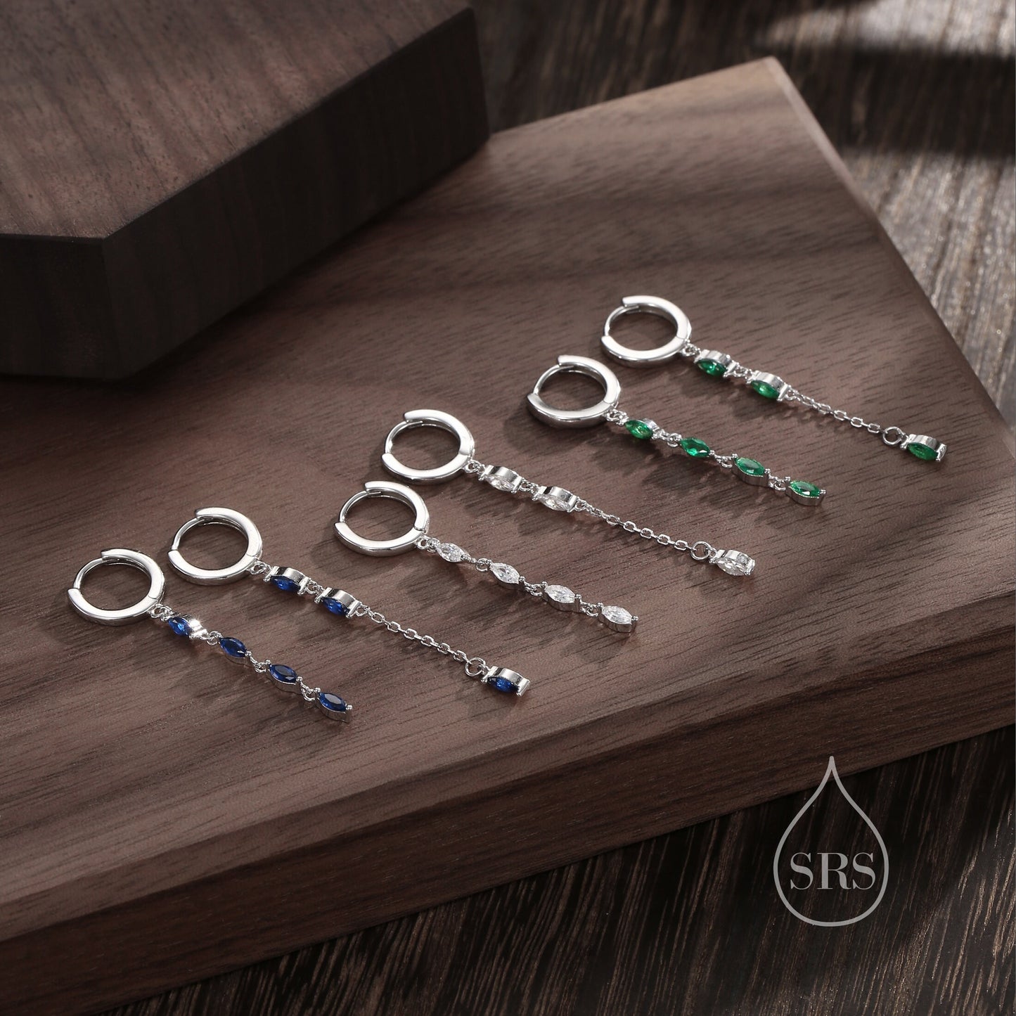 Asymmetric Marquise CZ Dangle Huggie Hoop Earrings in Sterling Silver with Sapphire Blue CZ, Silver or Gold, Geometric Hoop Earrings