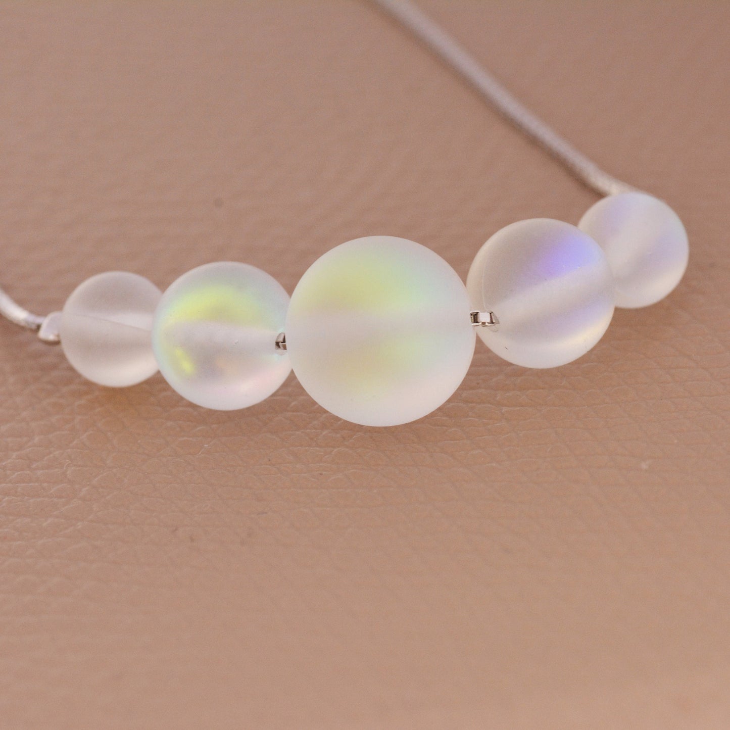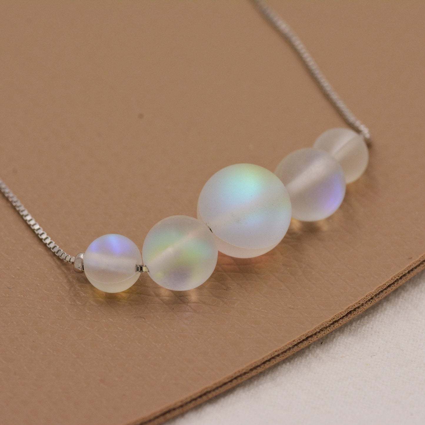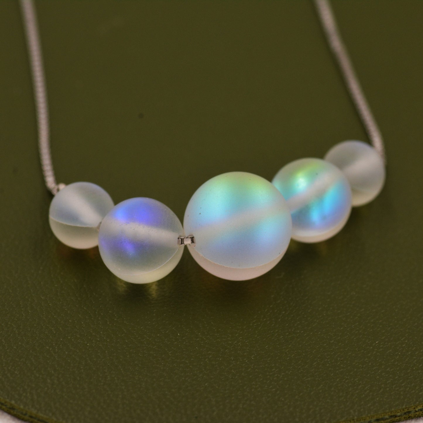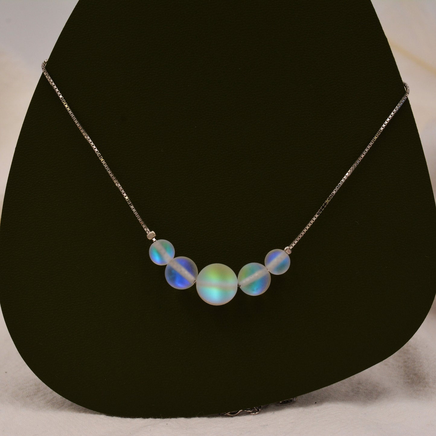 Aurora Crystal Beaded Necklace in Sterling Silver, Northern Lights Necklace with Blue Flash Simulated Moonstone