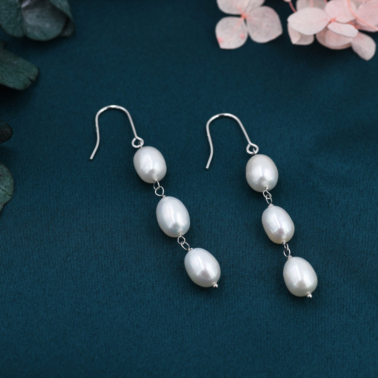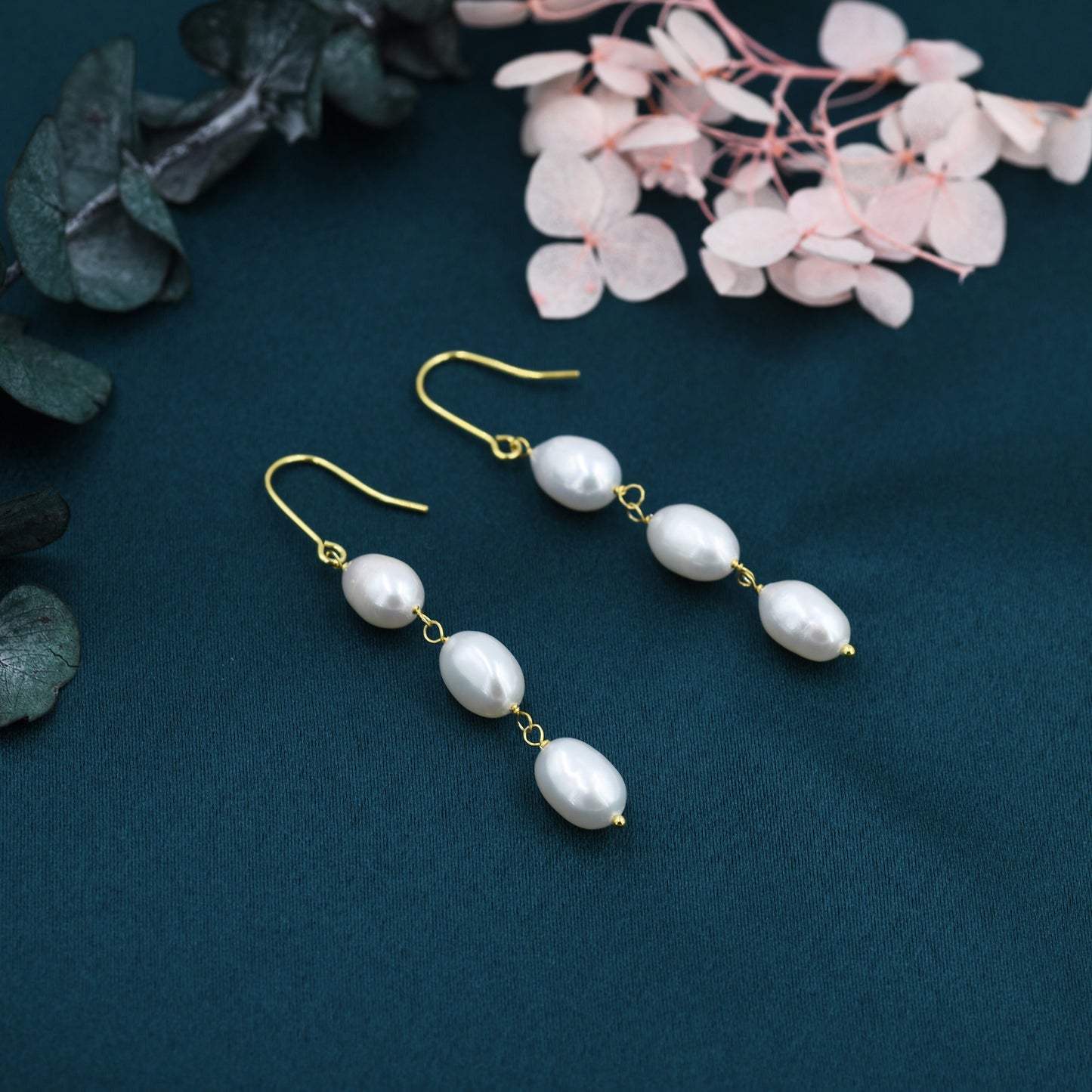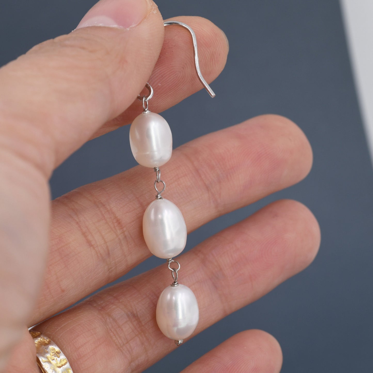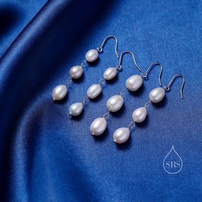 Baroque Pearl Trio Drop Hook Earrings in Sterling Silver, Silver or Gold, Long Pearl Drop Earrings, Natural Keshi Freshwater Pearl Earrings
