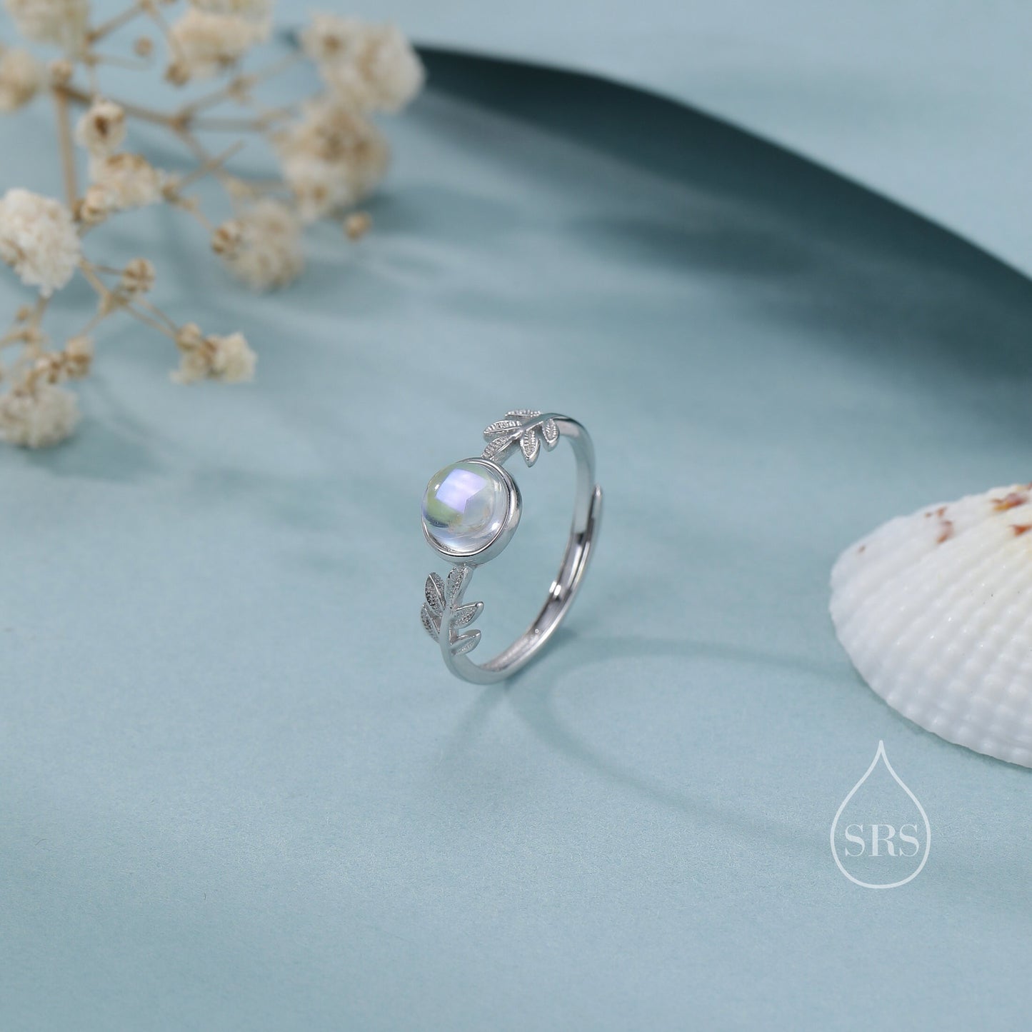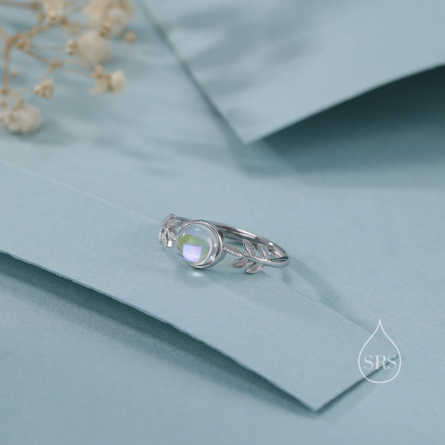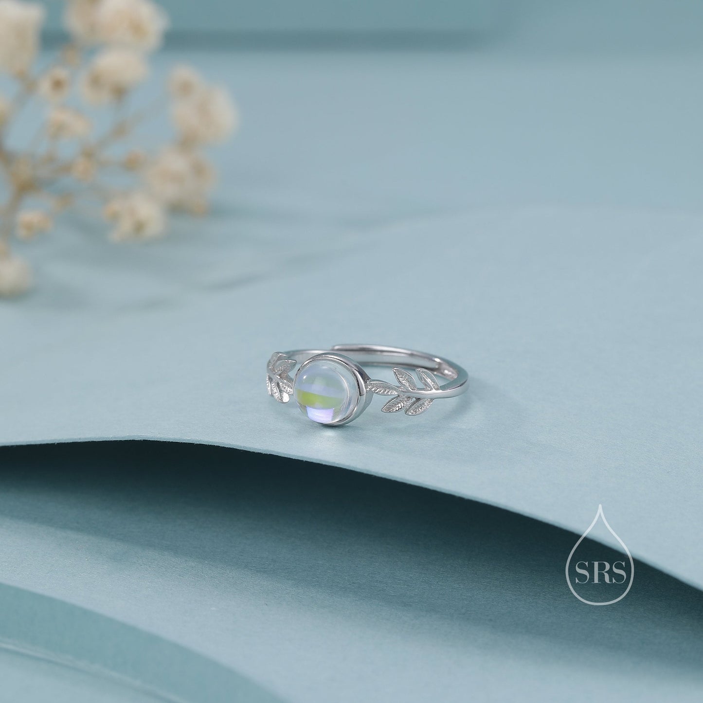 Blue Moonstone Olive Leaf Ring in Sterling Silver, Adjustable Olive Leaf Ring, Leaf Ring with Lab Moonstone, Simulated Moonstone Ring