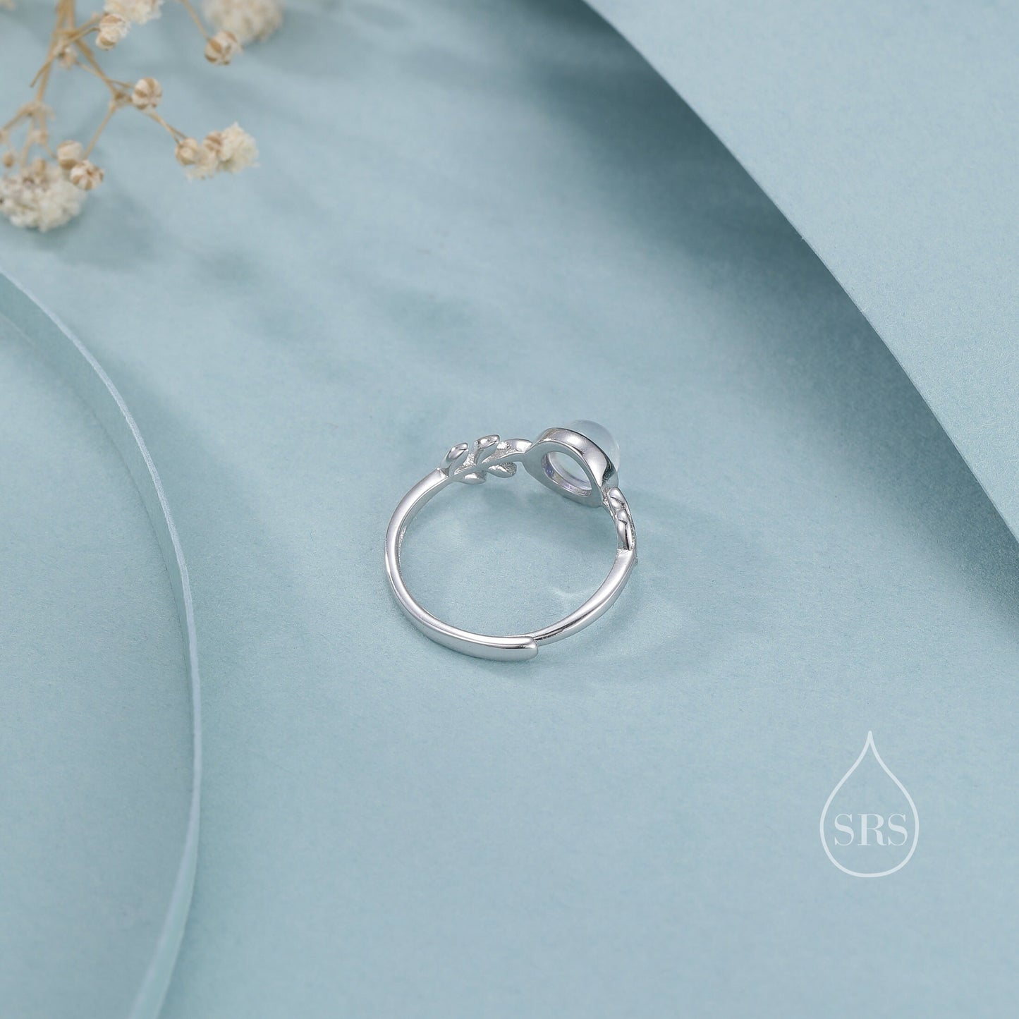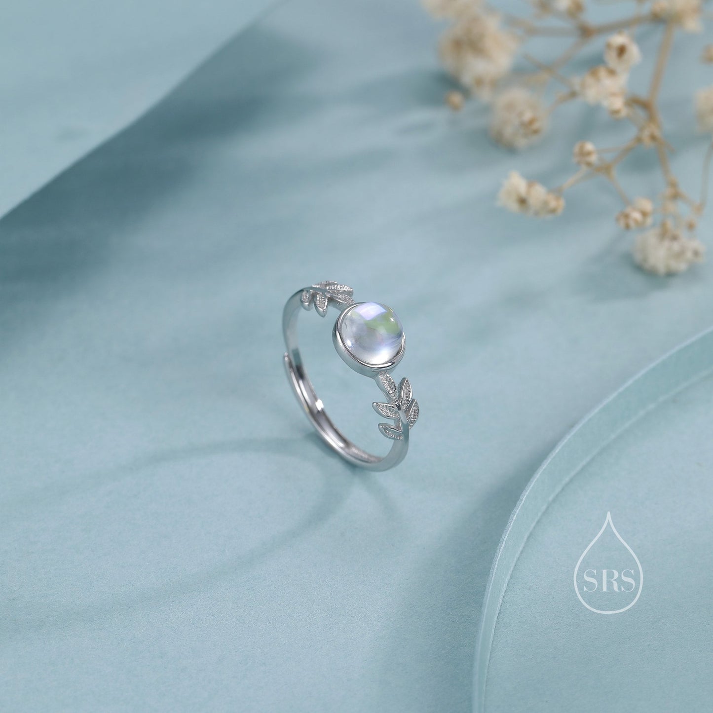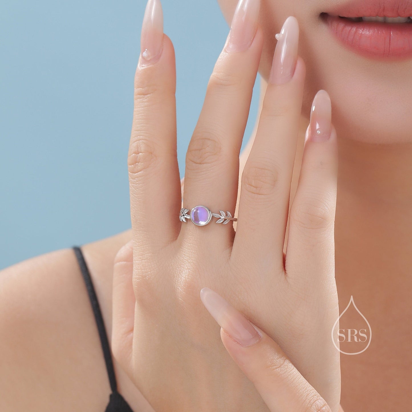 Blue Moonstone Olive Leaf Ring in Sterling Silver, Adjustable Olive Leaf Ring, Leaf Ring with Lab Moonstone, Simulated Moonstone Ring
