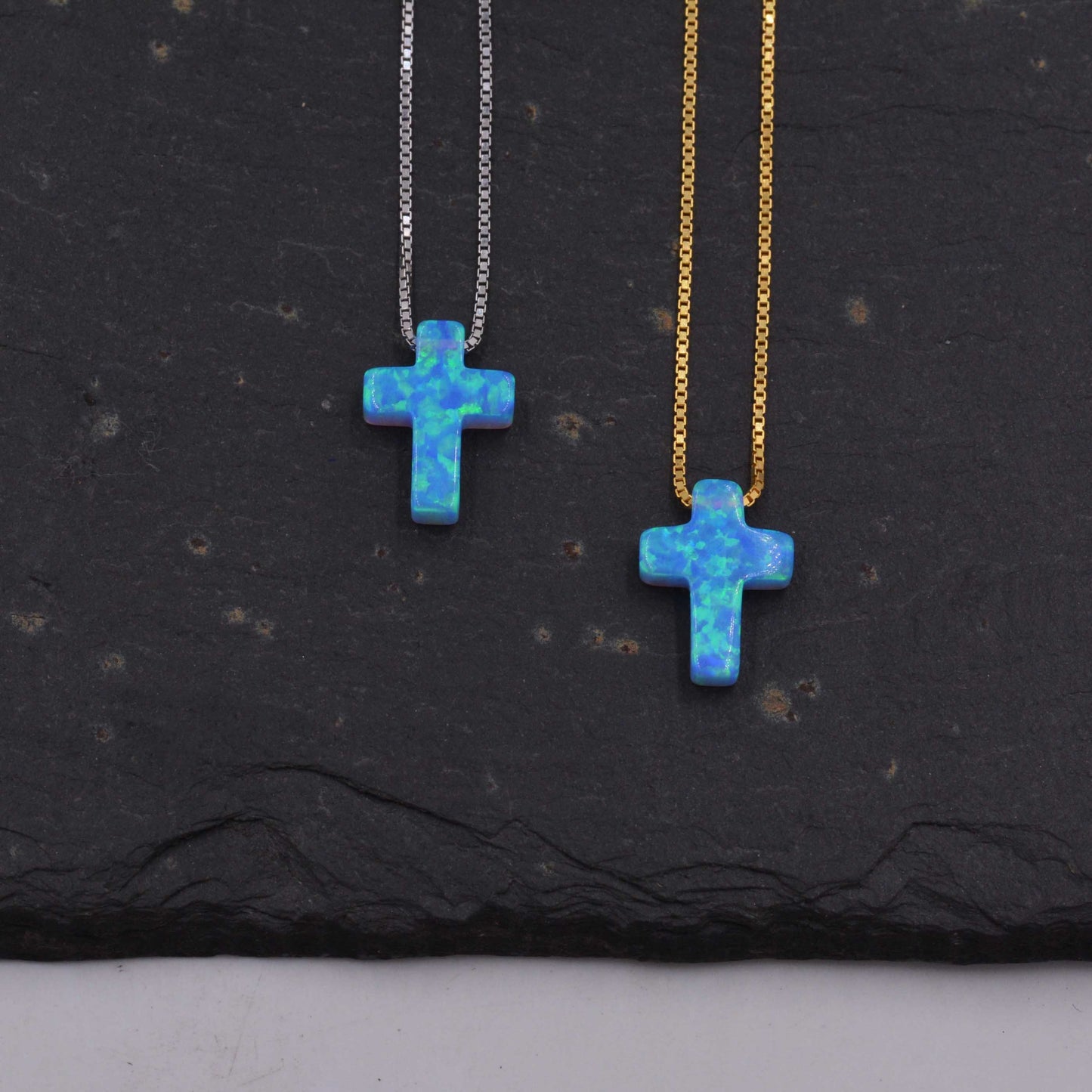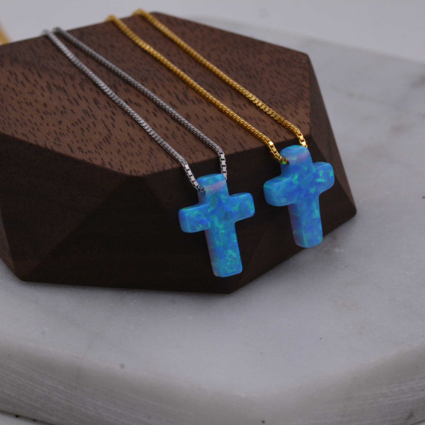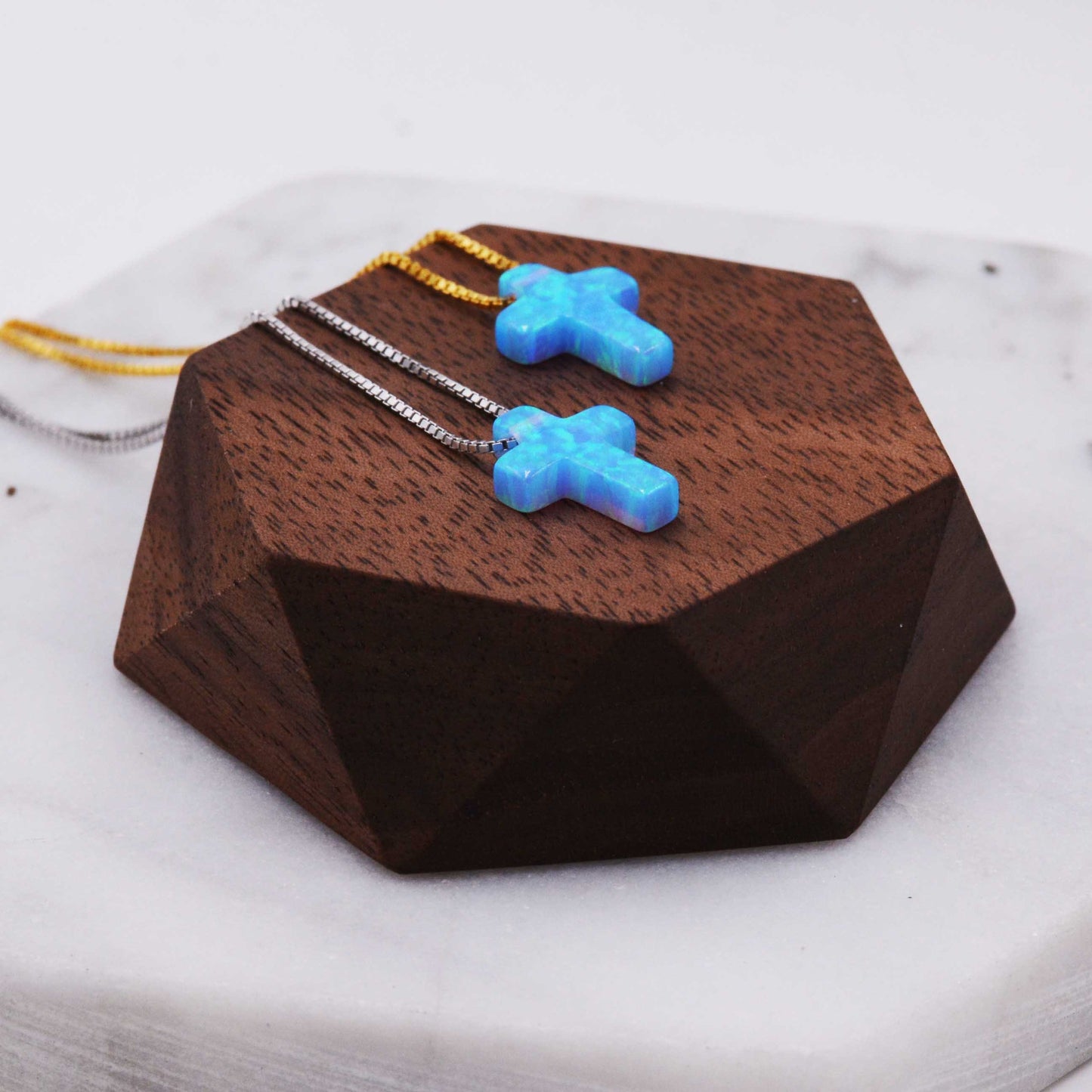 Blue Opal Cross Pendant Necklace. Delicate Sterling Silver Necklace. Gold Plated or Rose Gold. Dainty and Delicate