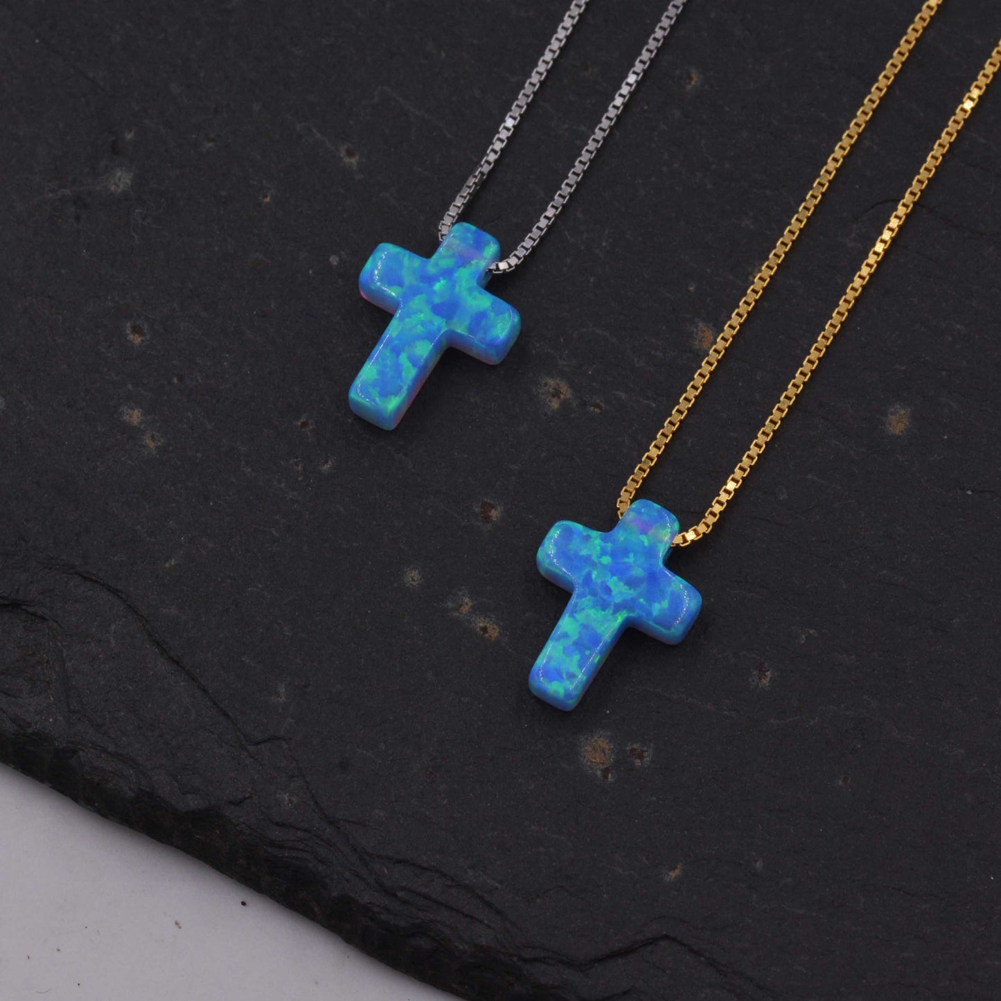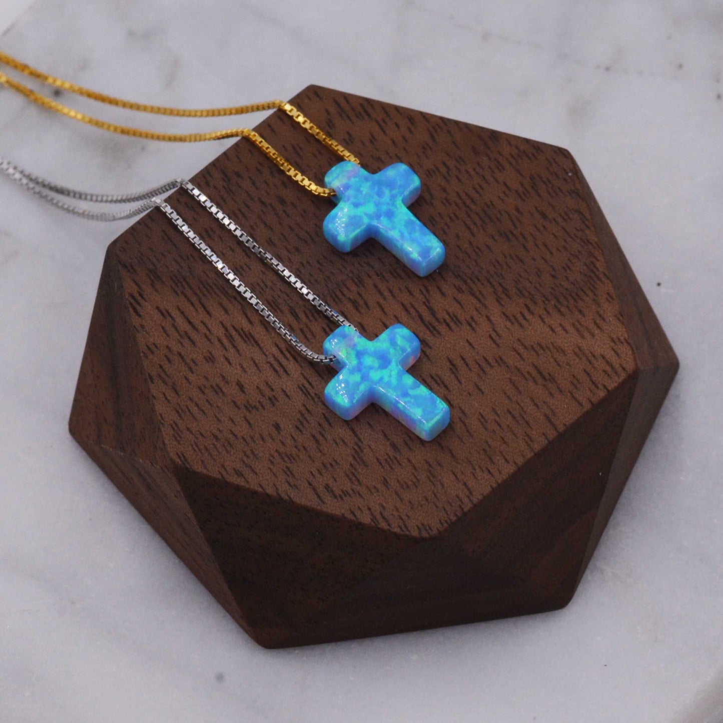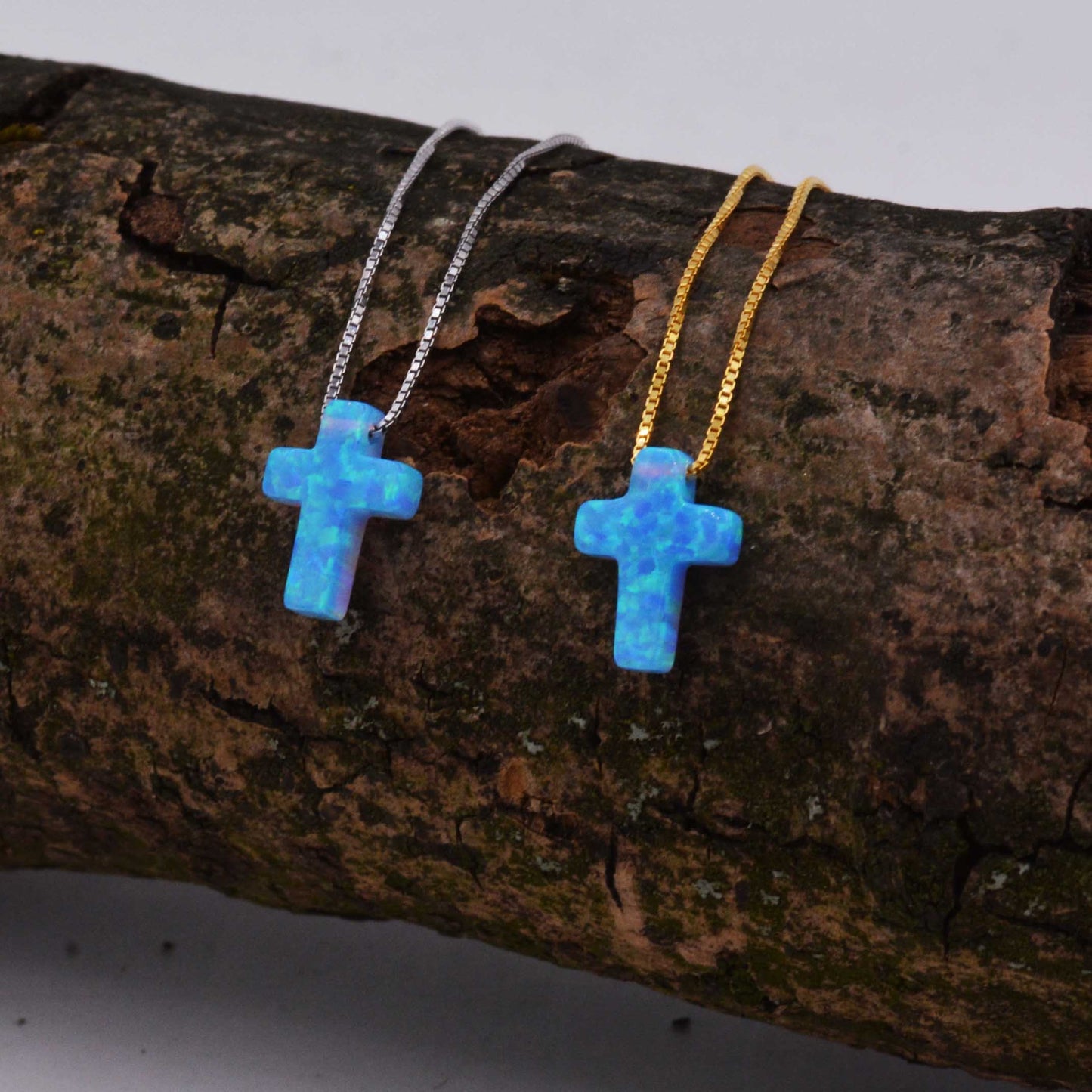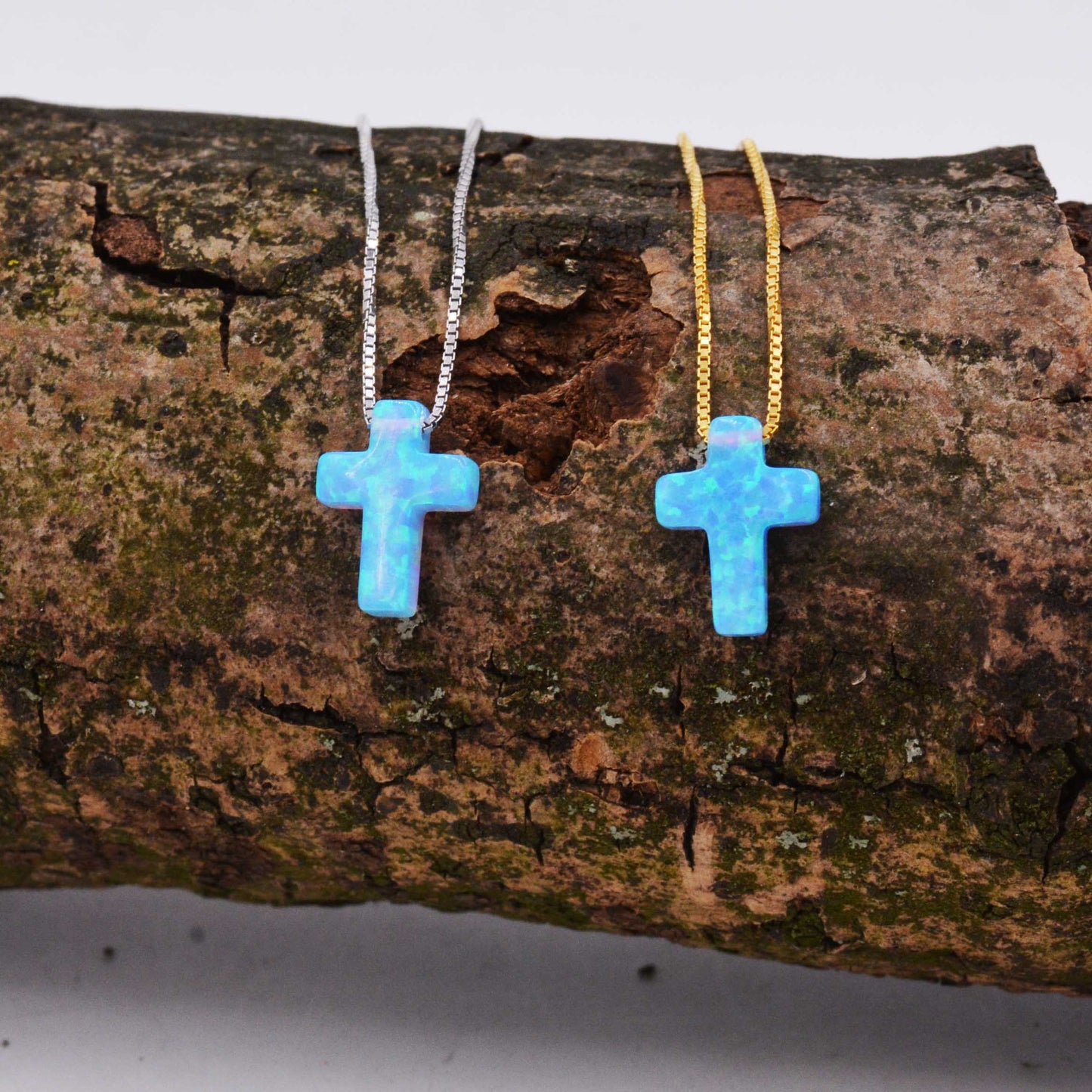 Blue Opal Cross Pendant Necklace. Delicate Sterling Silver Necklace. Gold Plated or Rose Gold. Dainty and Delicate