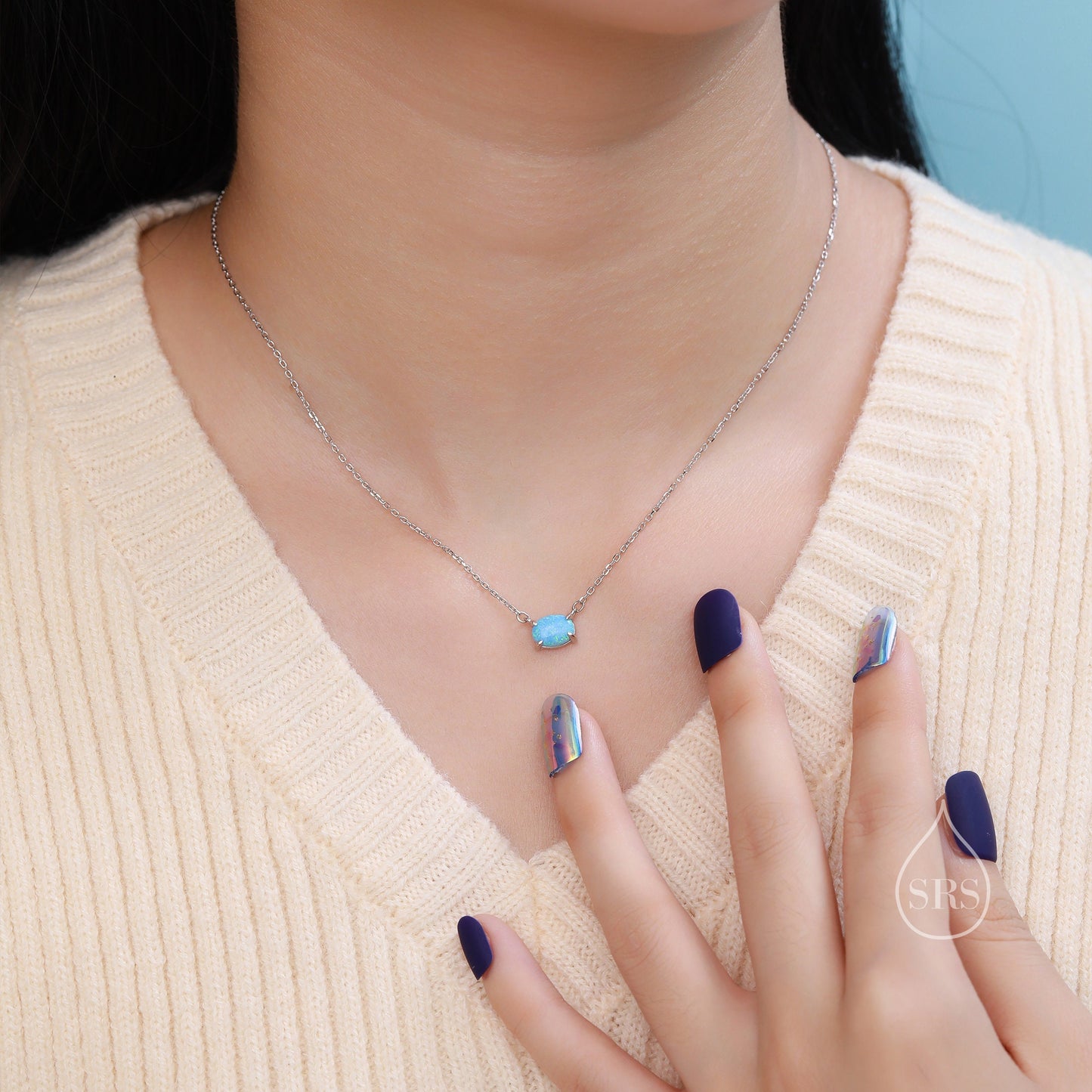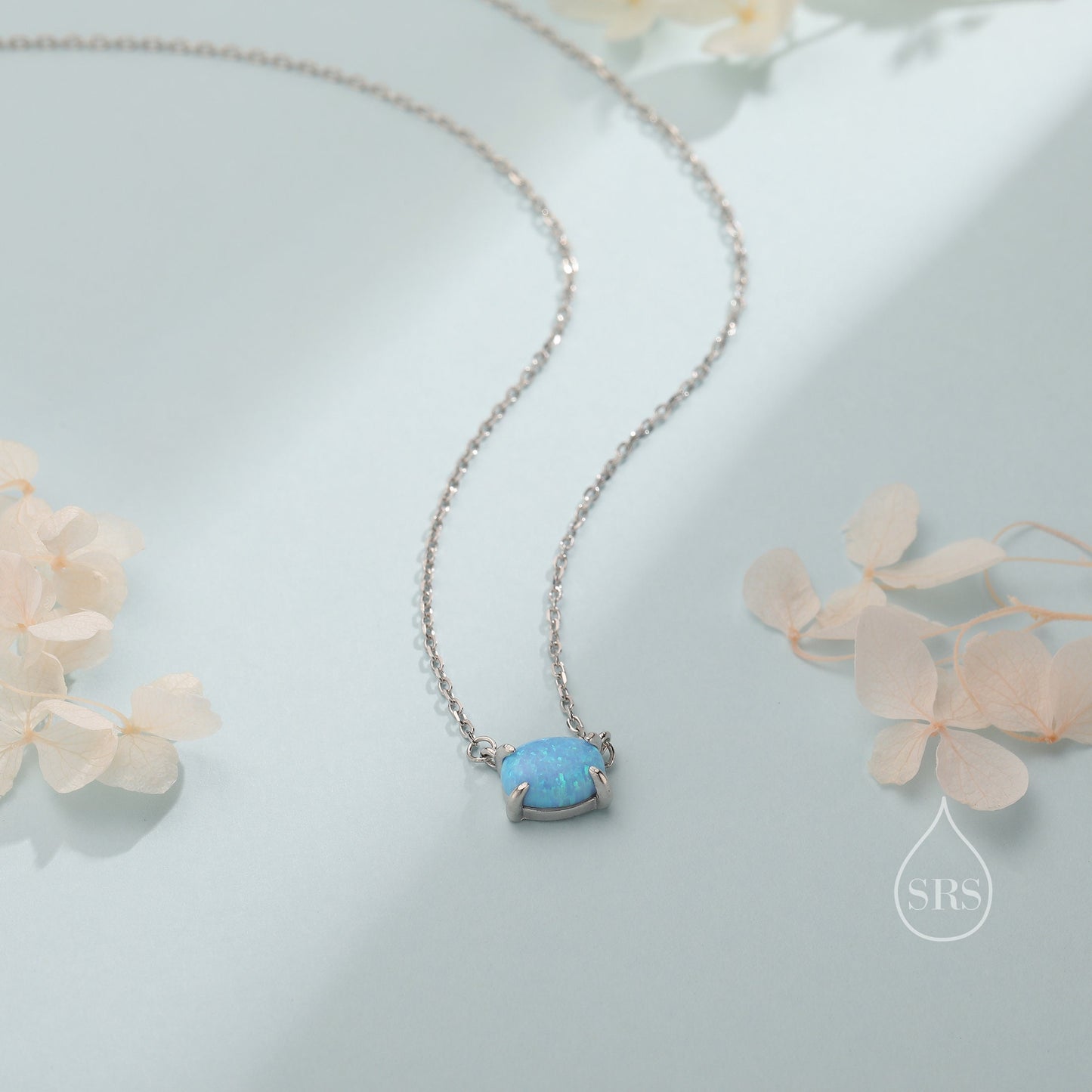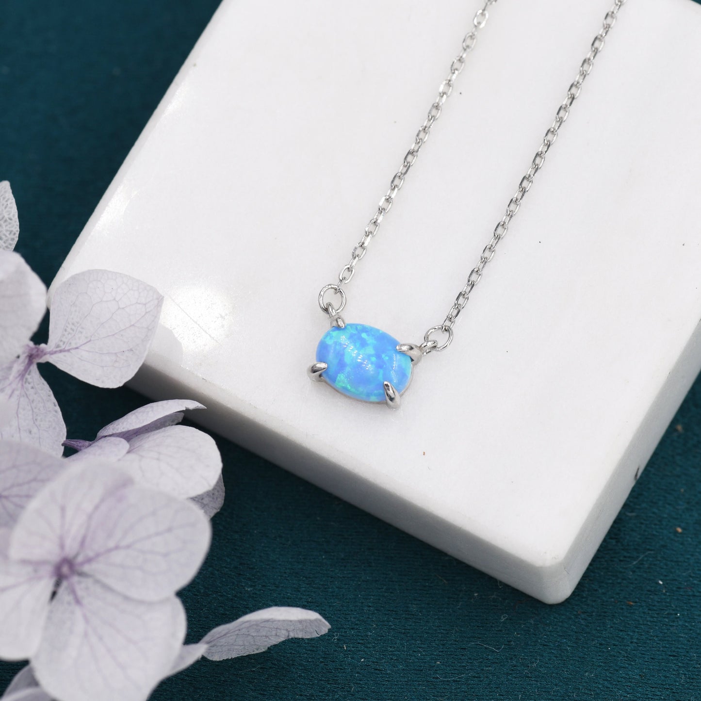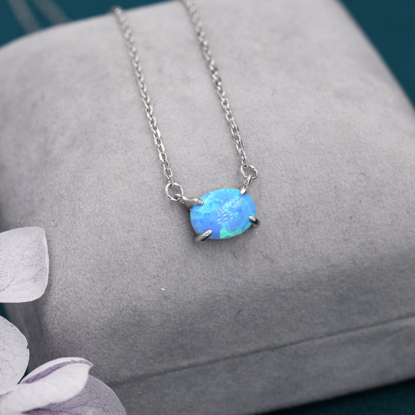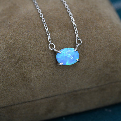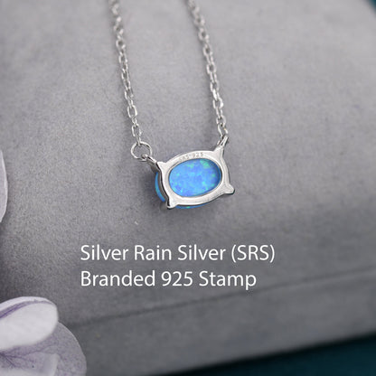 Blue Opal Oval Necklace in Sterling Silver, Dainty Lab Oval Cabochon Necklace, October Birthstone