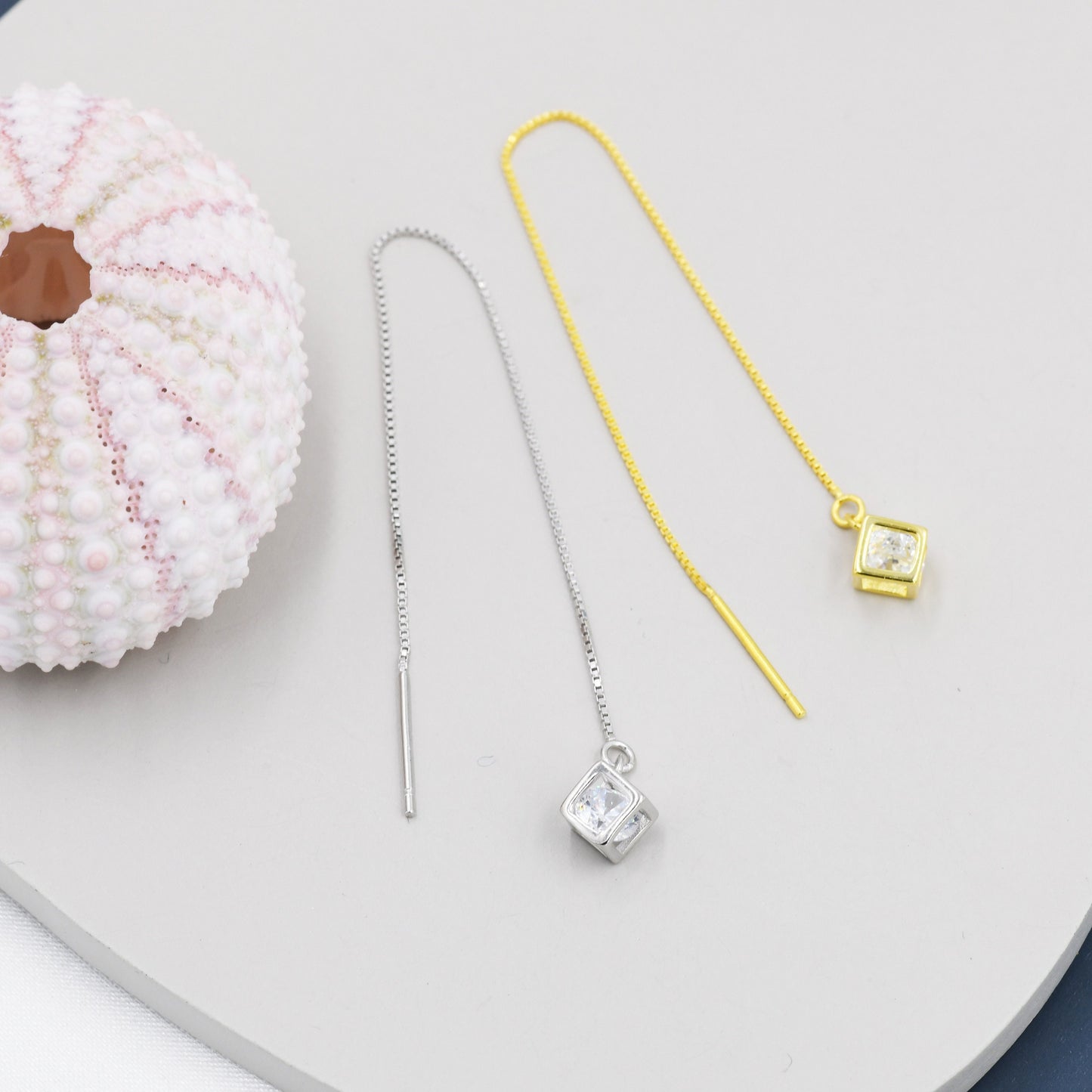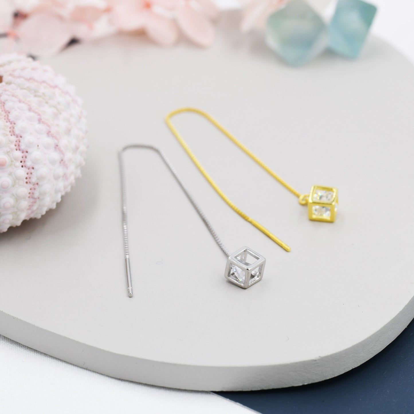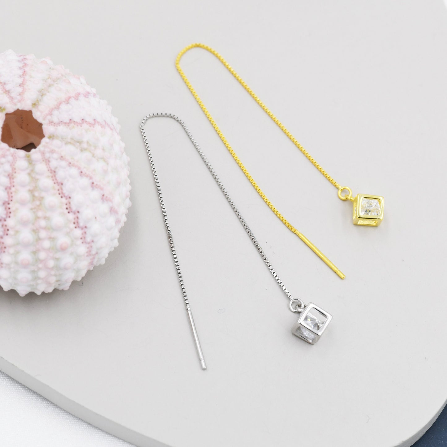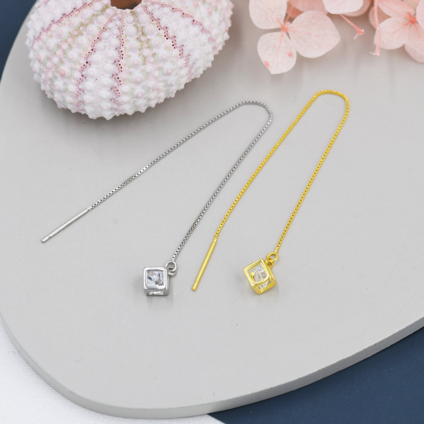 Caged CZ Cube Threaders Earrings in Sterling Silver, Silver or Gold, Crystal Cube Ear Threaders, 9cm long threaders, minimalist Threaders