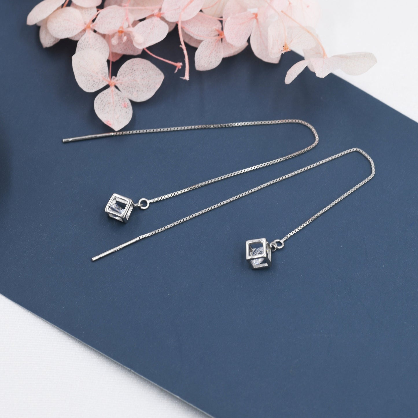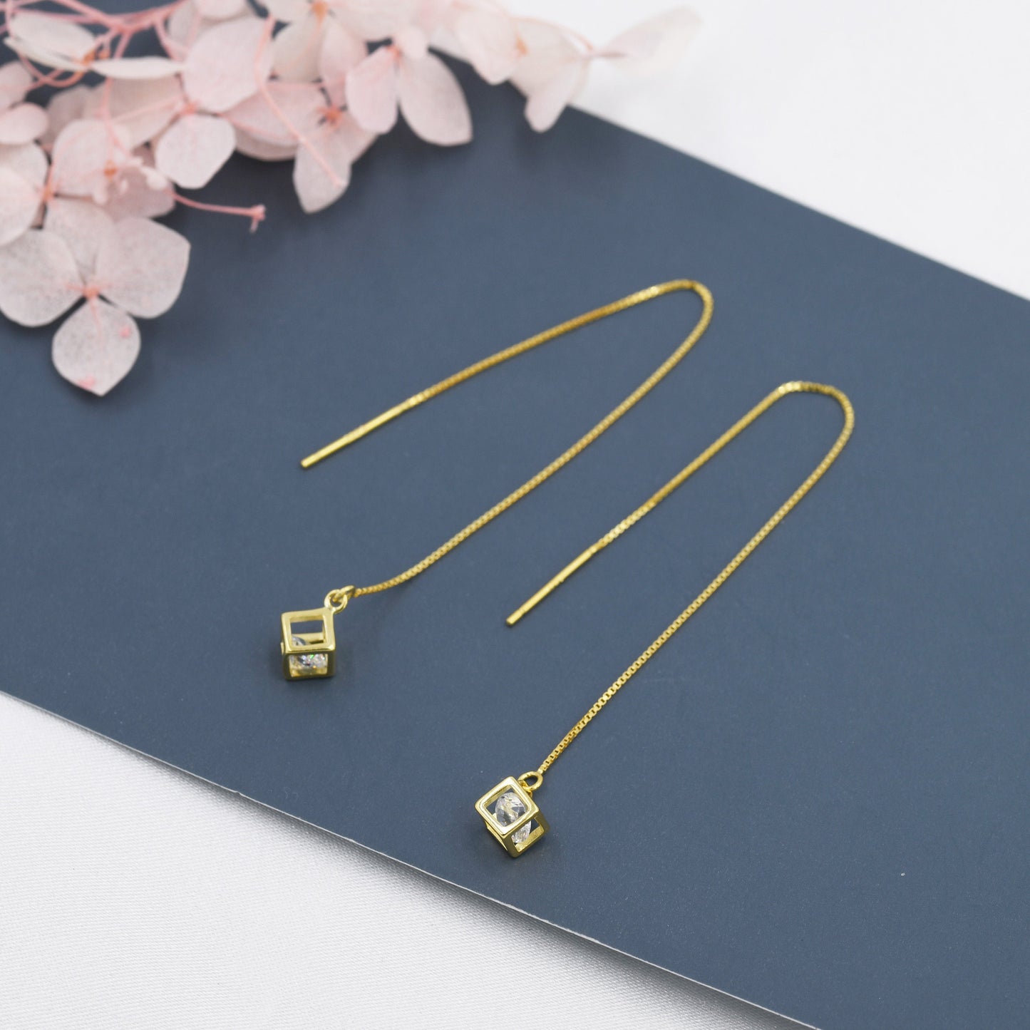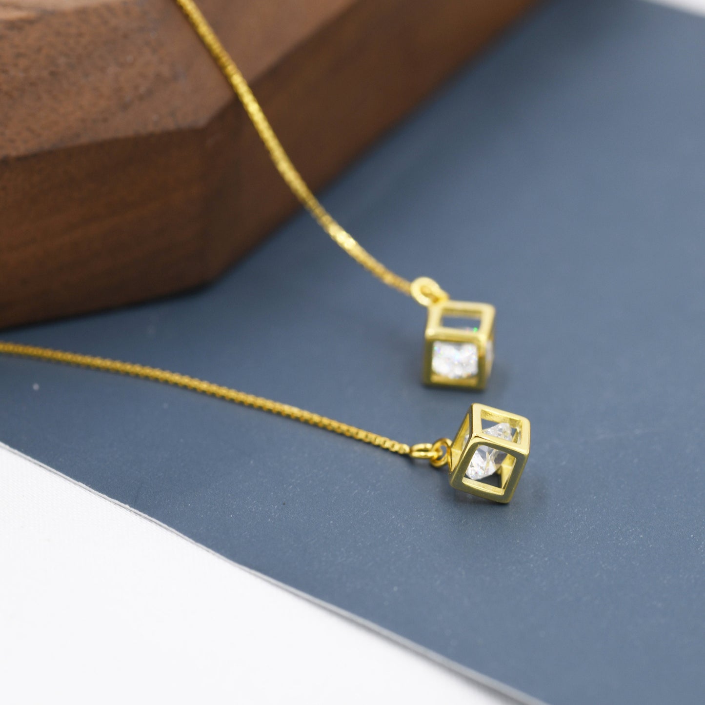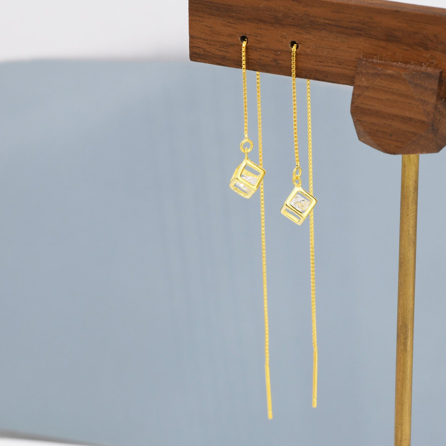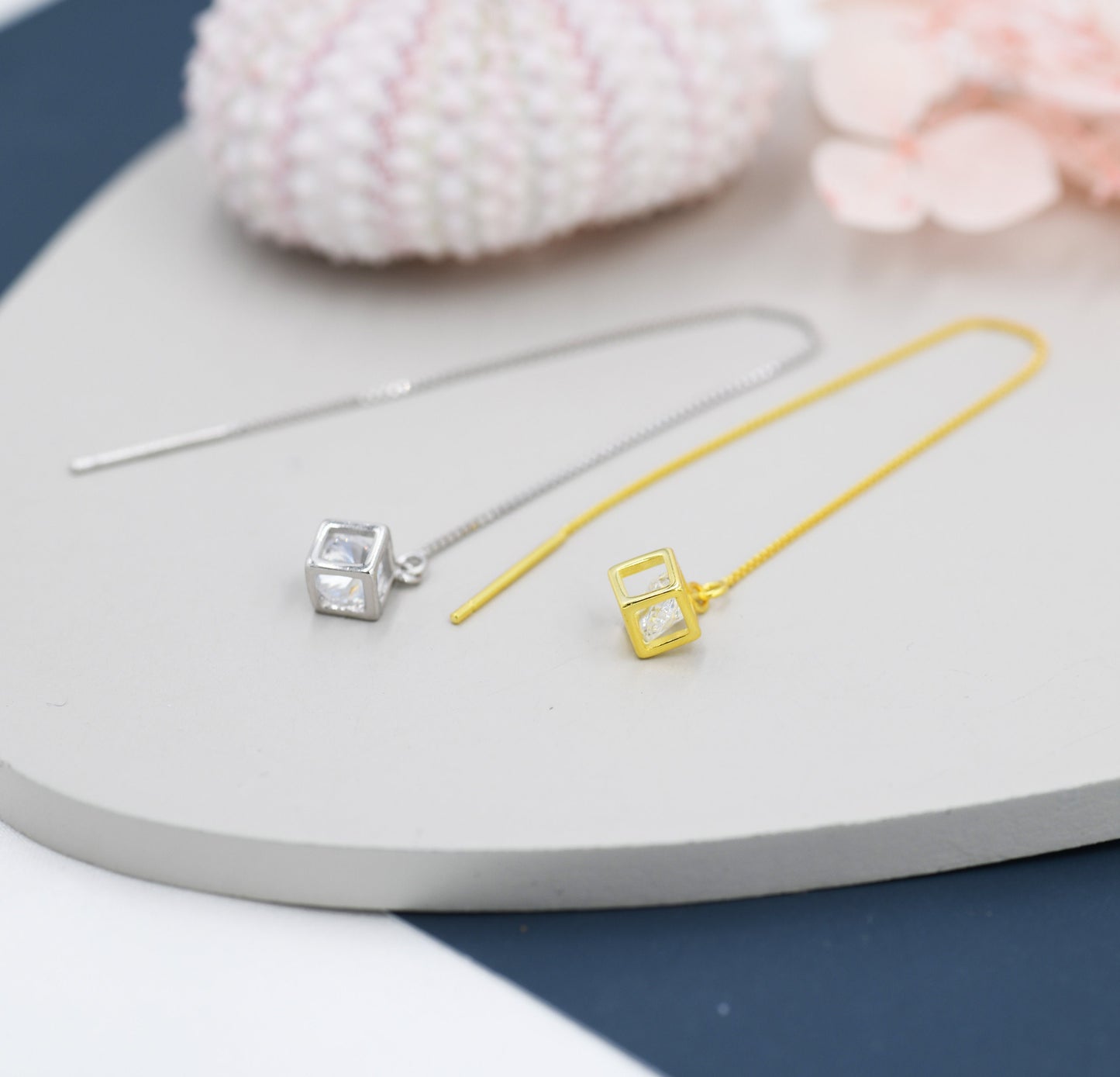 Caged CZ Cube Threaders Earrings in Sterling Silver, Silver or Gold, Crystal Cube Ear Threaders, 9cm long threaders, minimalist Threaders
