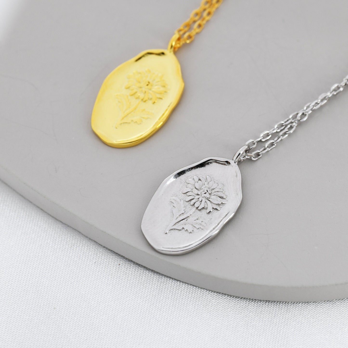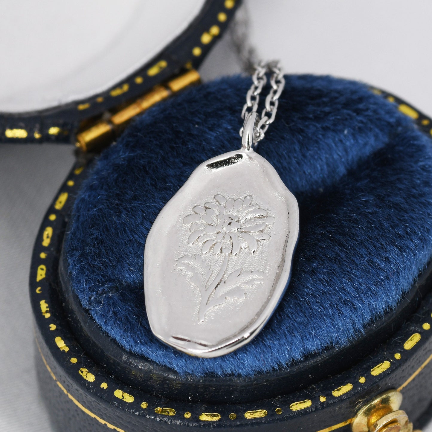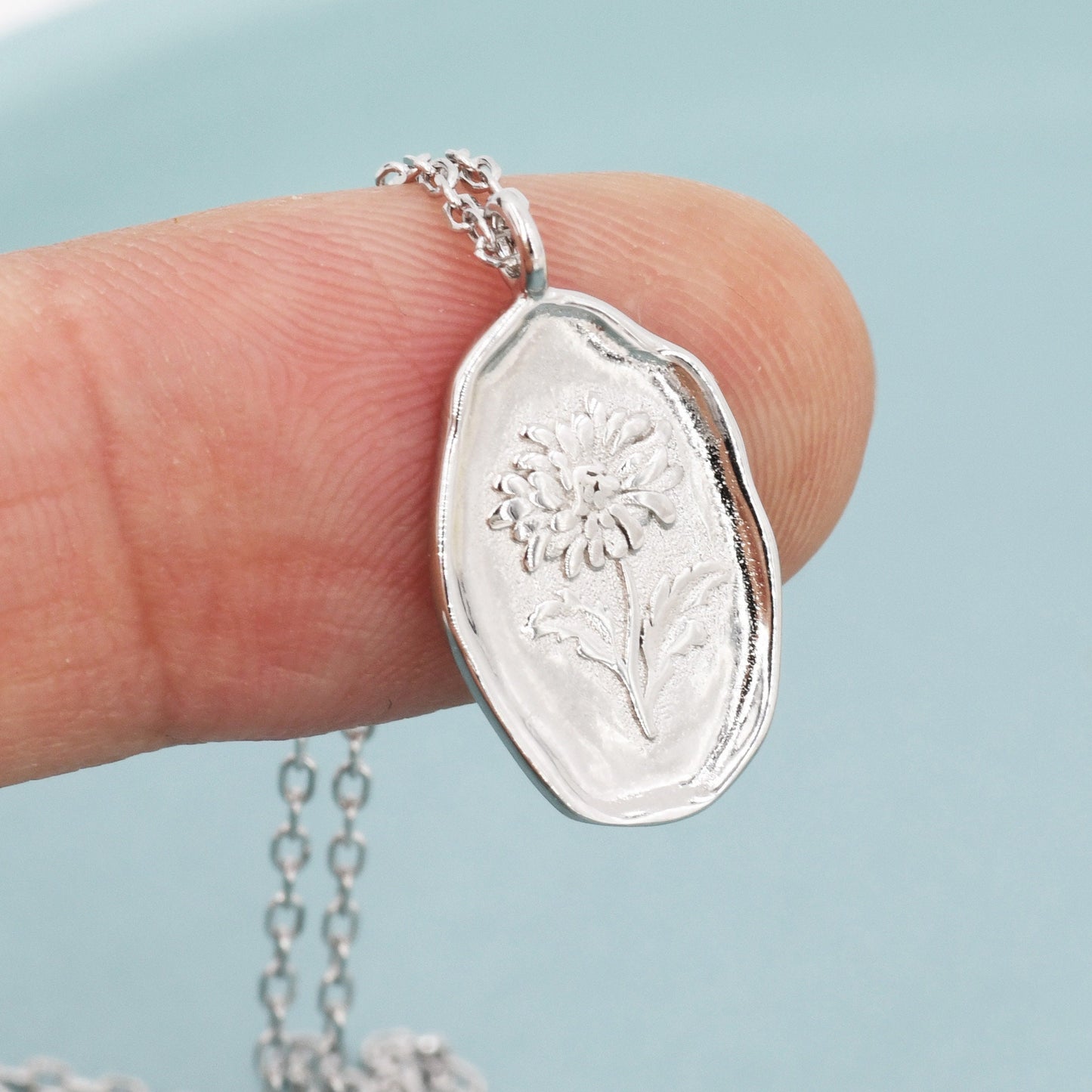 Chrysanthemum Flower Oval Pendant Necklace in Sterling Silver, Silver or Gold, November Birth Flower, Nature Inspired Flower Necklace