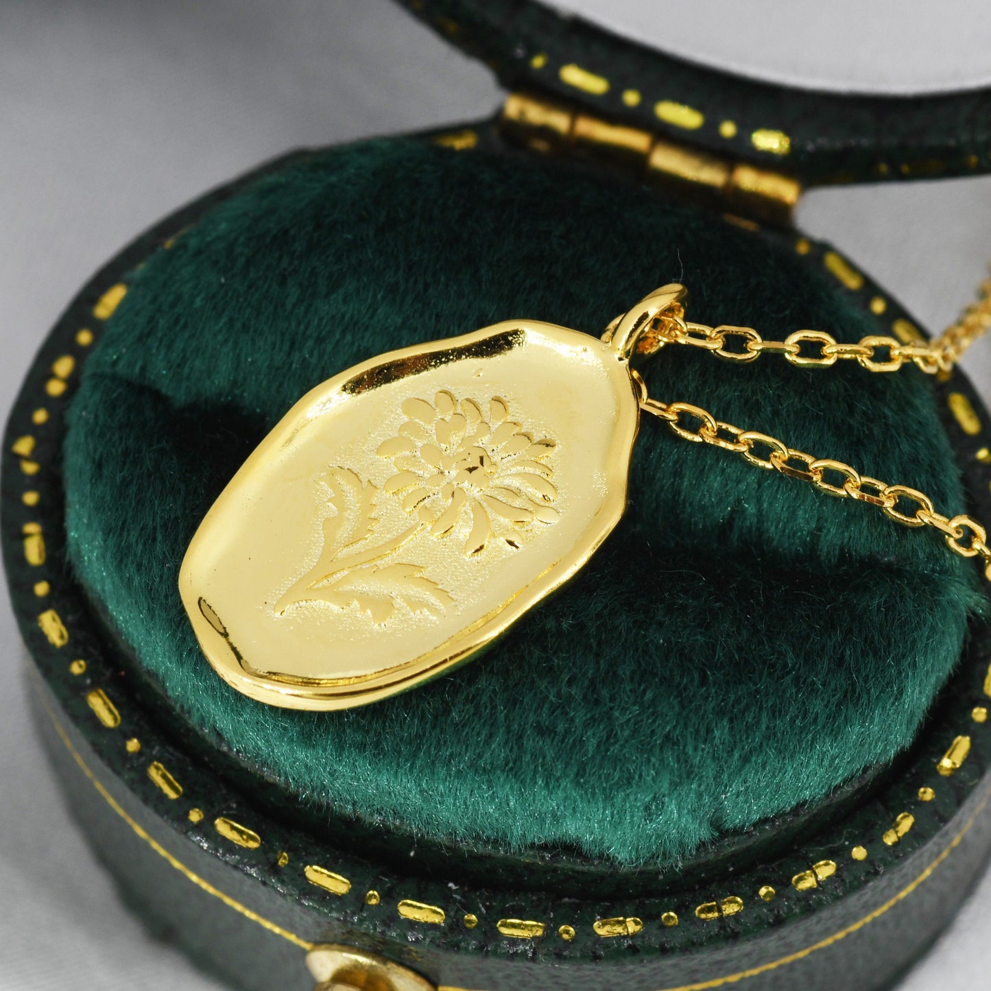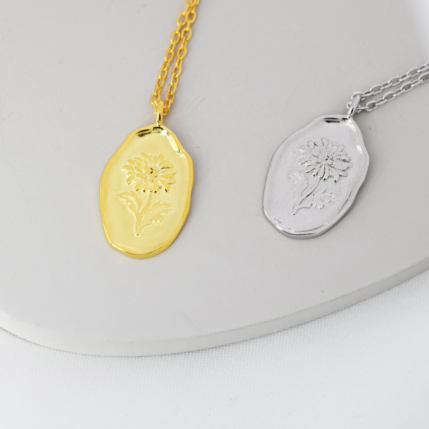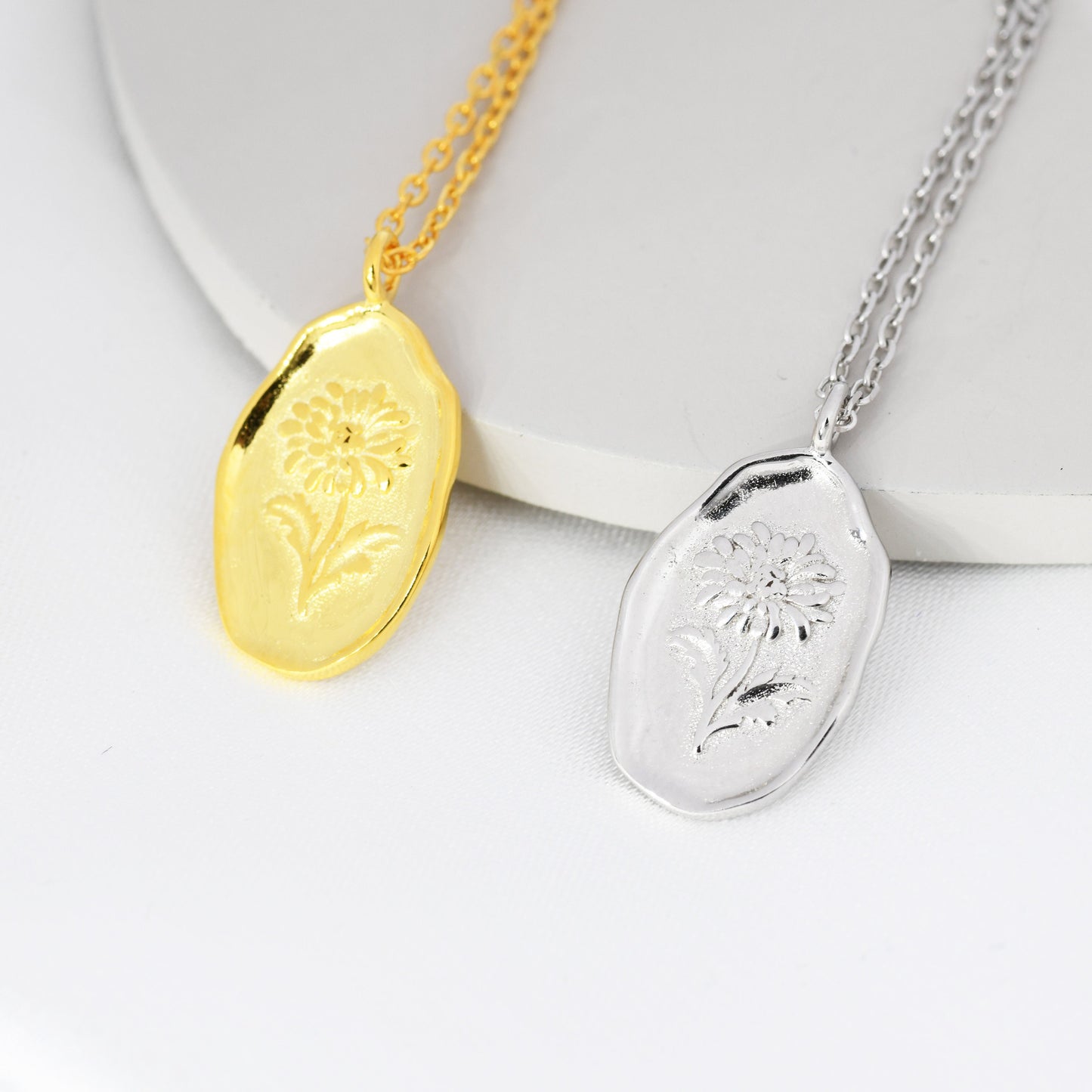 Chrysanthemum Flower Oval Pendant Necklace in Sterling Silver, Silver or Gold, November Birth Flower, Nature Inspired Flower Necklace