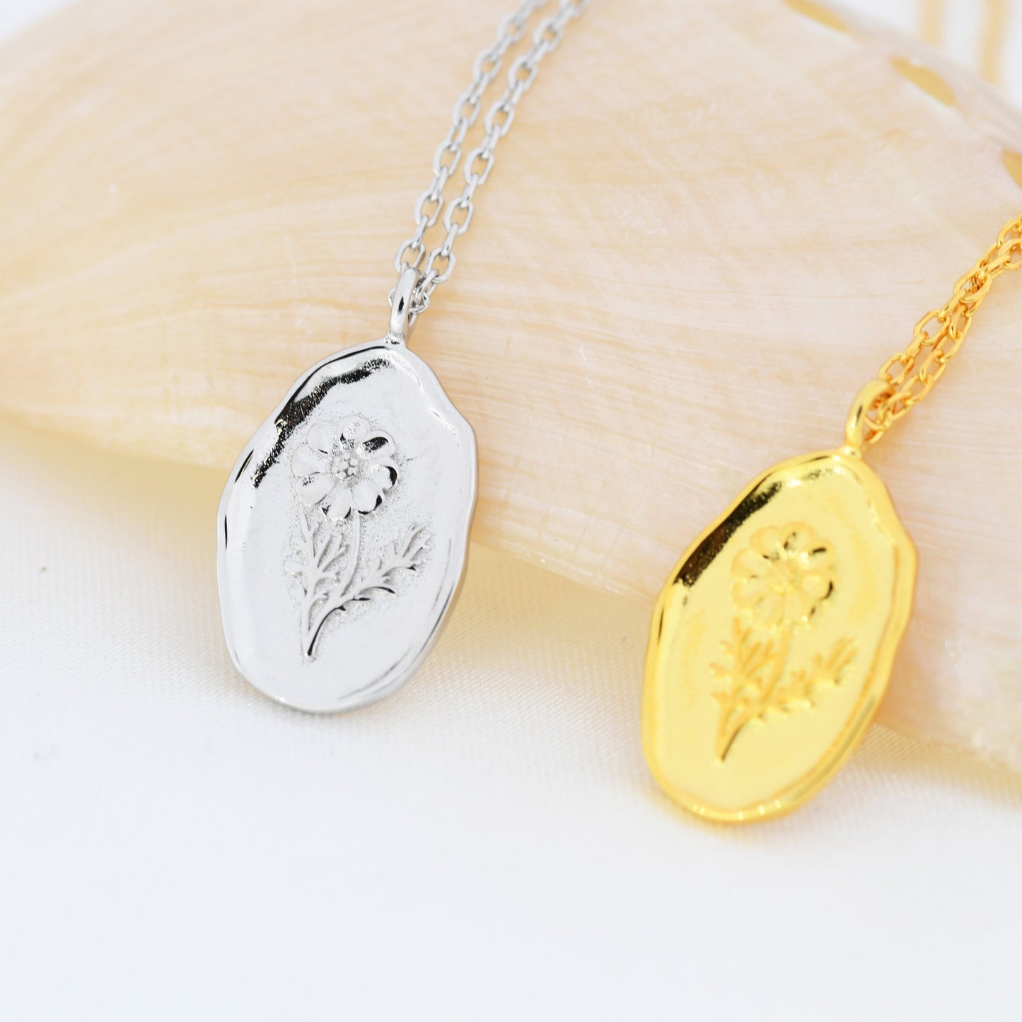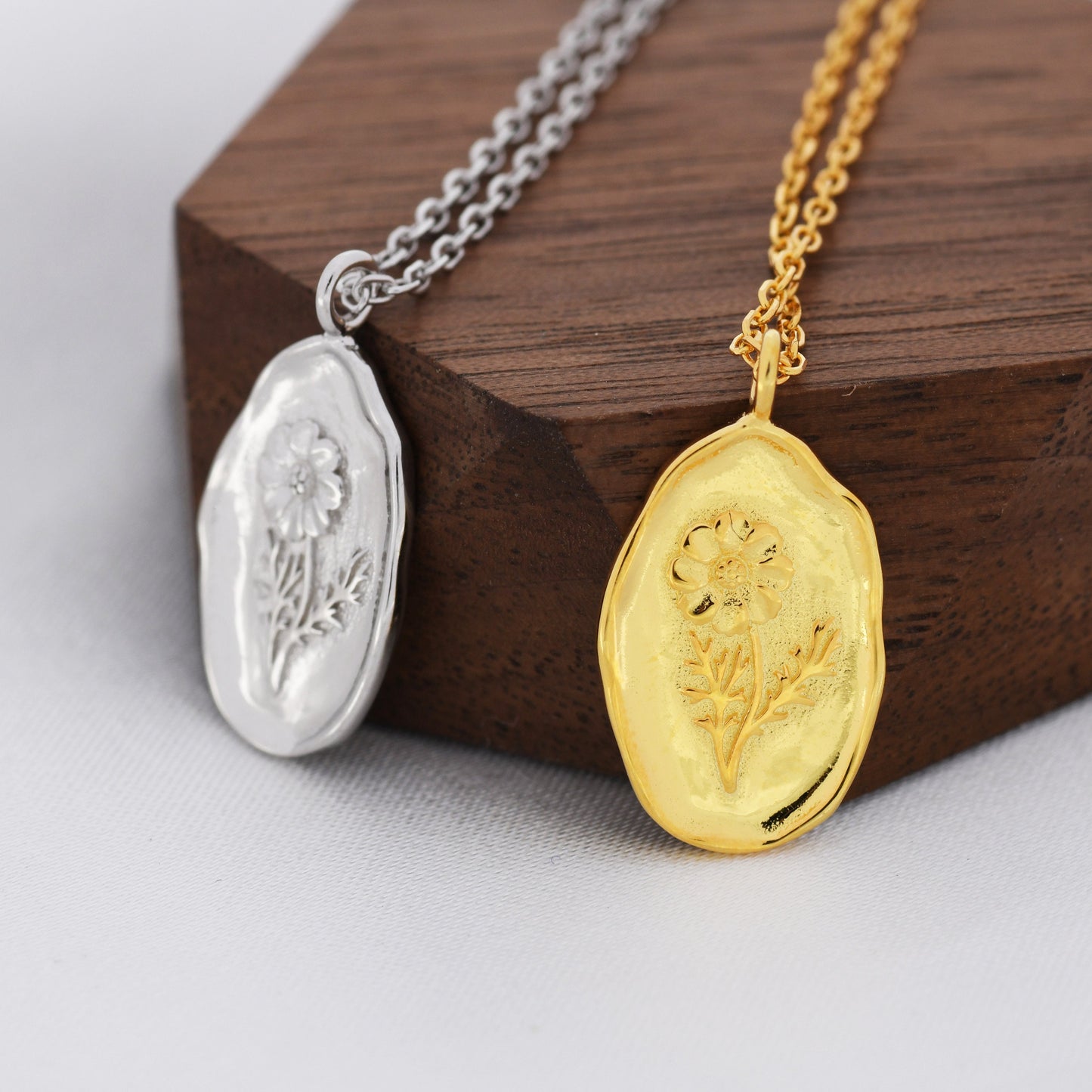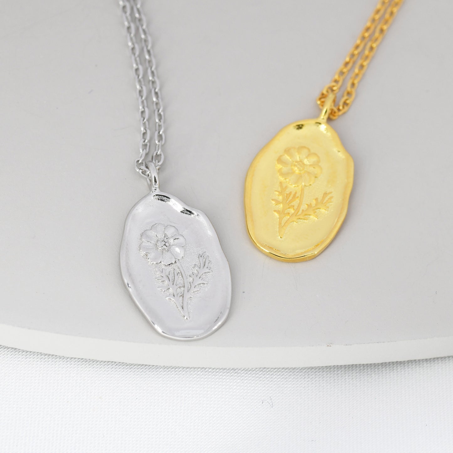 Cosmos Flower Oval Pendant Necklace in Sterling Silver, Silver or Gold, October Birth Flower, Nature Inspired Daisy Flower Disk Necklace