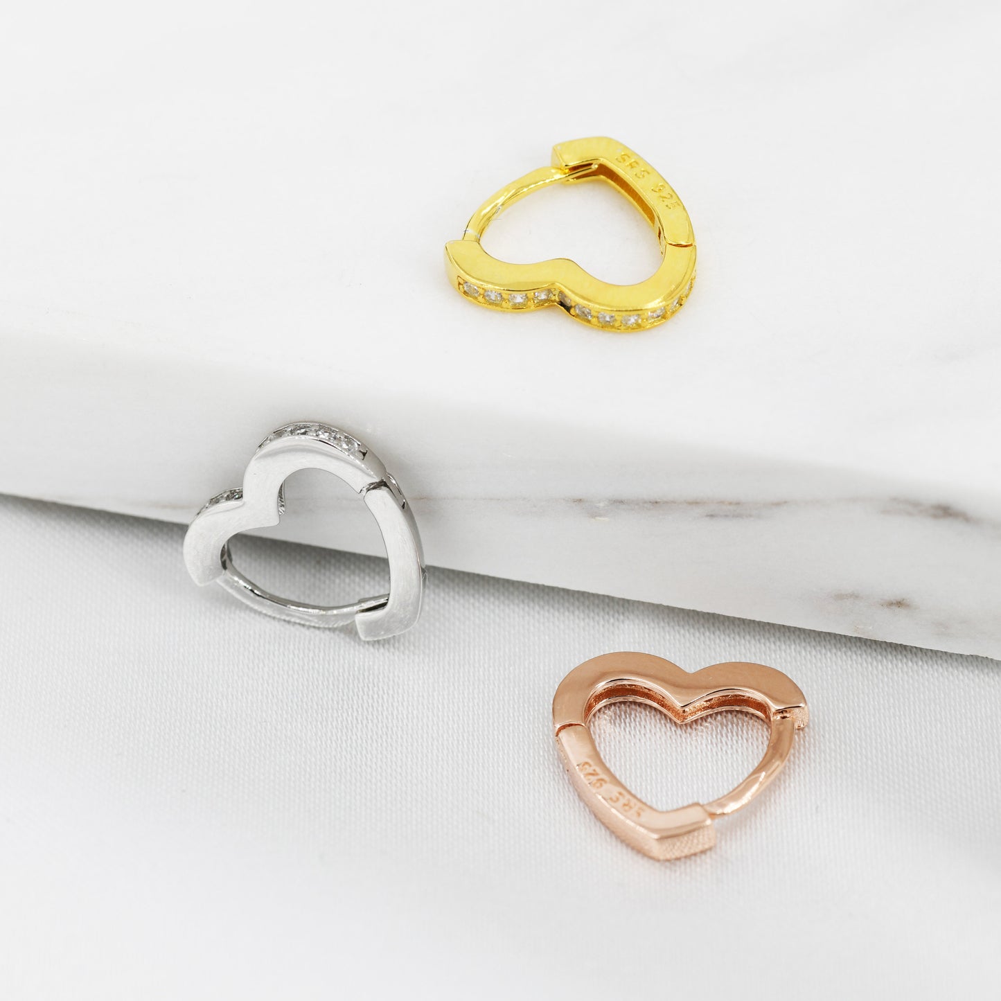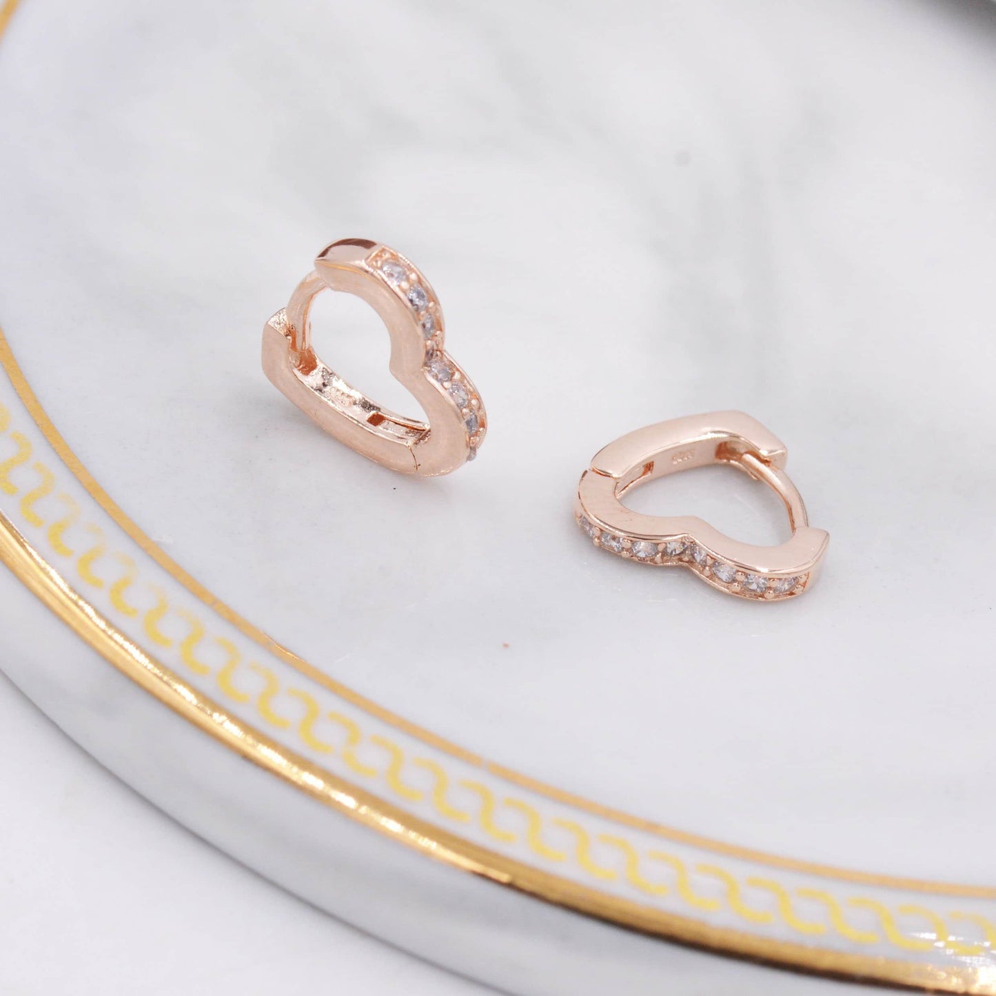 Heart Huggie Hoop Earrings, Rose Gold Plated Sterling Silver with CZ Crystals, Minimalist Geometric Design.