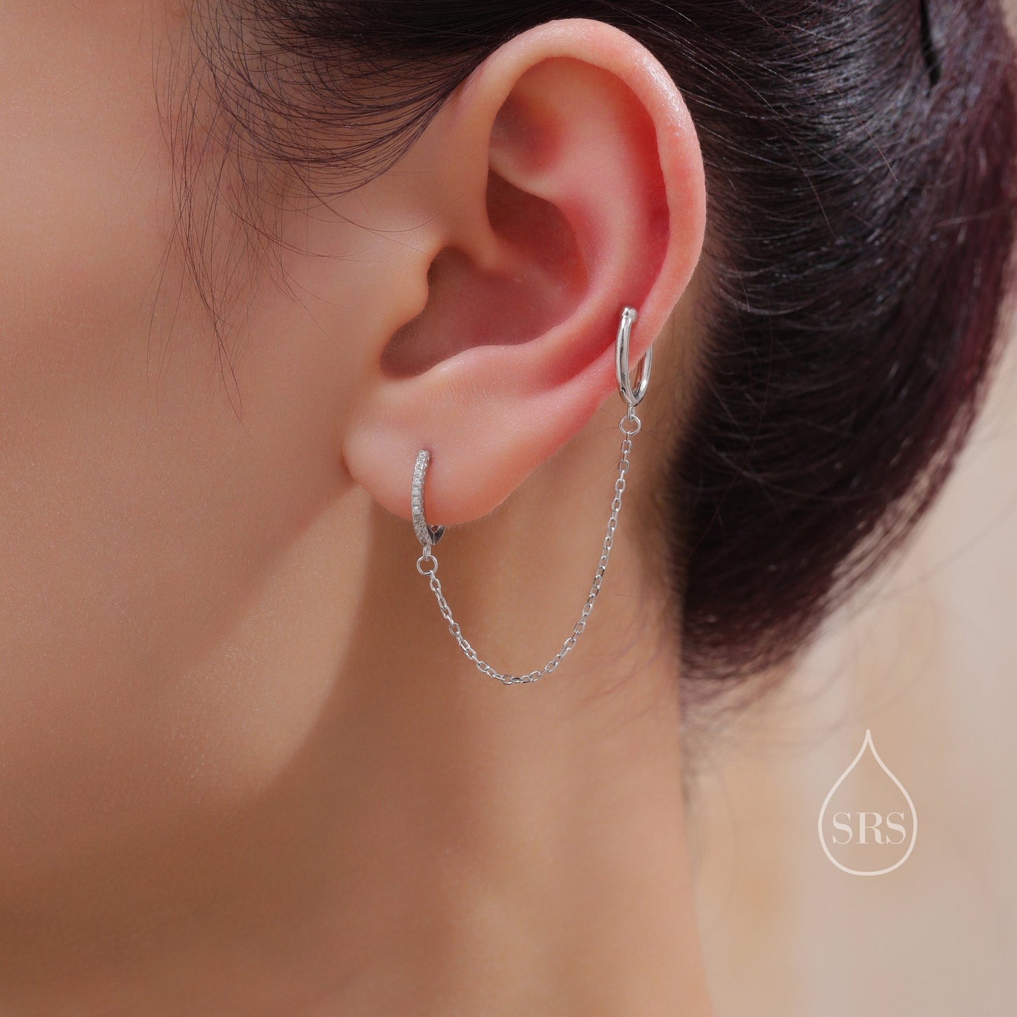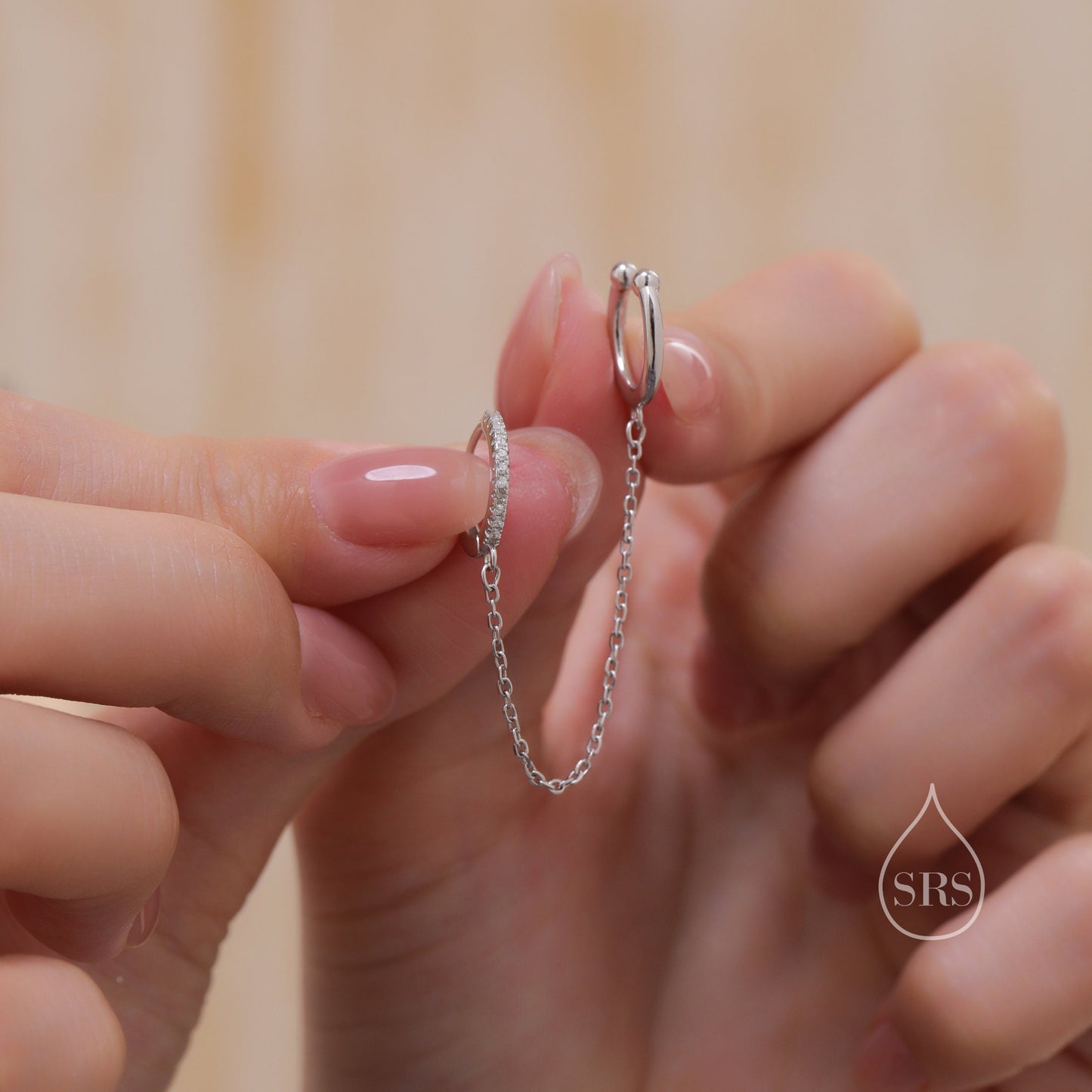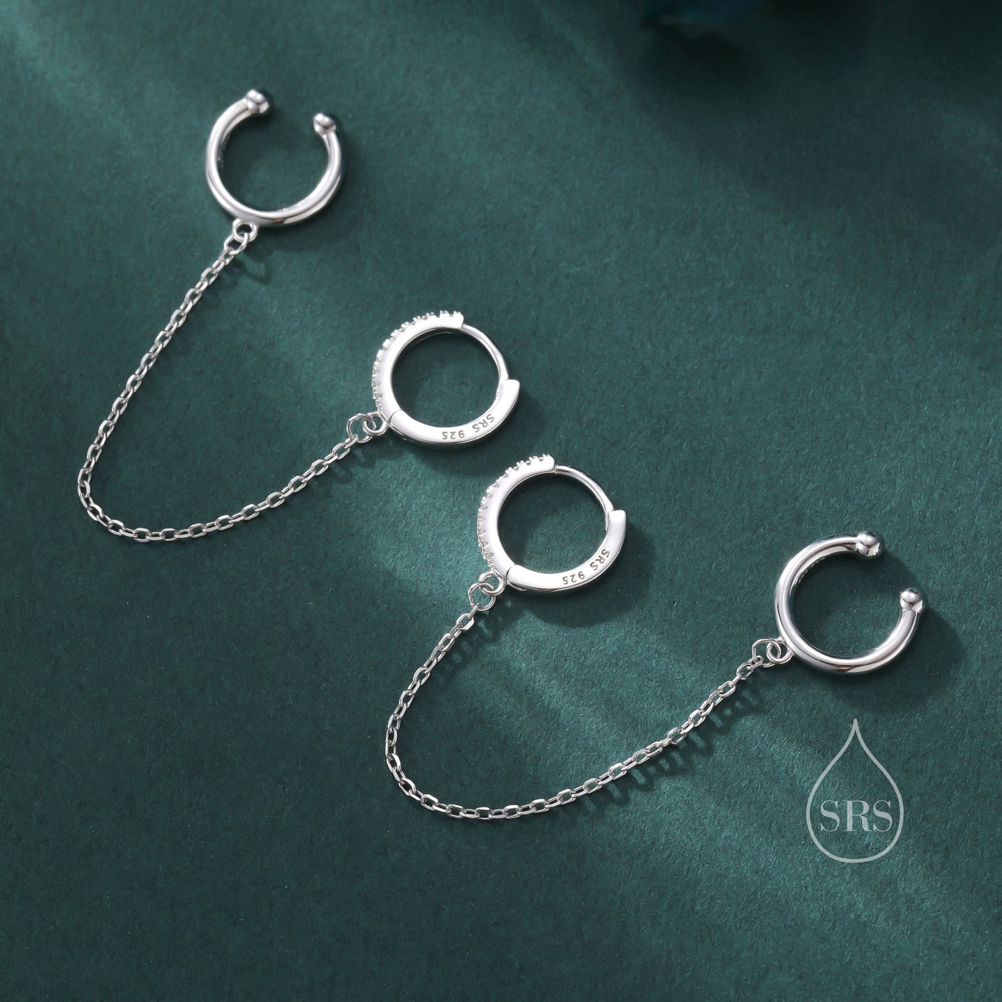 CZ Hoop and Cuff Huggie Hoop Earrings in Sterling Silver, Available in Silver, Gold or Rose Gold, Chain Dangle Earrings, Chain Hoops