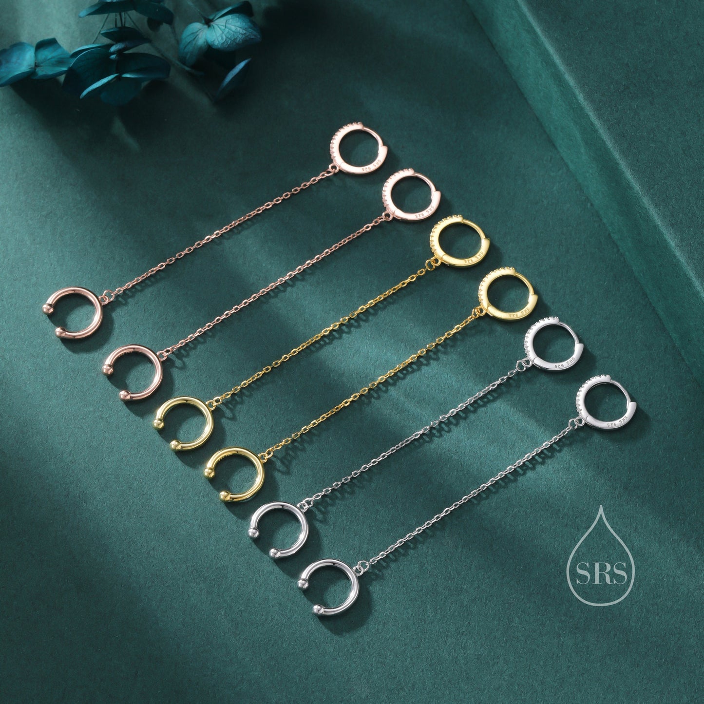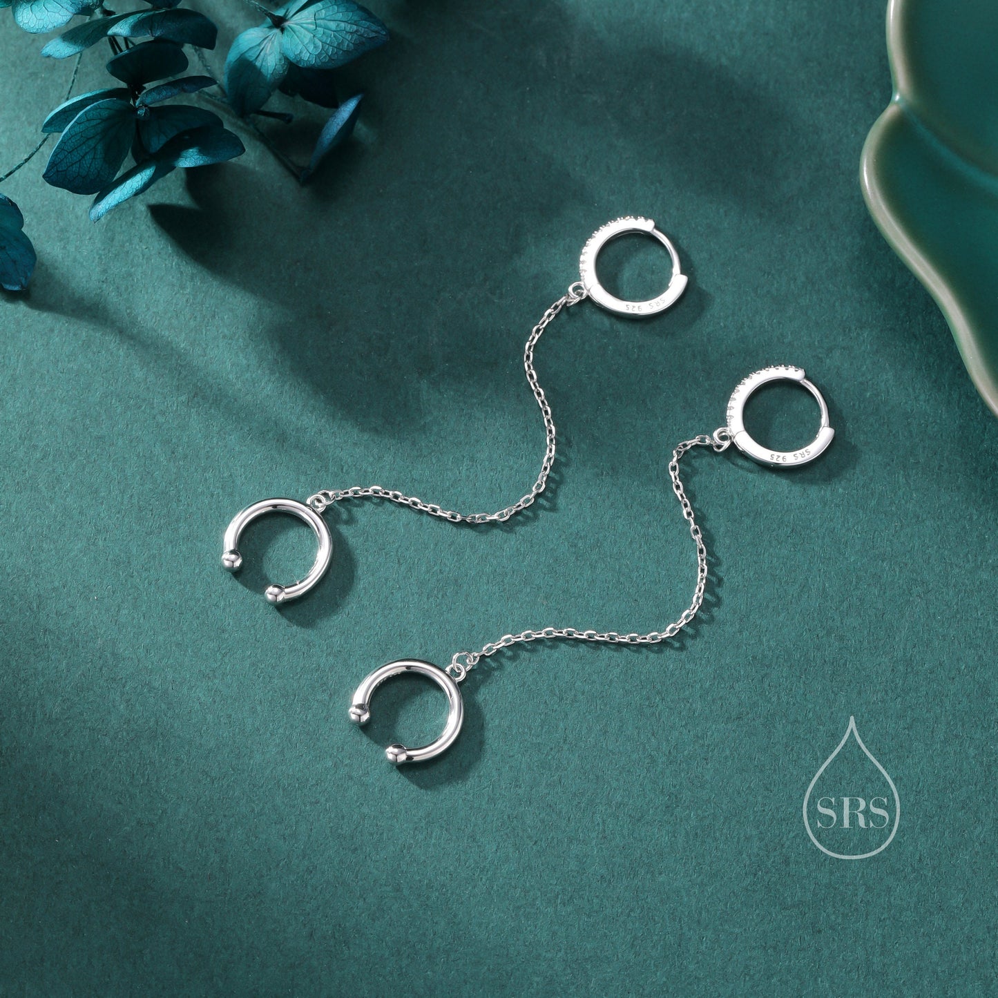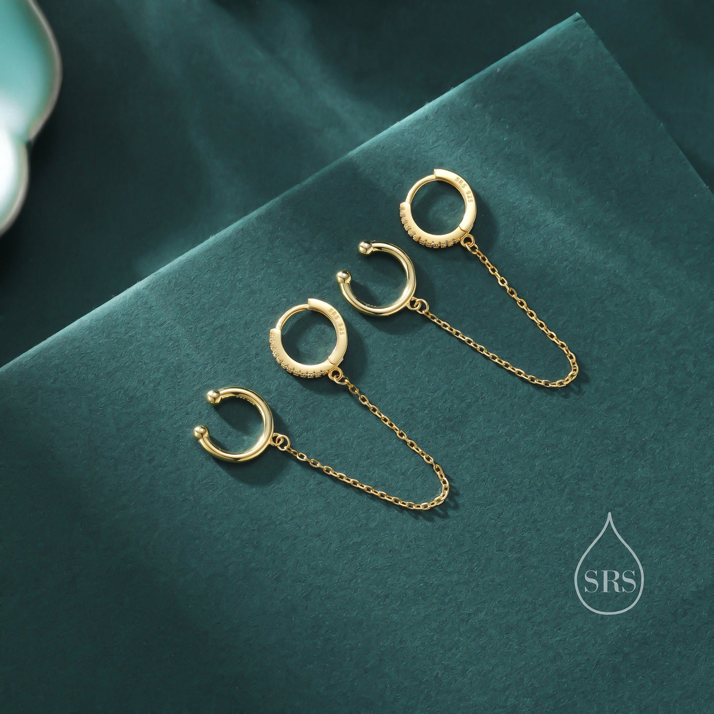 CZ Hoop and Cuff Huggie Hoop Earrings in Sterling Silver, Available in Silver, Gold or Rose Gold, Chain Dangle Earrings, Chain Hoops
