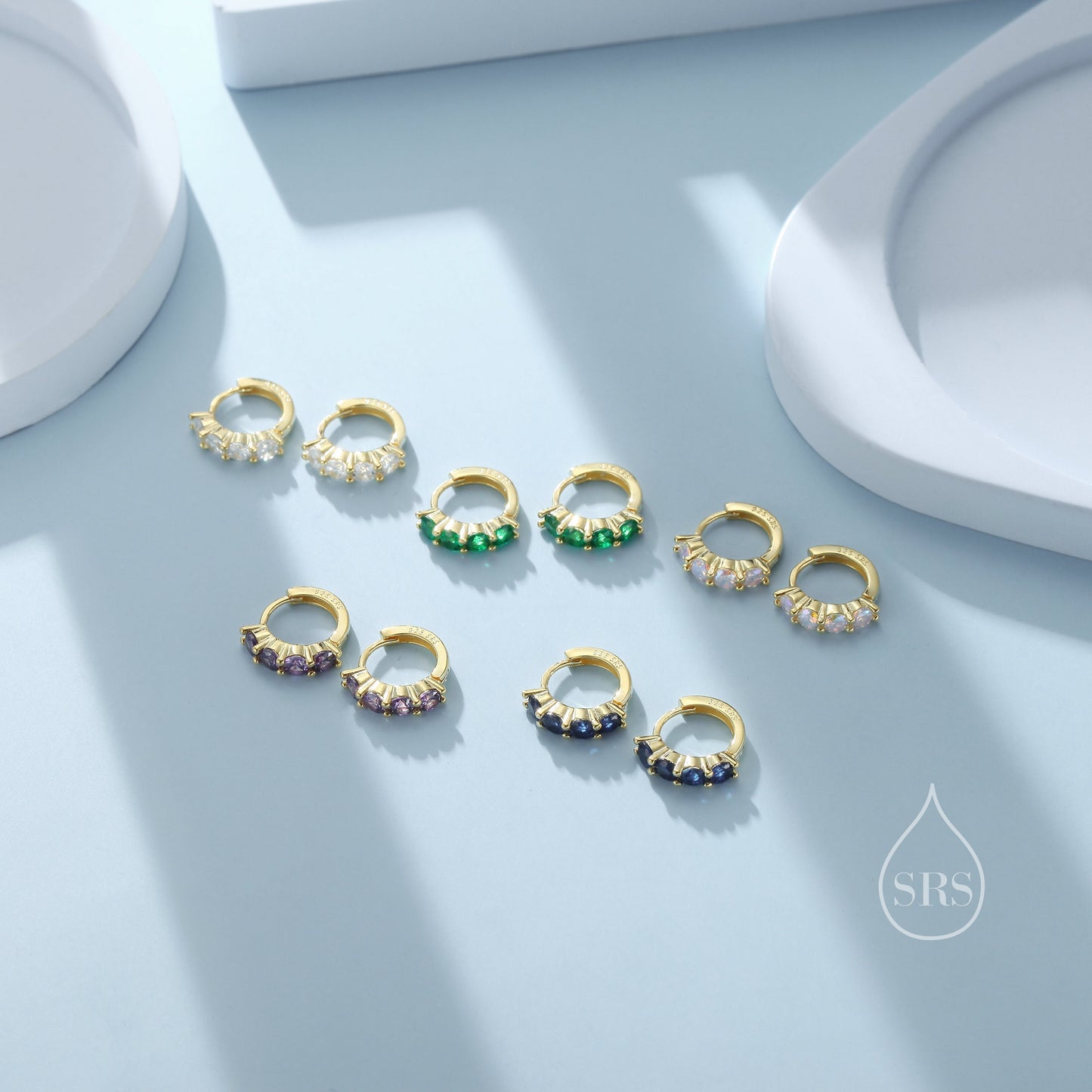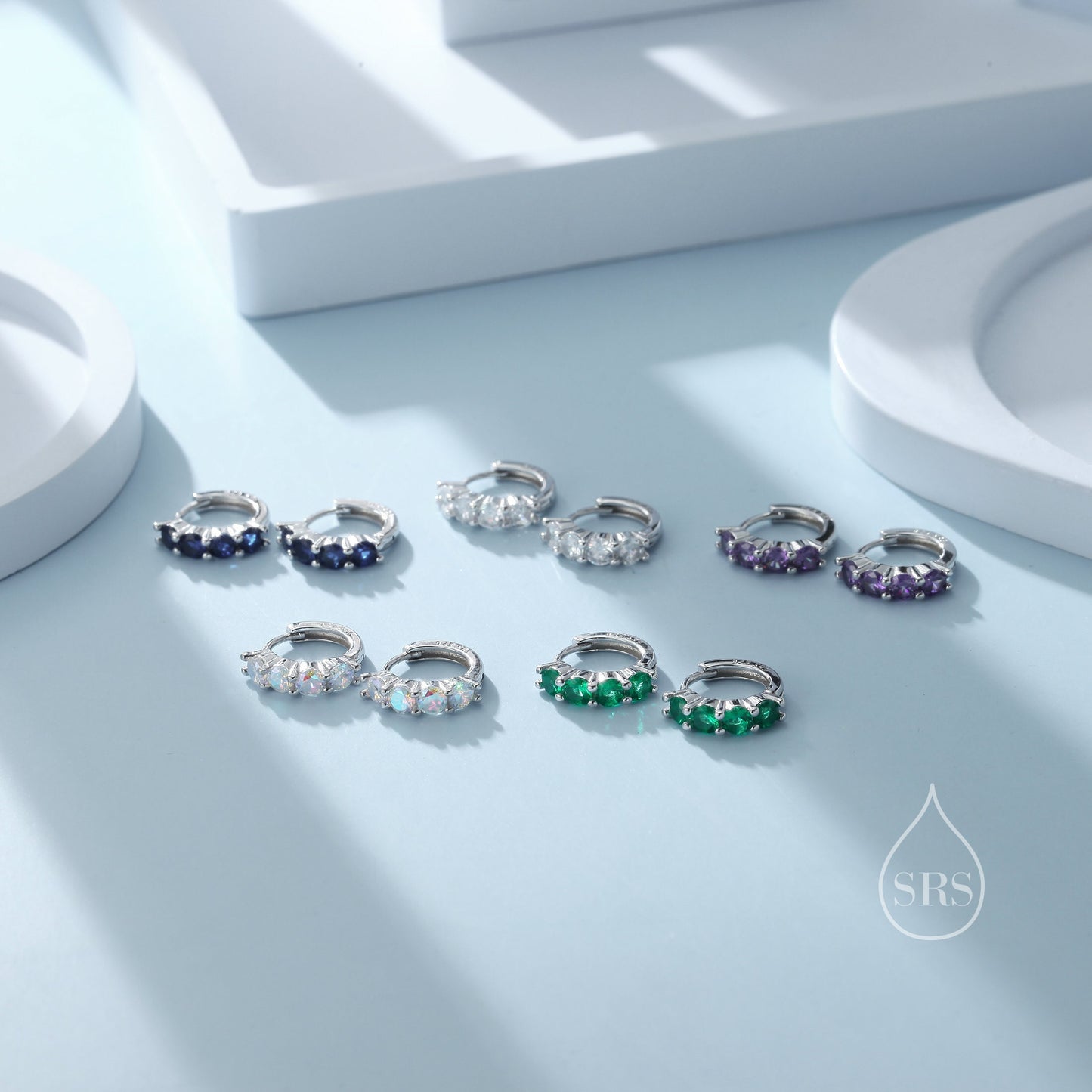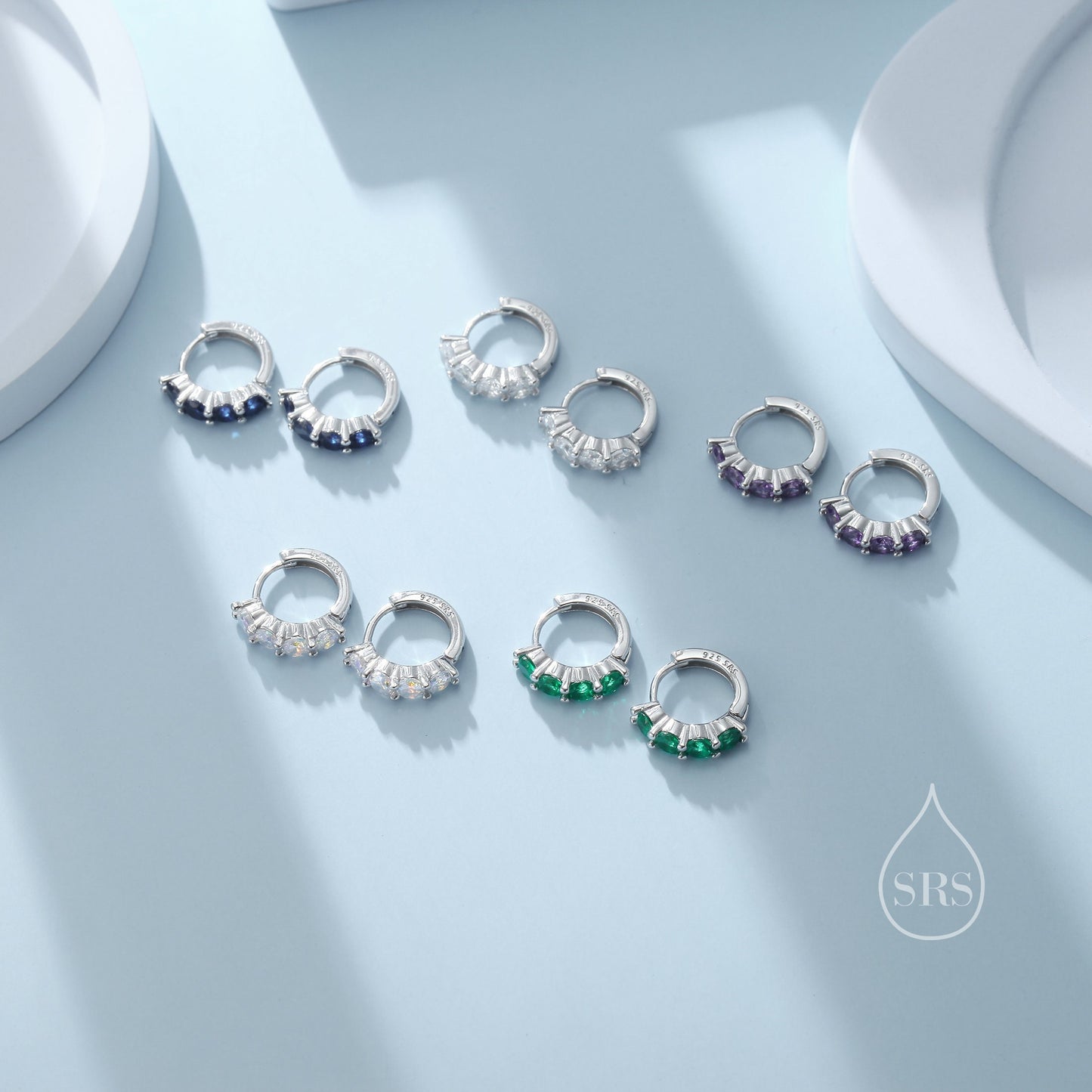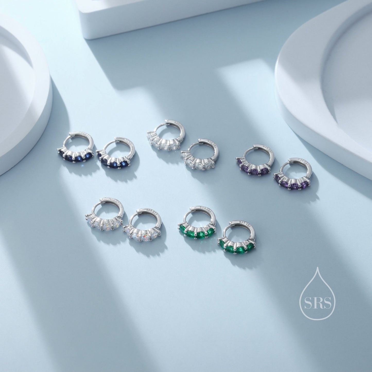 CZ Huggie Hoop Earrings in Sterling Silver, 8mm Hoops, Silver or Gold, 4mm Geometric Hoop Earrings, Green, Blue, Purple, Rainbow or Clear CZ