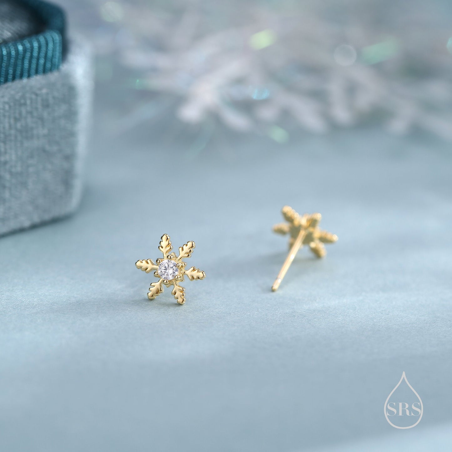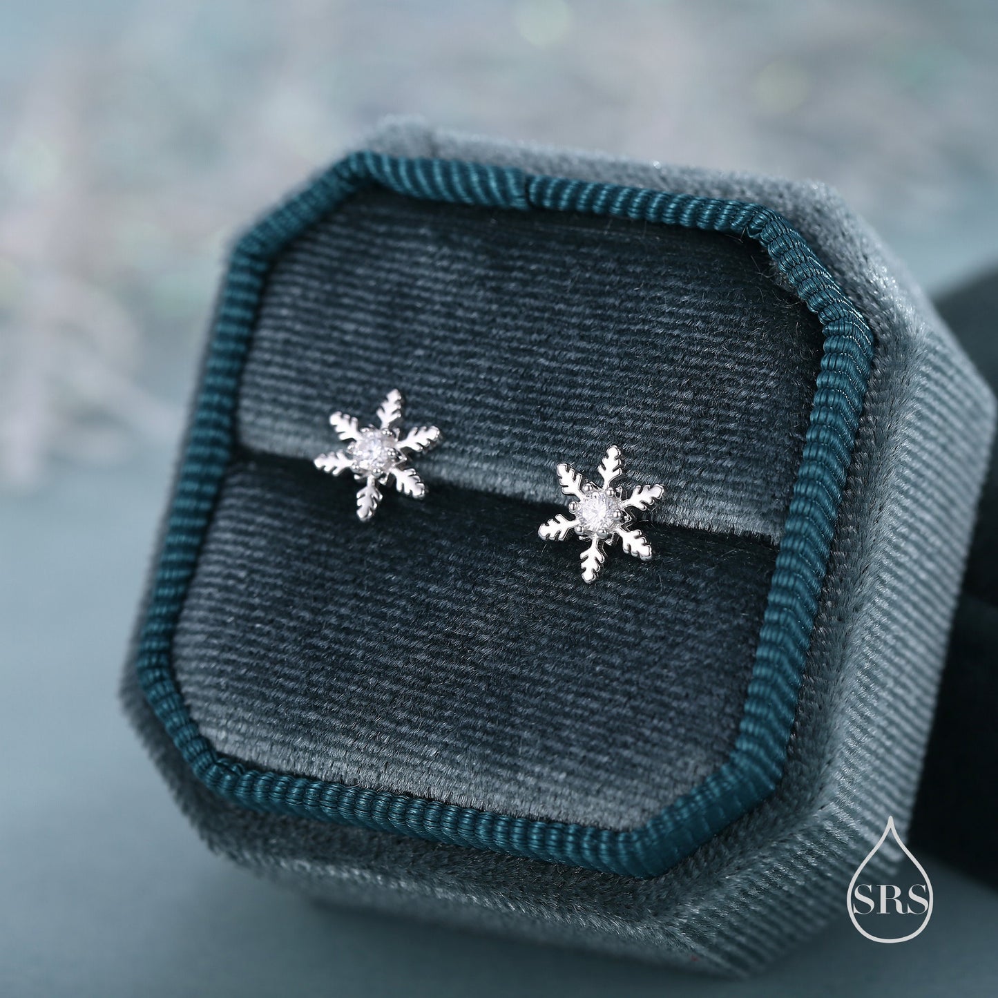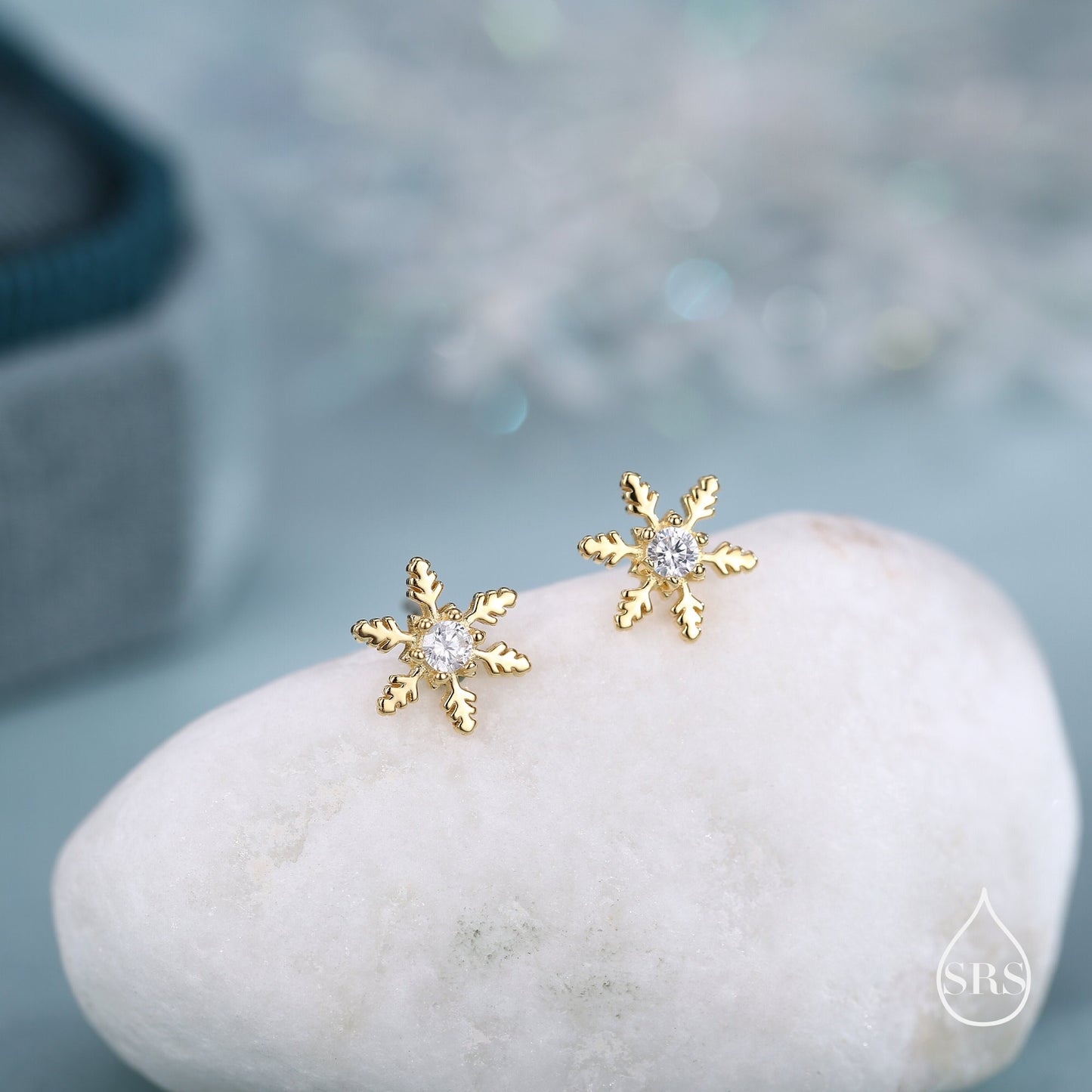 CZ Snowflake Stud Earrings in Sterling Silver, Small Snow Earrings, Available in Three Finishes - Silver, Gold and Rose Gold