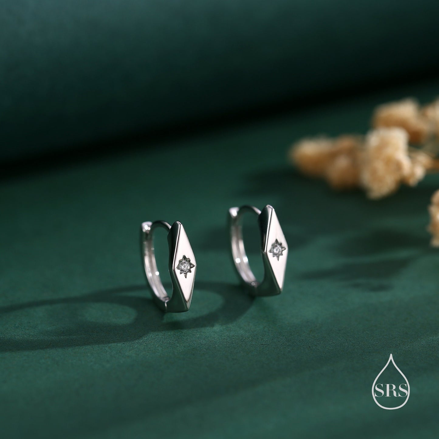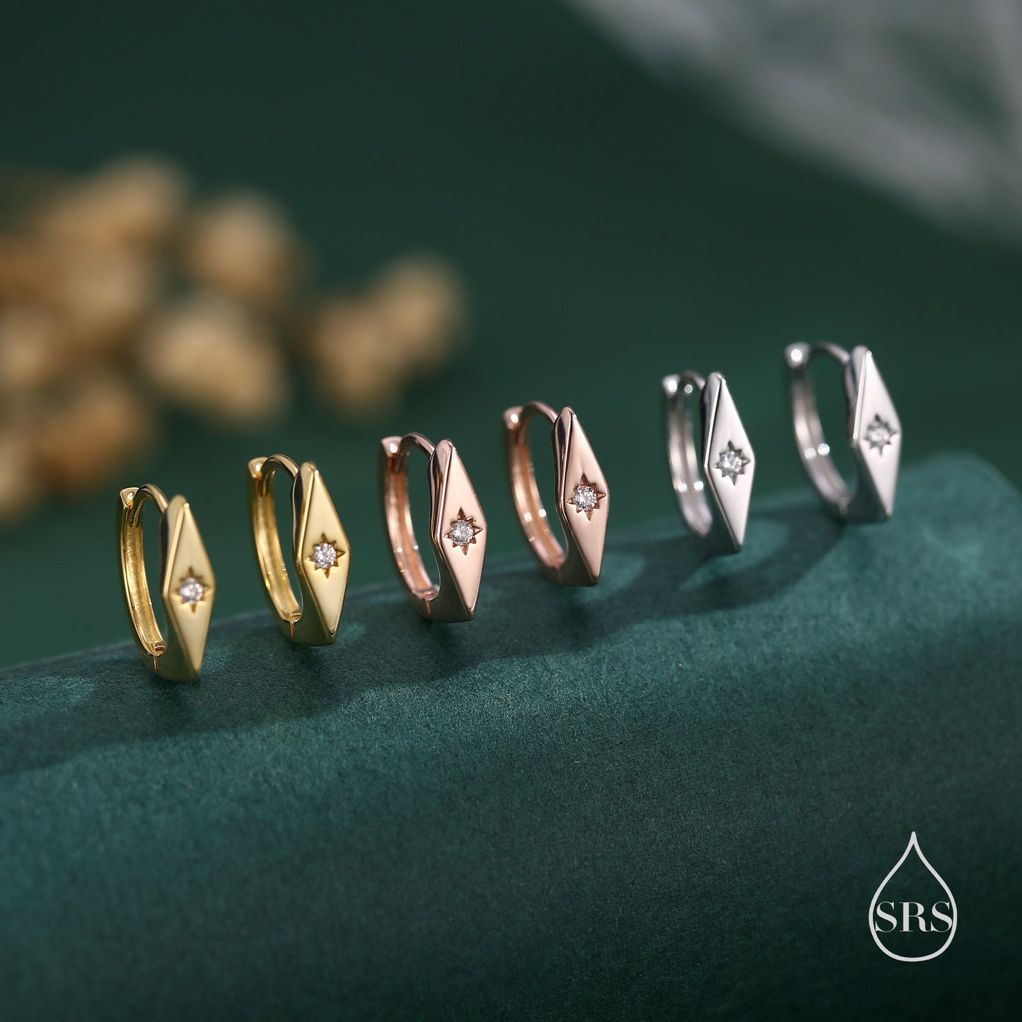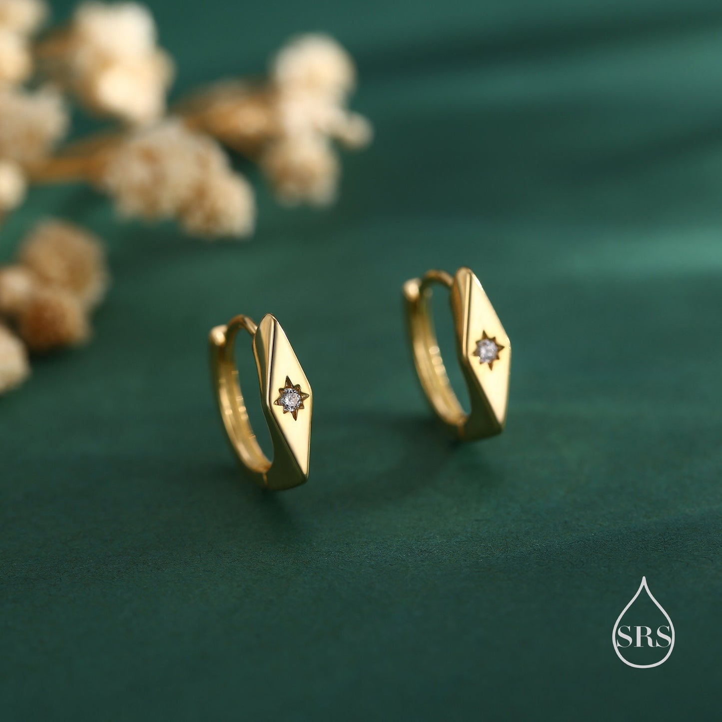 CZ Starburst Rhombus Huggie Hoop Earrings in Sterling Silver, Gold or Rose Gold, North Star Earrings, Sunburst Earrings, Celestial