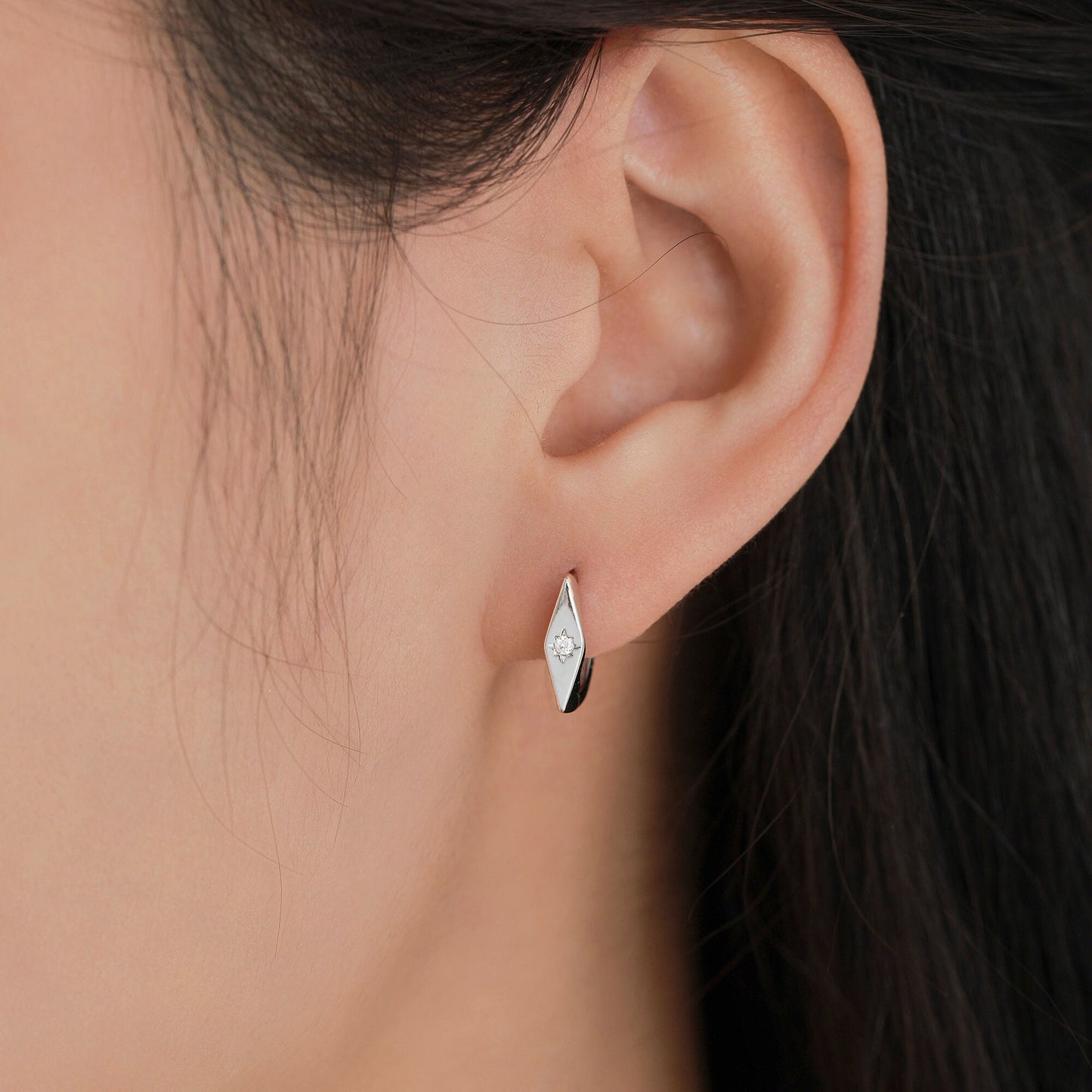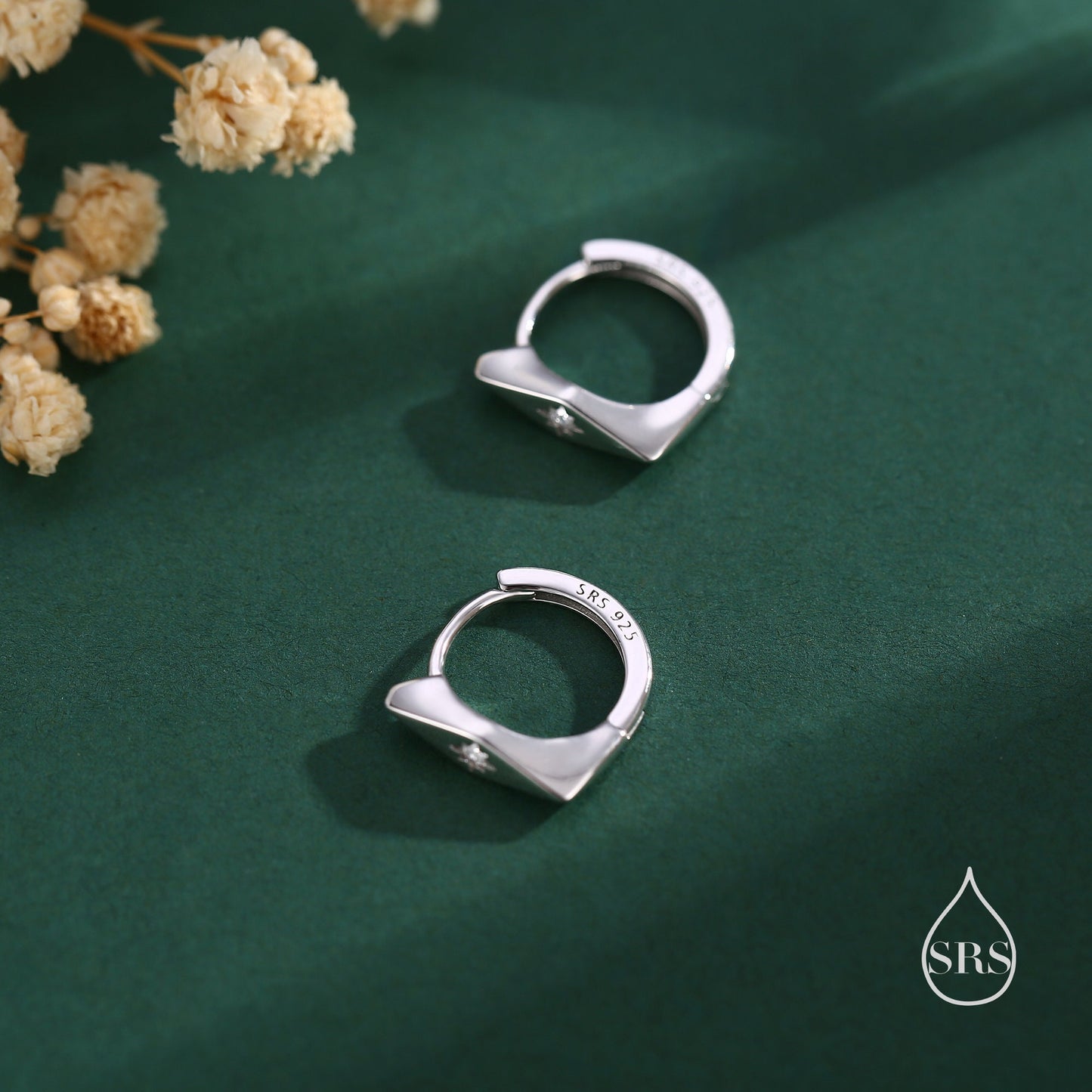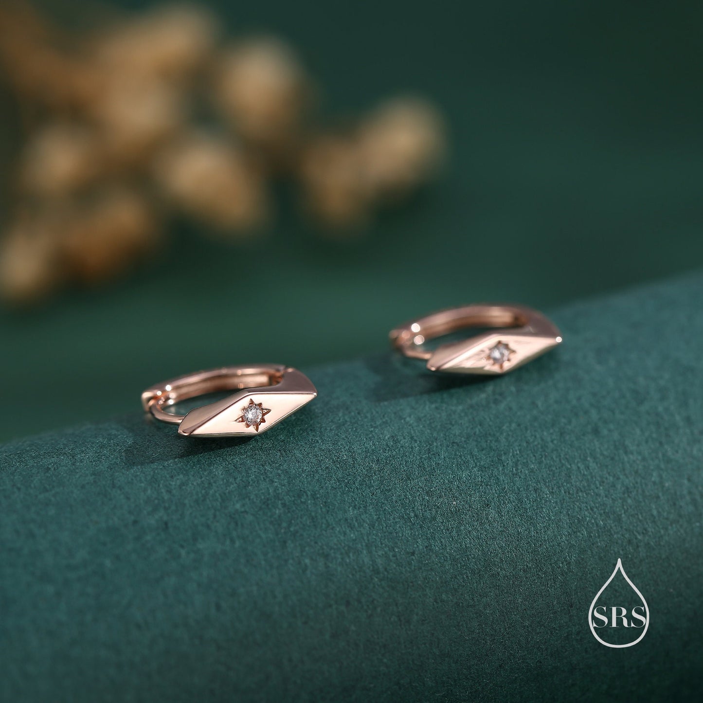 CZ Starburst Rhombus Huggie Hoop Earrings in Sterling Silver, Gold or Rose Gold, North Star Earrings, Sunburst Earrings, Celestial
