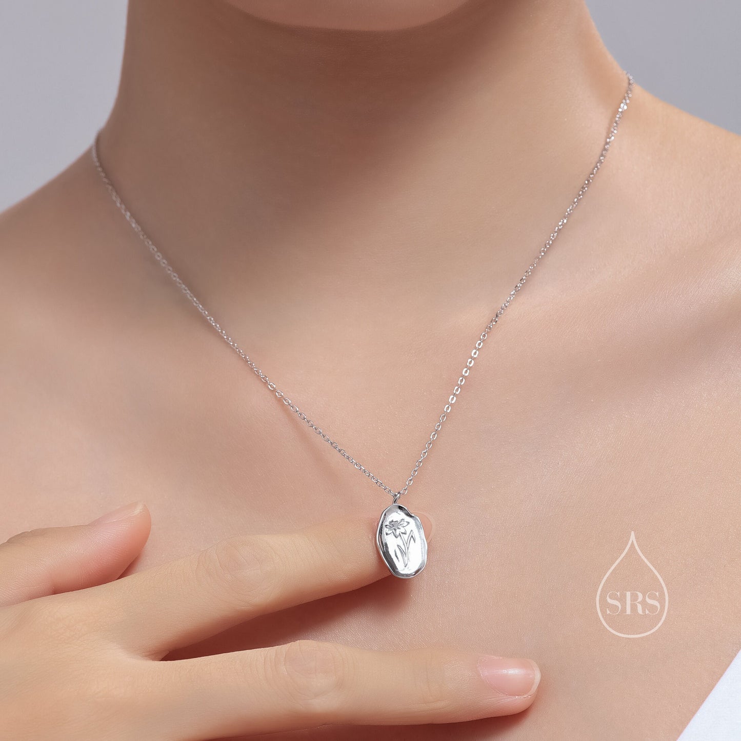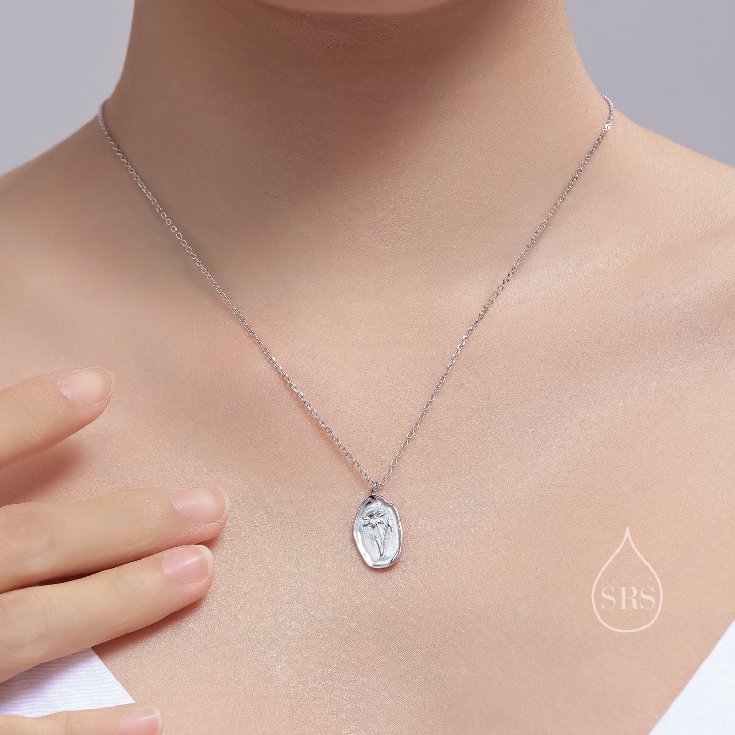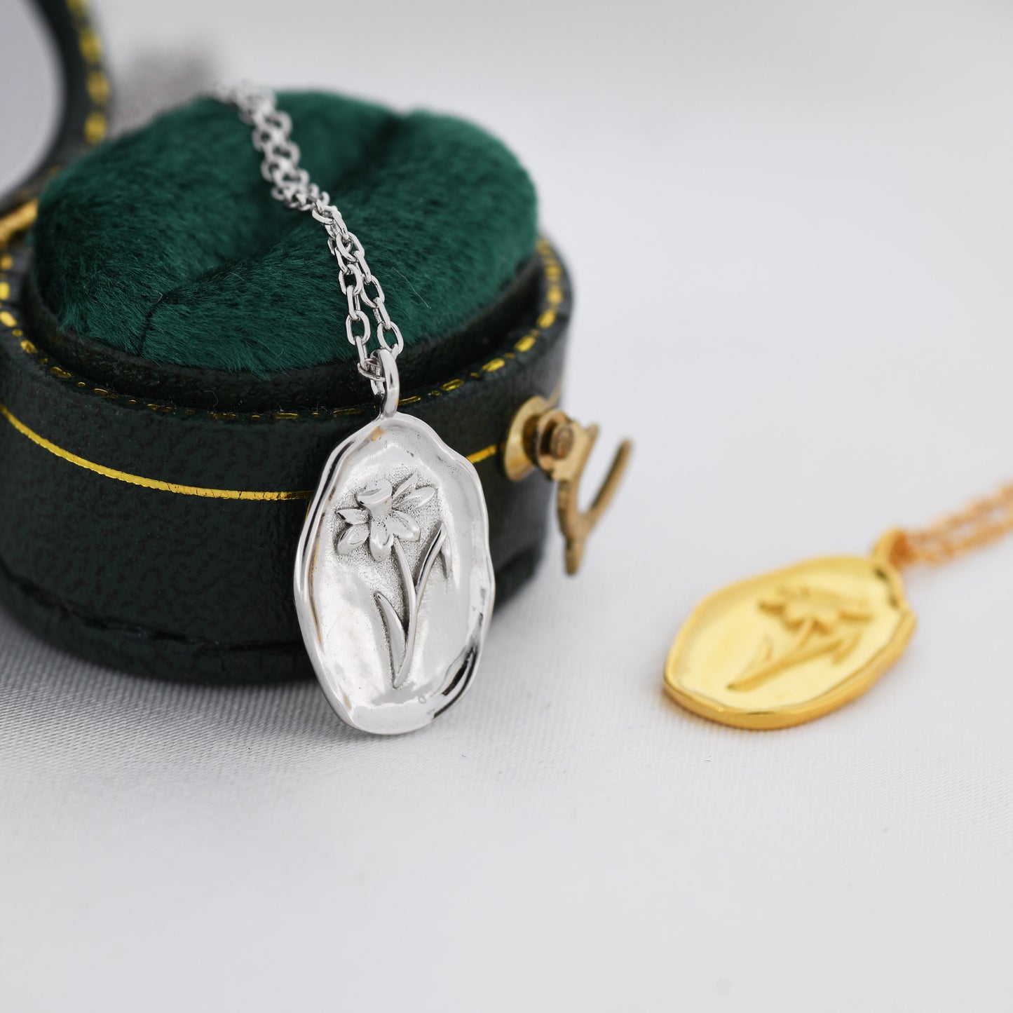 Daffodil Flower Oval Pendant Necklace in Sterling Silver, Silver or Gold, March Birth Flower, Nature Inspired Flower Disk Necklace