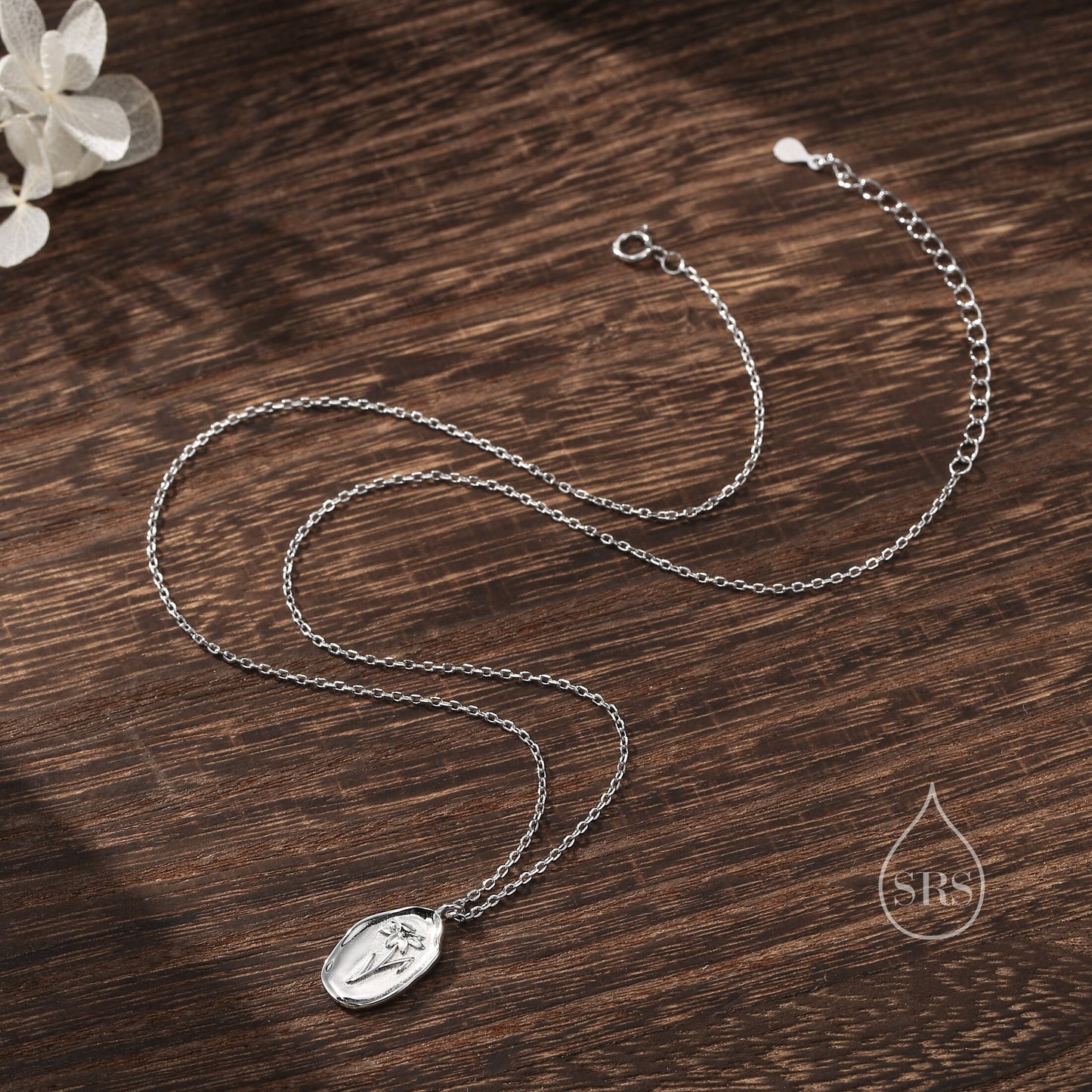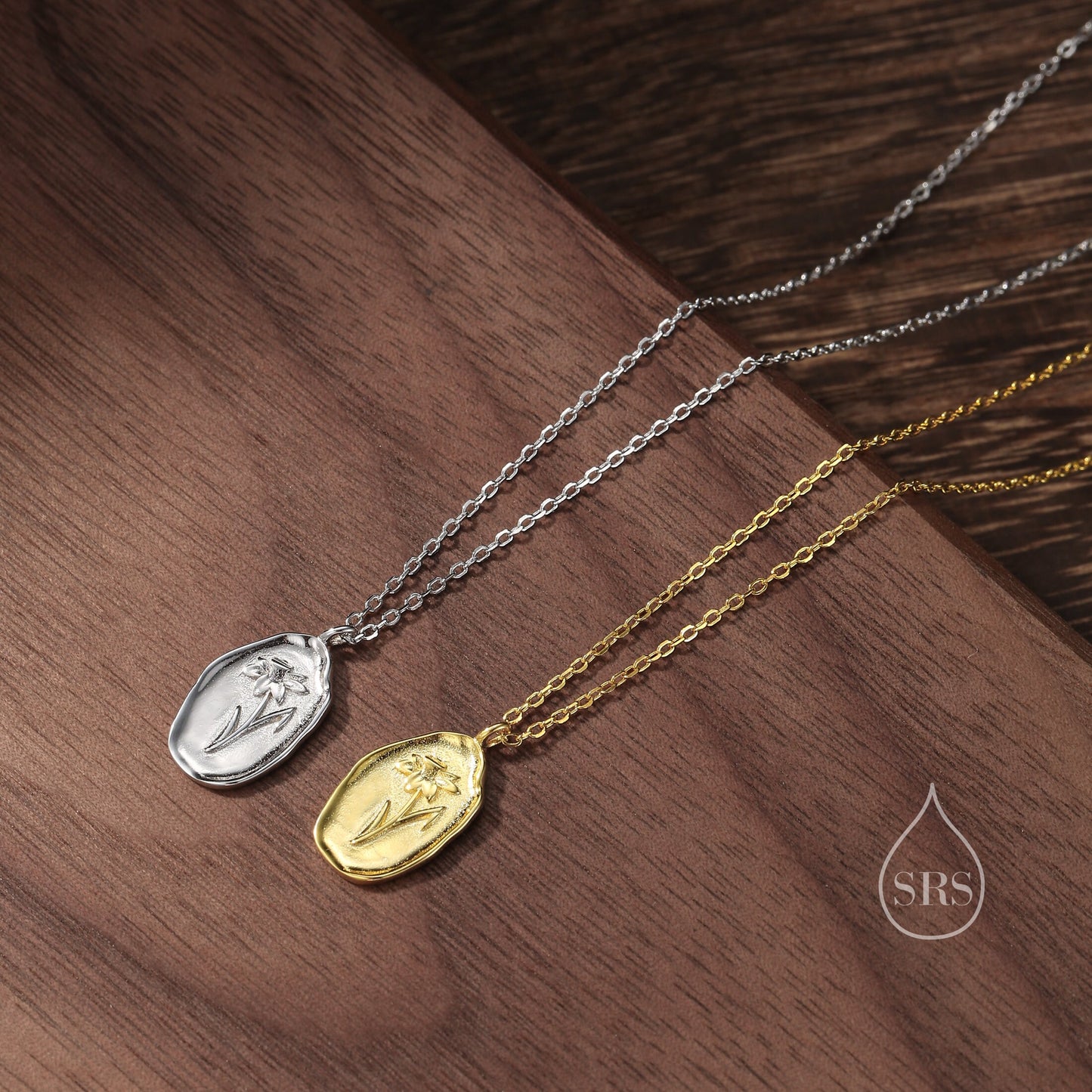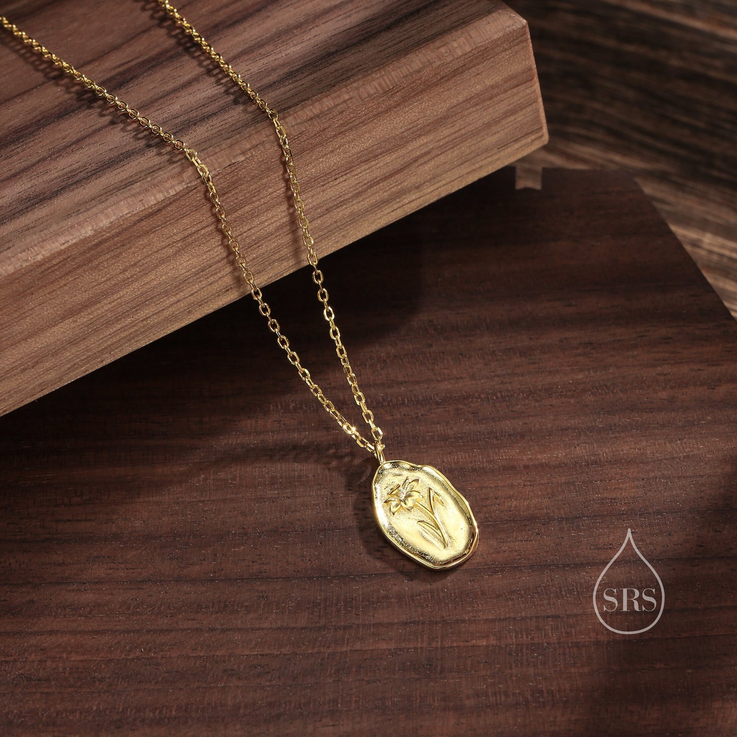 Daffodil Flower Oval Pendant Necklace in Sterling Silver, Silver or Gold, March Birth Flower, Nature Inspired Flower Disk Necklace