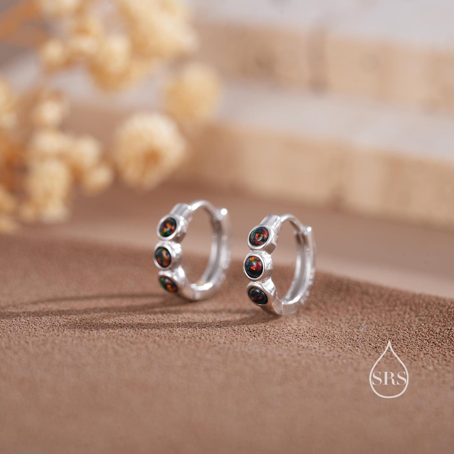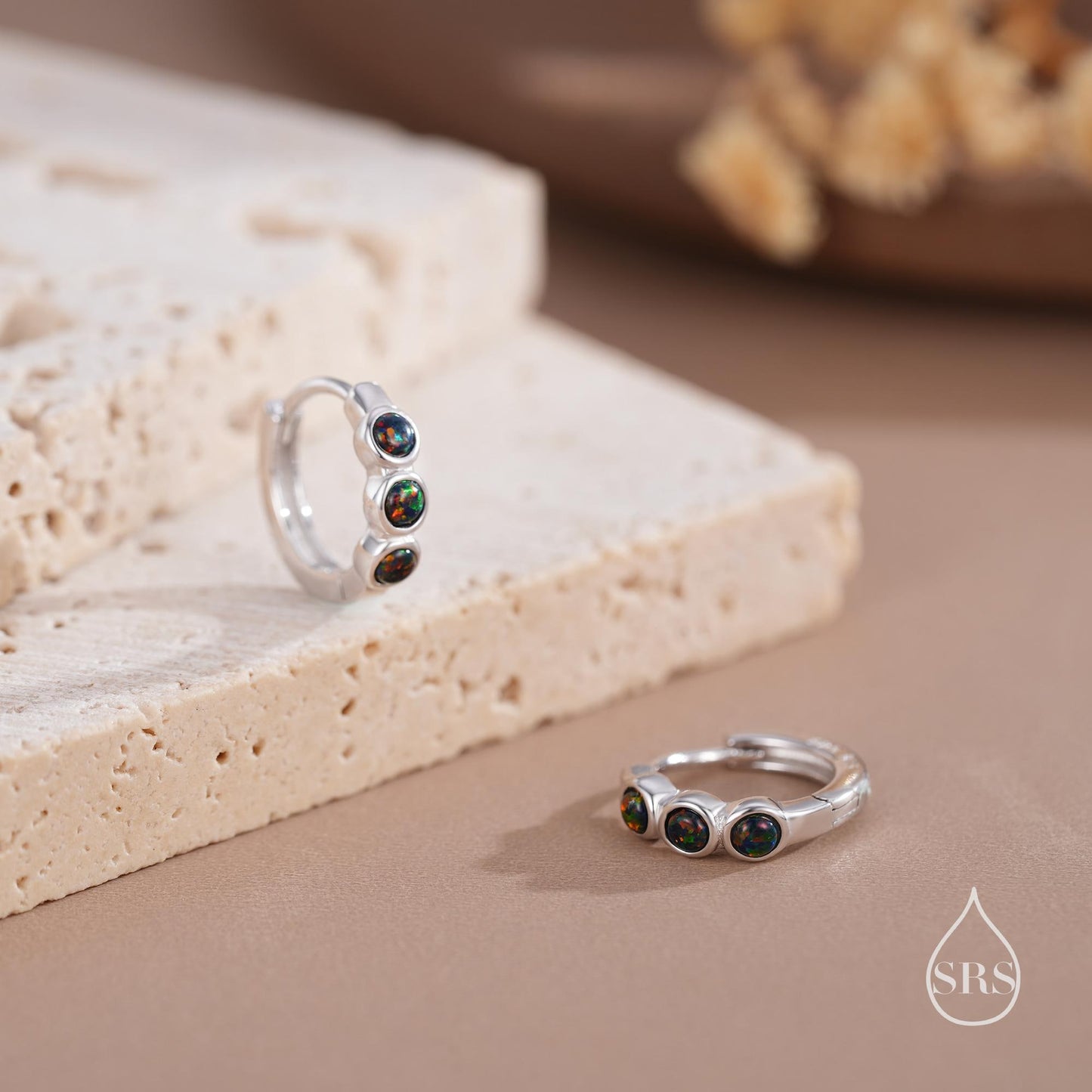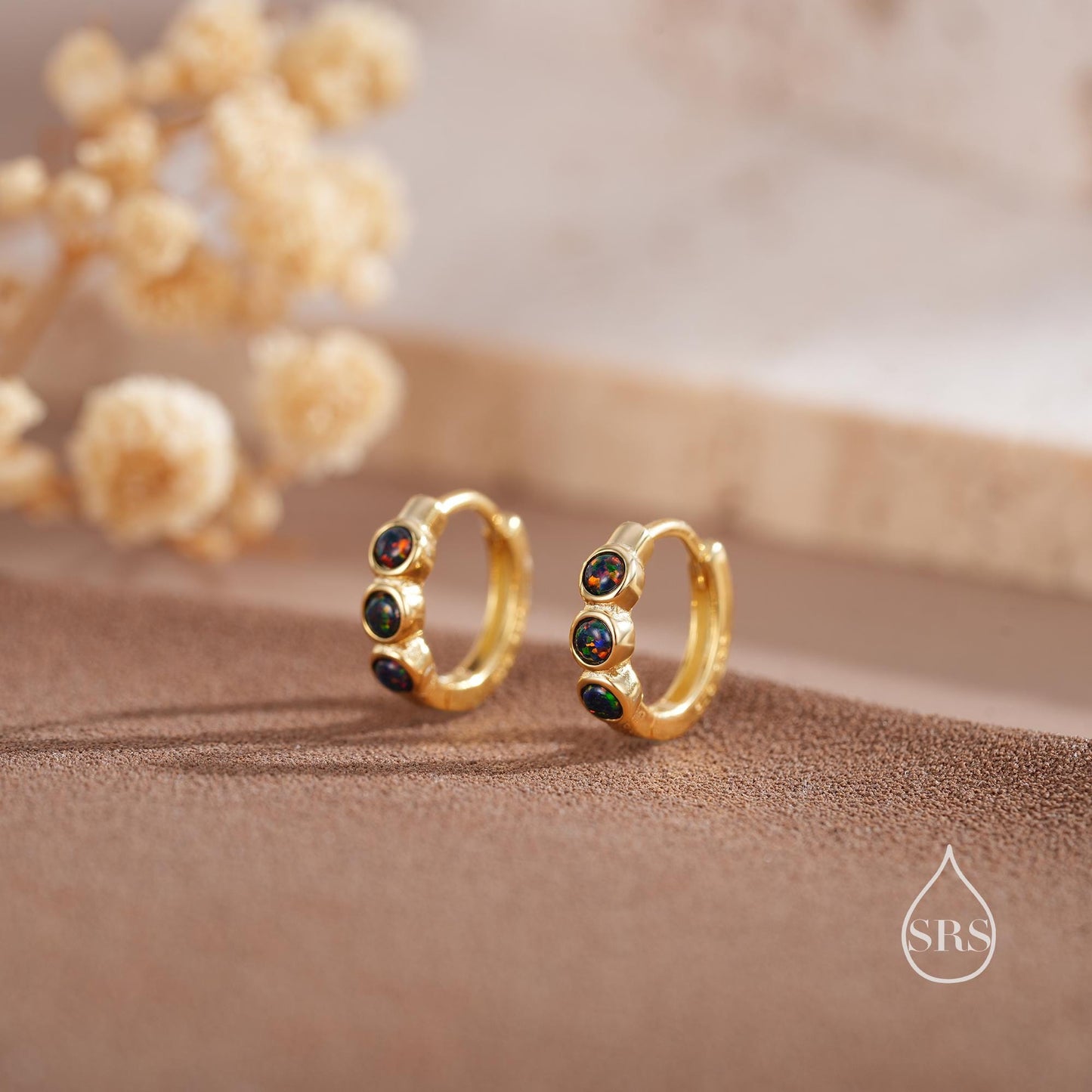 Dainty Black Opal Huggie Hoops in Sterling Silver, 8mm Opal Hoops, Lab Created Black Opal Hoops, Silver or Gold, Tiny Opal Hoops