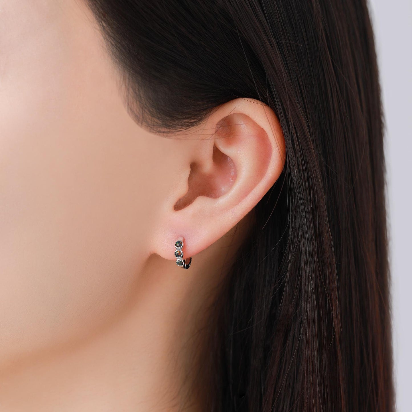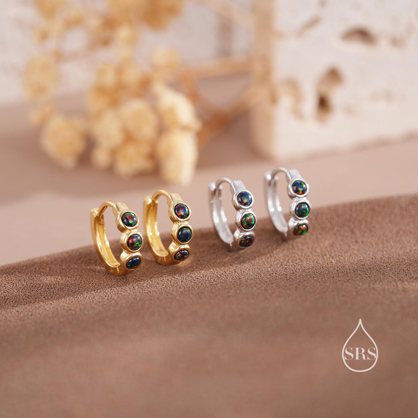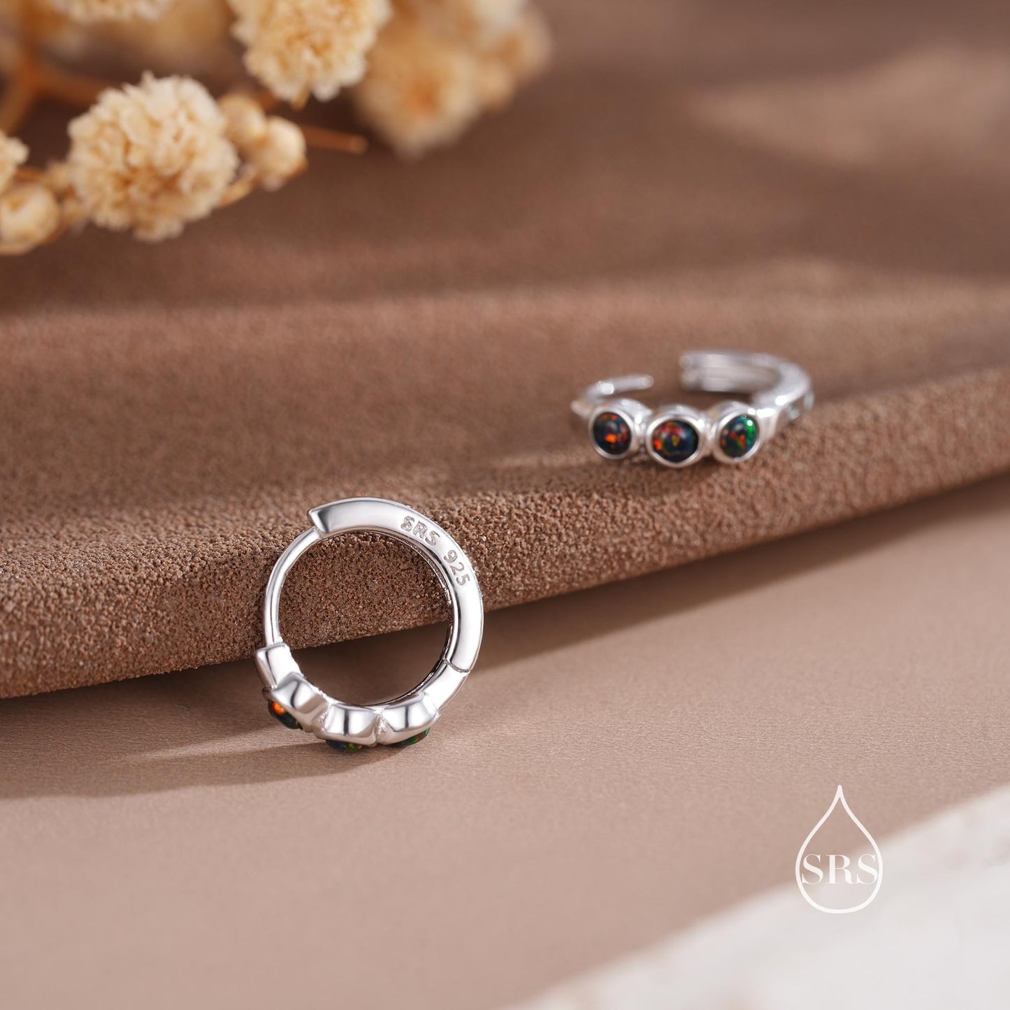 Dainty Black Opal Huggie Hoops in Sterling Silver, 8mm Opal Hoops, Lab Created Black Opal Hoops, Silver or Gold, Tiny Opal Hoops