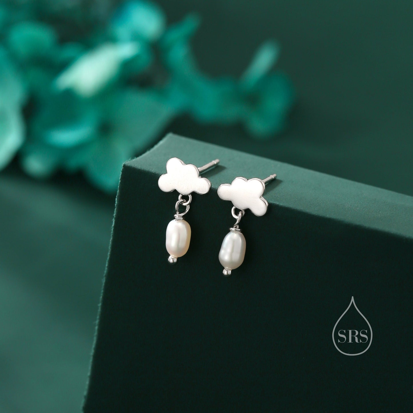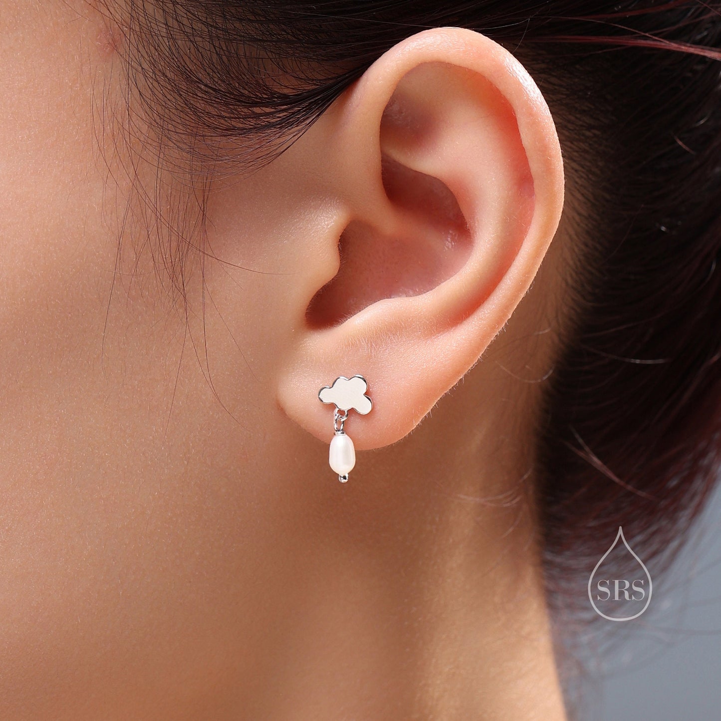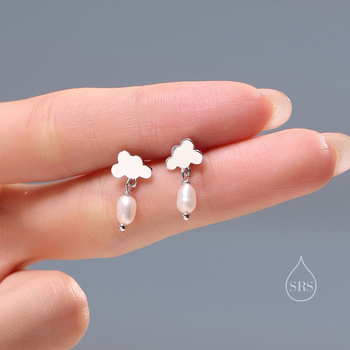 Dainty Cloud and Natural Pearl Raindrop Stud Earrings in Sterling Silver, Silver or Gold, Cloud Earrings, Freshwater Pearl Droplet Earrings
