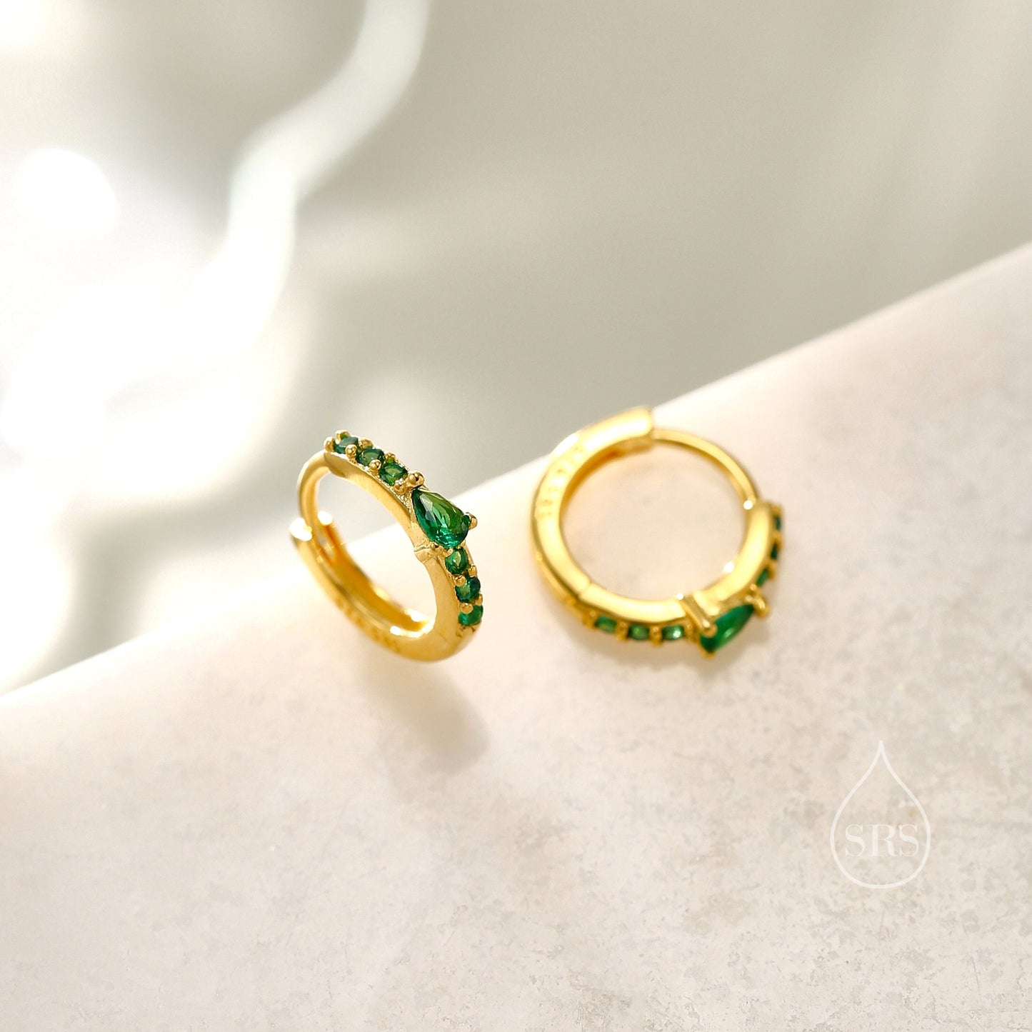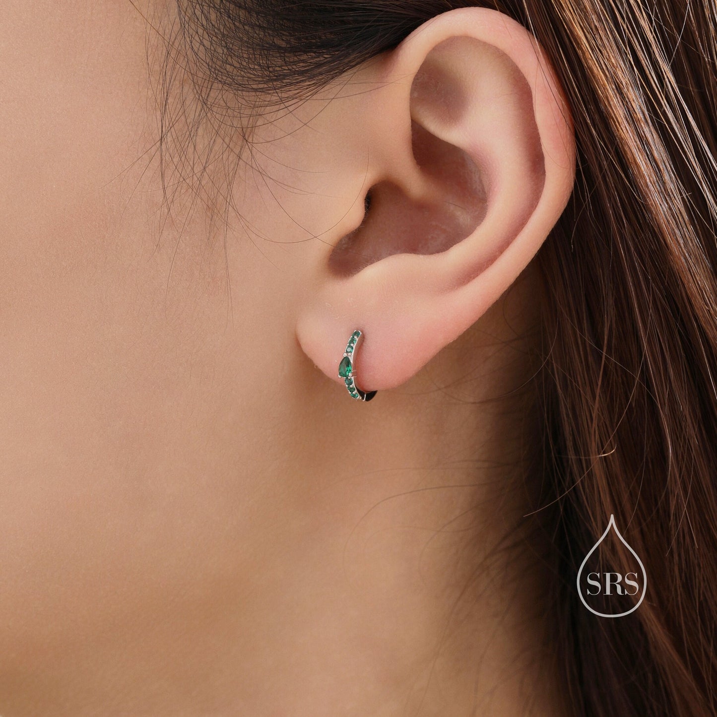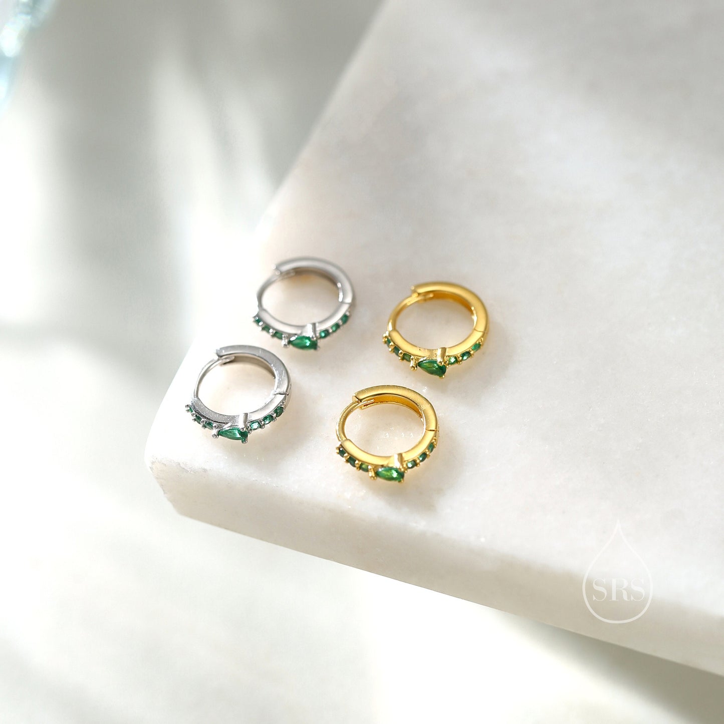 Dainty Green CZ Huggie Hoop Earrings in Sterling Silver with Pear CZ, Silver or Gold, Droplet CZ Hoops
