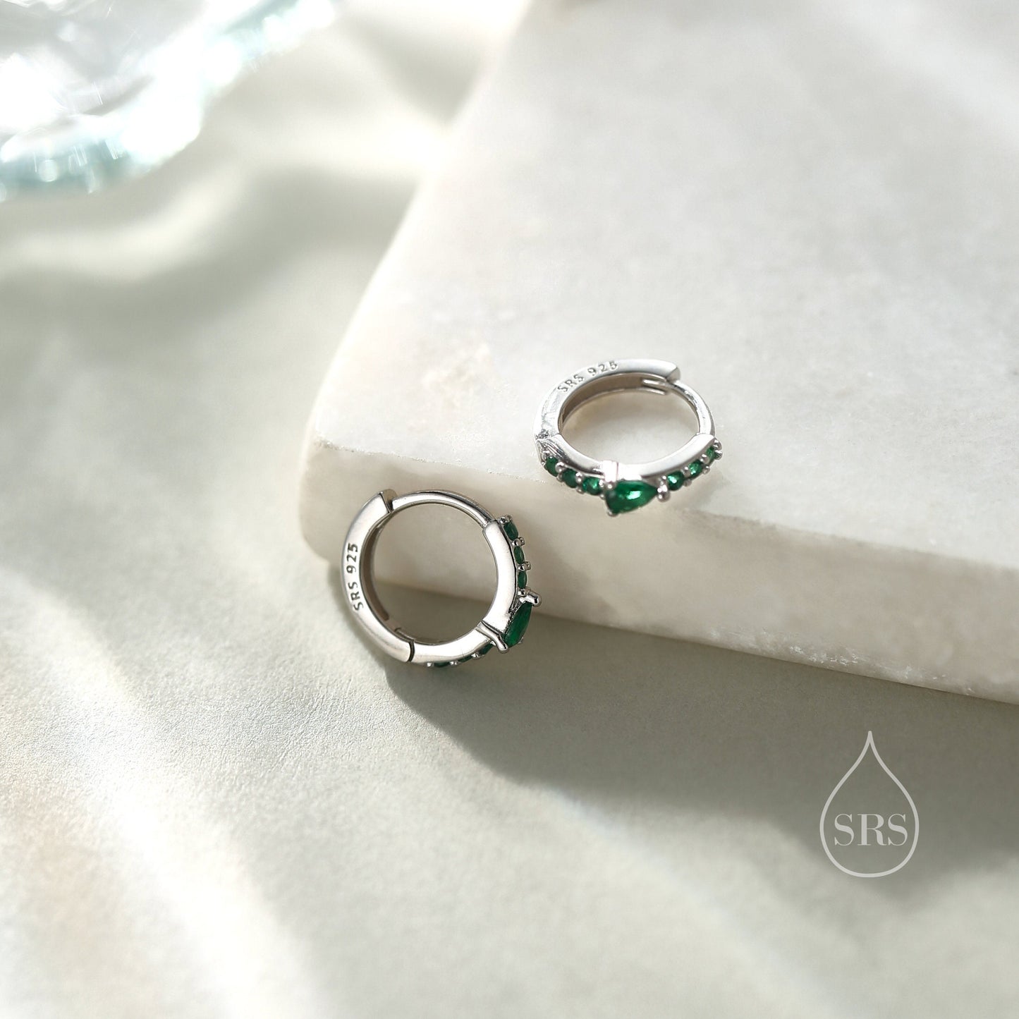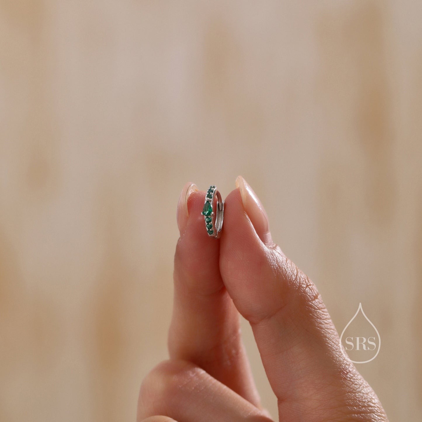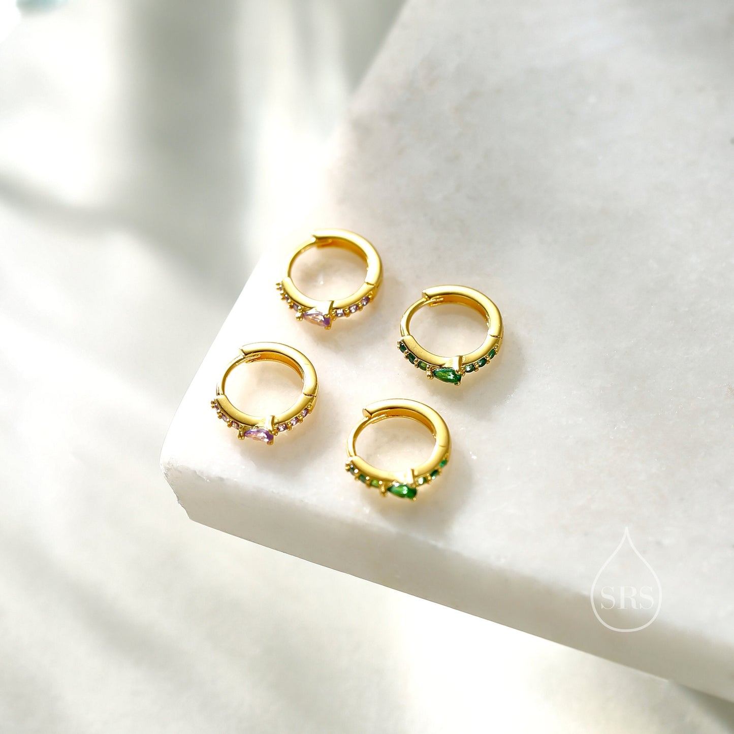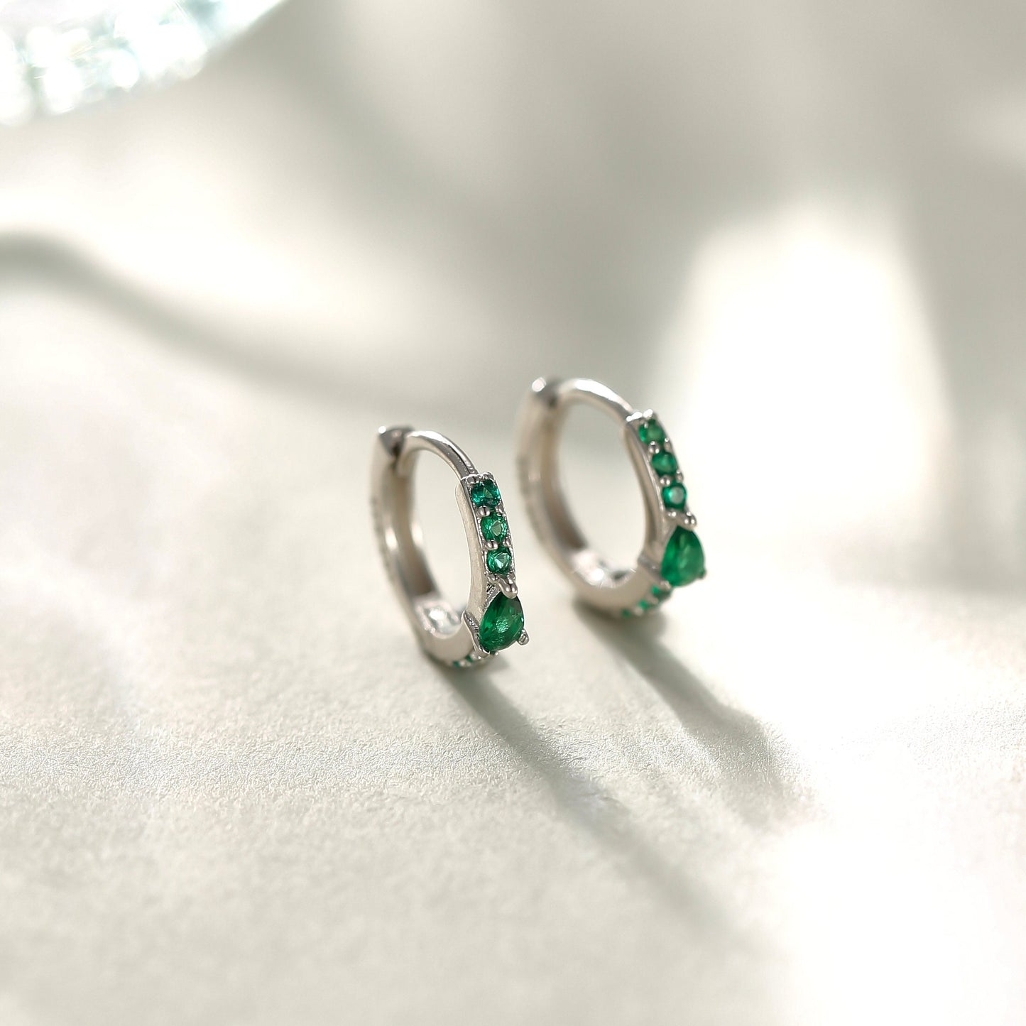 Dainty Green CZ Huggie Hoop Earrings in Sterling Silver with Pear CZ, Silver or Gold, Droplet CZ Hoops
